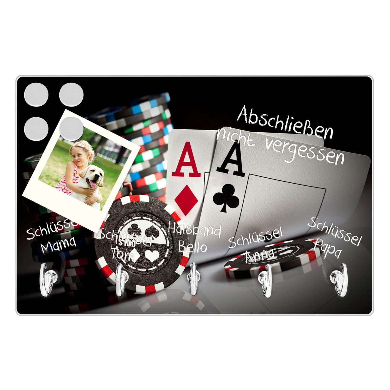 FUNKTION: Mit dem banjado Schlüsselbrett Poker hat Ihre Suche nach dem Schlüsselbund endlich ein Ende! Auf gesamt 5 Haken finden auch die größten Schlüssel ihren Platz. Durch den farbenfrohen Motivdruck ist das Schlüsselboard ein Blickfang in jeder Wohnung. DESIGN: Die Schlüsselleiste mit Motiv Poker hat ein sehr ansprechendes und ausgefallenes Design. Das Glasboard besteht aus einer gehärteten Glasscheibe mit dem Motiv Ihrer Wahl. Ihre neue Schlüsselaufbewahrung ist funktionell und ein optisches Highlight. DETAILS: Das Schlüsselbrett ist 30 x 20 x 4,5 CM (BxHxT). Das ganze Board besteht aus gehärtetem Sicherheitsglas, die Haken zur Selbstmontage präsentieren sich in Edelstahl-Optik. Für einen sicheren Halt erfolgt die Aufhängung an 2 vorgefertigten Haltern an der Rückseite. Das Montagematerial fügen wir bei. NUTZEN: Hier findet alles seinen Platz: Schlüsselbunde, Geschirrtücher, Hundeleinen oder Kinderjacken. Das Glas kann mit Kreidestiften bzw. Whiteboard-Marker beschrieben werden, mit extrastarken Neodym-Magneten können Sie auch Notizen anheften. BANJADO: Wir sind ein kleines Team aus dem Herzen von Sachsen und fertigen Ihre neue Schlüsselaufbewahrung von Hand an. Sie erhalten Handarbeit und keine preiswerte Importware. Wir hoffen, dass Ihnen unsere Idee zusagt, herzlichst das banjado Team.