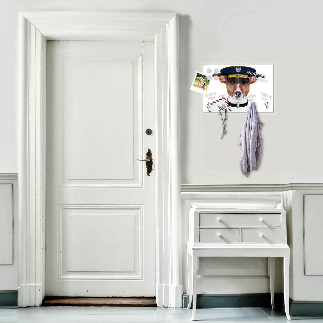 FUNKTION: Mit dem banjado Schlüsselbrett Postbote Jack Russel hat Ihre Suche nach dem Schlüsselbund endlich ein Ende! Auf gesamt 5 Haken finden auch die größten Schlüssel ihren Platz. Durch den farbenfrohen Motivdruck ist das Schlüsselboard ein Blickfang in jeder Wohnung. DESIGN: Die Schlüsselleiste mit Motiv Postbote Jack Russel hat ein sehr ansprechendes und ausgefallenes Design. Das Glasboard besteht aus einer gehärteten Glasscheibe mit dem Motiv Ihrer Wahl. Ihre neue Schlüsselaufbewahrung ist funktionell und ein optisches Highlight. DETAILS: Das Schlüsselbrett ist 30 x 20 x 4,5 CM (BxHxT). Das ganze Board besteht aus gehärtetem Sicherheitsglas, die Haken zur Selbstmontage präsentieren sich in Edelstahl-Optik. Für einen sicheren Halt erfolgt die Aufhängung an 2 vorgefertigten Haltern an der Rückseite. Das Montagematerial fügen wir bei. NUTZEN: Hier findet alles seinen Platz: Schlüsselbunde, Geschirrtücher, Hundeleinen oder Kinderjacken. Das Glas kann mit Kreidestiften bzw. Whiteboard-Marker beschrieben werden, mit extrastarken Neodym-Magneten können Sie auch Notizen anheften. BANJADO: Wir sind ein kleines Team aus dem Herzen von Sachsen und fertigen Ihre neue Schlüsselaufbewahrung von Hand an. Sie erhalten Handarbeit und keine preiswerte Importware. Wir hoffen, dass Ihnen unsere Idee zusagt, herzlichst das banjado Team.