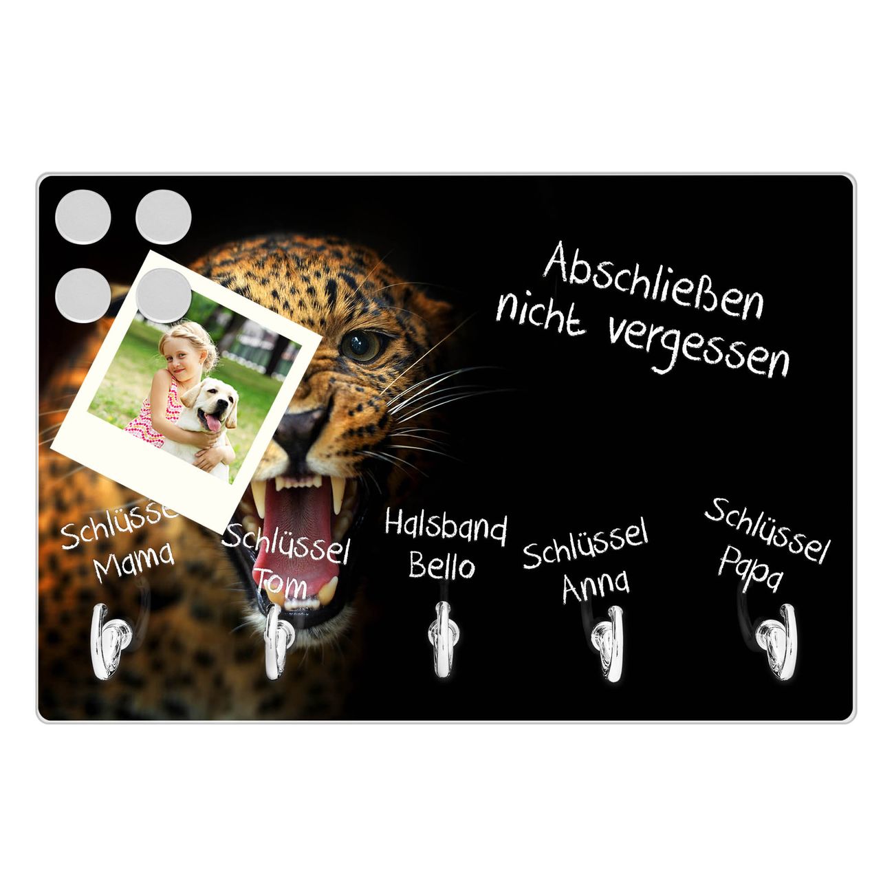 FUNKTION: Mit dem banjado Schlüsselbrett Raubkatze hat Ihre Suche nach dem Schlüsselbund endlich ein Ende! Auf gesamt 5 Haken finden auch die größten Schlüssel ihren Platz. Durch den farbenfrohen Motivdruck ist das Schlüsselboard ein Blickfang in jeder Wohnung. DESIGN: Die Schlüsselleiste mit Motiv Raubkatze hat ein sehr ansprechendes und ausgefallenes Design. Das Glasboard besteht aus einer gehärteten Glasscheibe mit dem Motiv Ihrer Wahl. Ihre neue Schlüsselaufbewahrung ist funktionell und ein optisches Highlight. DETAILS: Das Schlüsselbrett ist 30 x 20 x 4,5 CM (BxHxT). Das ganze Board besteht aus gehärtetem Sicherheitsglas, die Haken zur Selbstmontage präsentieren sich in Edelstahl-Optik. Für einen sicheren Halt erfolgt die Aufhängung an 2 vorgefertigten Haltern an der Rückseite. Das Montagematerial fügen wir bei. NUTZEN: Hier findet alles seinen Platz: Schlüsselbunde, Geschirrtücher, Hundeleinen oder Kinderjacken. Das Glas kann mit Kreidestiften bzw. Whiteboard-Marker beschrieben werden, mit extrastarken Neodym-Magneten können Sie auch Notizen anheften. BANJADO: Wir sind ein kleines Team aus dem Herzen von Sachsen und fertigen Ihre neue Schlüsselaufbewahrung von Hand an. Sie erhalten Handarbeit und keine preiswerte Importware. Wir hoffen, dass Ihnen unsere Idee zusagt, herzlichst das banjado Team.
