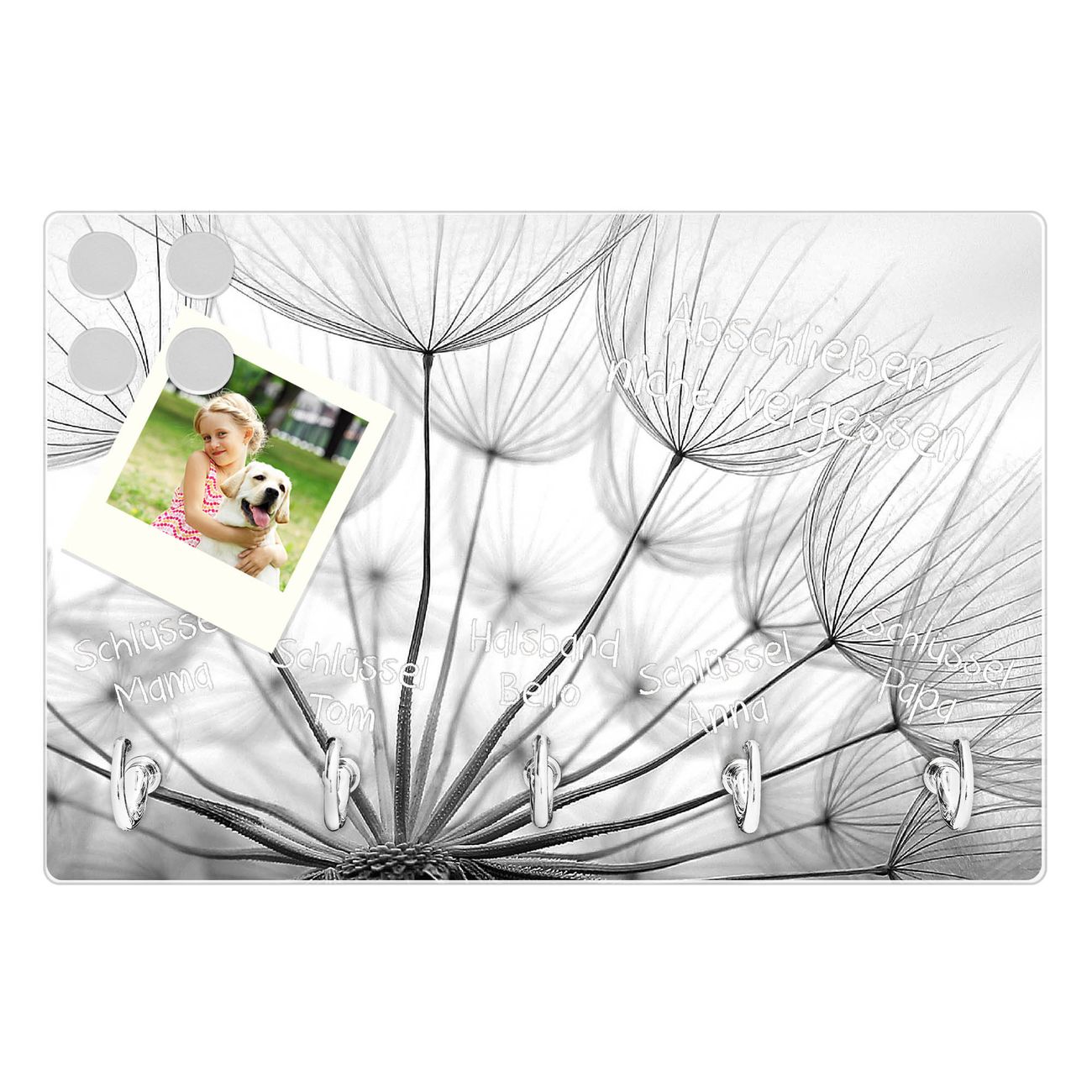 FUNKTION: Mit dem banjado Schlüsselbrett Ready For Takeoff hat Ihre Suche nach dem Schlüsselbund endlich ein Ende! Auf gesamt 5 Haken finden auch die größten Schlüssel ihren Platz. Durch den farbenfrohen Motivdruck ist das Schlüsselboard ein Blickfang in jeder Wohnung. DESIGN: Die Schlüsselleiste mit Motiv Ready For Takeoff hat ein sehr ansprechendes und ausgefallenes Design. Das Glasboard besteht aus einer gehärteten Glasscheibe mit dem Motiv Ihrer Wahl. Ihre neue Schlüsselaufbewahrung ist funktionell und ein optisches Highlight. DETAILS: Das Schlüsselbrett ist 30 x 20 x 4,5 CM (BxHxT). Das ganze Board besteht aus gehärtetem Sicherheitsglas, die Haken zur Selbstmontage präsentieren sich in Edelstahl-Optik. Für einen sicheren Halt erfolgt die Aufhängung an 2 vorgefertigten Haltern an der Rückseite. Das Montagematerial fügen wir bei. NUTZEN: Hier findet alles seinen Platz: Schlüsselbunde, Geschirrtücher, Hundeleinen oder Kinderjacken. Das Glas kann mit Kreidestiften bzw. Whiteboard-Marker beschrieben werden, mit extrastarken Neodym-Magneten können Sie auch Notizen anheften. BANJADO: Wir sind ein kleines Team aus dem Herzen von Sachsen und fertigen Ihre neue Schlüsselaufbewahrung von Hand an. Sie erhalten Handarbeit und keine preiswerte Importware. Wir hoffen, dass Ihnen unsere Idee zusagt, herzlichst das banjado Team.