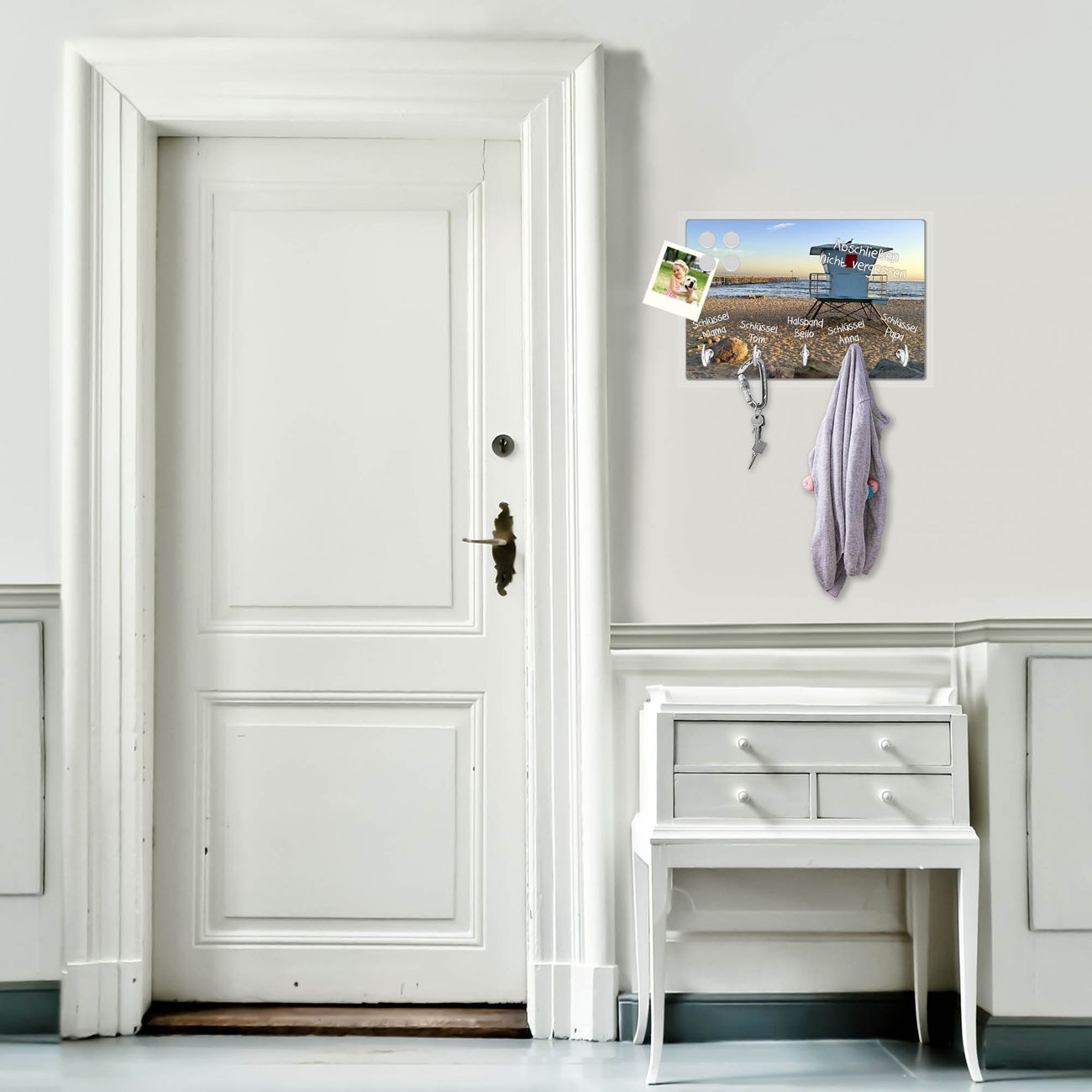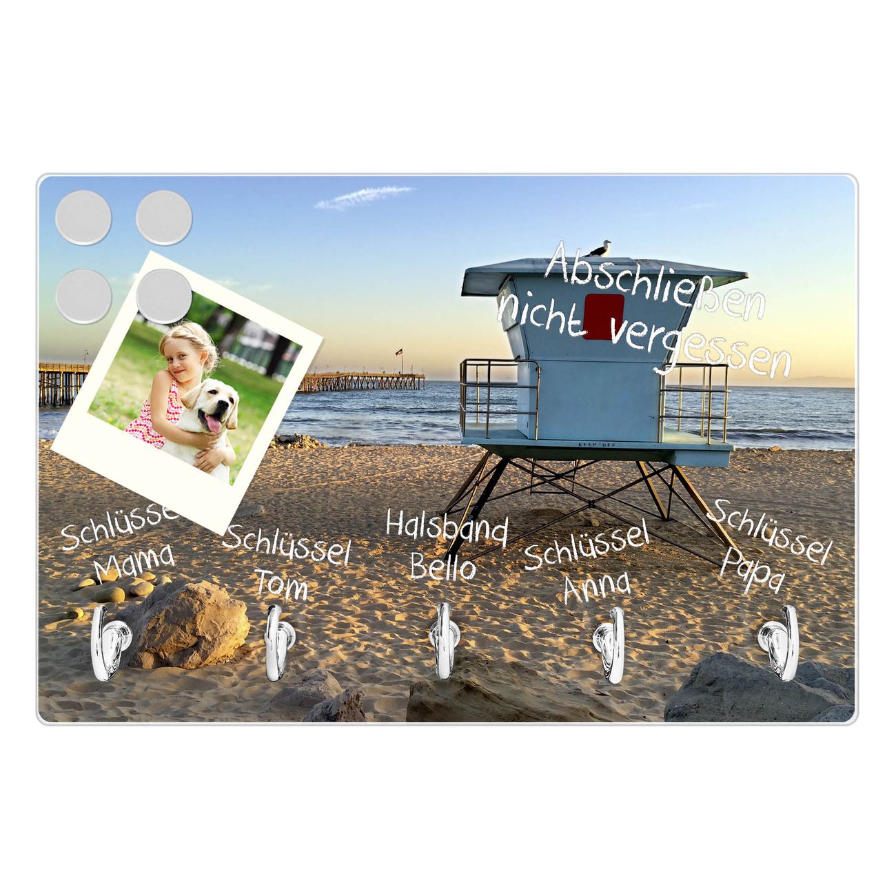 FUNKTION: Mit dem banjado Schlüsselbrett Rettungsturm hat Ihre Suche nach dem Schlüsselbund endlich ein Ende! Auf gesamt 5 Haken finden auch die größten Schlüssel ihren Platz. Durch den farbenfrohen Motivdruck ist das Schlüsselboard ein Blickfang in jeder Wohnung. DESIGN: Die Schlüsselleiste mit Motiv Rettungsturm hat ein sehr ansprechendes und ausgefallenes Design. Das Glasboard besteht aus einer gehärteten Glasscheibe mit dem Motiv Ihrer Wahl. Ihre neue Schlüsselaufbewahrung ist funktionell und ein optisches Highlight. DETAILS: Das Schlüsselbrett ist 30 x 20 x 4,5 CM (BxHxT). Das ganze Board besteht aus gehärtetem Sicherheitsglas, die Haken zur Selbstmontage präsentieren sich in Edelstahl-Optik. Für einen sicheren Halt erfolgt die Aufhängung an 2 vorgefertigten Haltern an der Rückseite. Das Montagematerial fügen wir bei. NUTZEN: Hier findet alles seinen Platz: Schlüsselbunde, Geschirrtücher, Hundeleinen oder Kinderjacken. Das Glas kann mit Kreidestiften bzw. Whiteboard-Marker beschrieben werden, mit extrastarken Neodym-Magneten können Sie auch Notizen anheften. BANJADO: Wir sind ein kleines Team aus dem Herzen von Sachsen und fertigen Ihre neue Schlüsselaufbewahrung von Hand an. Sie erhalten Handarbeit und keine preiswerte Importware. Wir hoffen, dass Ihnen unsere Idee zusagt, herzlichst das banjado Team.