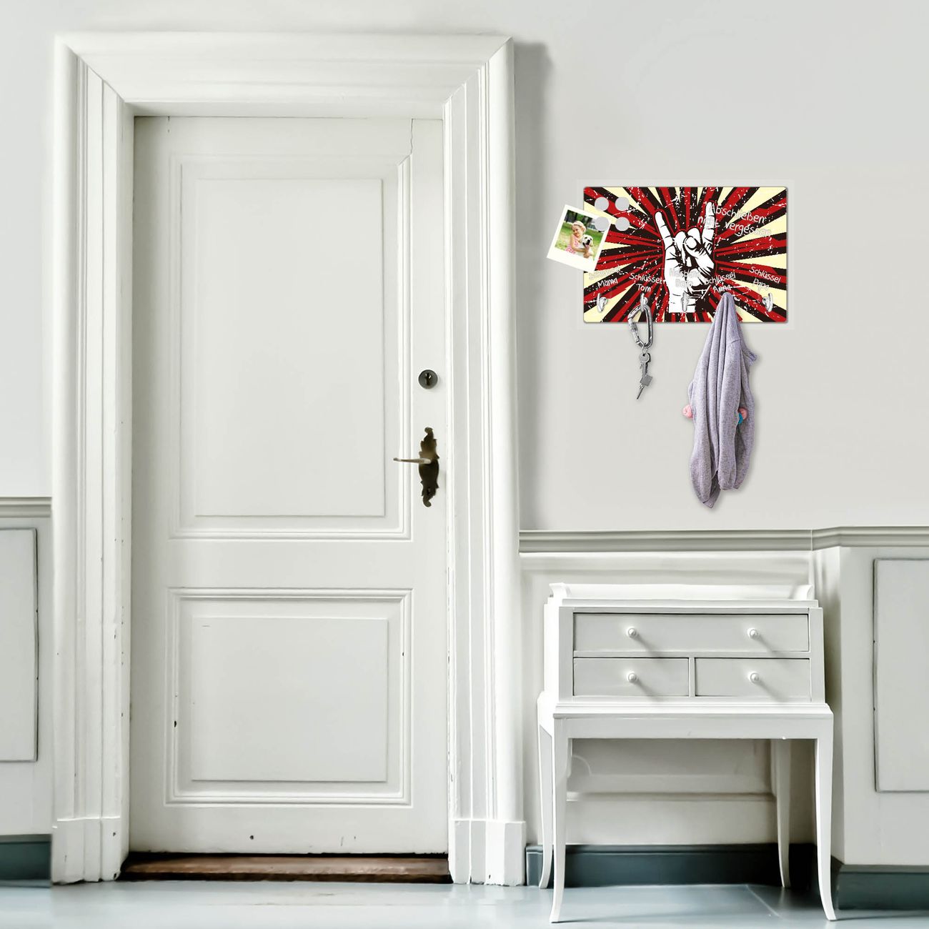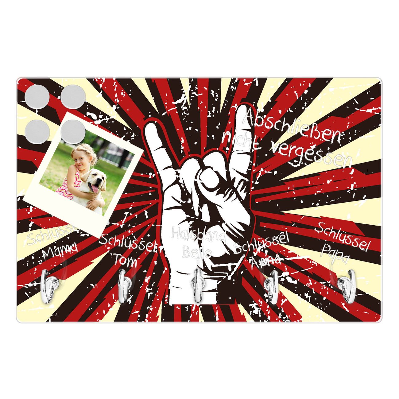 FUNKTION: Mit dem banjado Schlüsselbrett Rock On hat Ihre Suche nach dem Schlüsselbund endlich ein Ende! Auf gesamt 5 Haken finden auch die größten Schlüssel ihren Platz. Durch den farbenfrohen Motivdruck ist das Schlüsselboard ein Blickfang in jeder Wohnung. DESIGN: Die Schlüsselleiste mit Motiv Rock On hat ein sehr ansprechendes und ausgefallenes Design. Das Glasboard besteht aus einer gehärteten Glasscheibe mit dem Motiv Ihrer Wahl. Ihre neue Schlüsselaufbewahrung ist funktionell und ein optisches Highlight. DETAILS: Das Schlüsselbrett ist 30 x 20 x 4,5 CM (BxHxT). Das ganze Board besteht aus gehärtetem Sicherheitsglas, die Haken zur Selbstmontage präsentieren sich in Edelstahl-Optik. Für einen sicheren Halt erfolgt die Aufhängung an 2 vorgefertigten Haltern an der Rückseite. Das Montagematerial fügen wir bei. NUTZEN: Hier findet alles seinen Platz: Schlüsselbunde, Geschirrtücher, Hundeleinen oder Kinderjacken. Das Glas kann mit Kreidestiften bzw. Whiteboard-Marker beschrieben werden, mit extrastarken Neodym-Magneten können Sie auch Notizen anheften. BANJADO: Wir sind ein kleines Team aus dem Herzen von Sachsen und fertigen Ihre neue Schlüsselaufbewahrung von Hand an. Sie erhalten Handarbeit und keine preiswerte Importware. Wir hoffen, dass Ihnen unsere Idee zusagt, herzlichst das banjado Team.