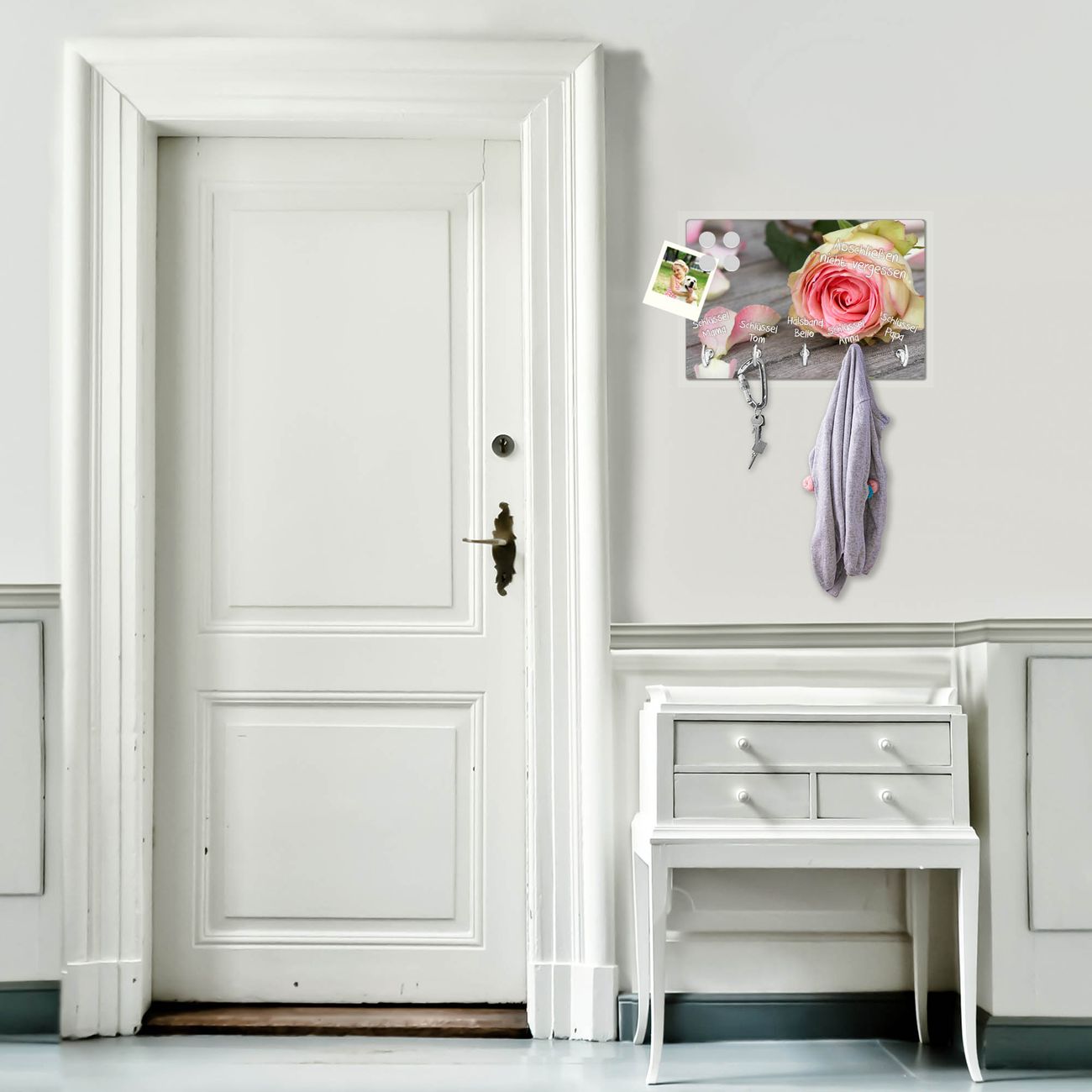FUNKTION: Mit dem banjado Schlüsselbrett Rosa Rose hat Ihre Suche nach dem Schlüsselbund endlich ein Ende! Auf gesamt 5 Haken finden auch die größten Schlüssel ihren Platz. Durch den farbenfrohen Motivdruck ist das Schlüsselboard ein Blickfang in jeder Wohnung. DESIGN: Die Schlüsselleiste mit Motiv Rosa Rose hat ein sehr ansprechendes und ausgefallenes Design. Das Glasboard besteht aus einer gehärteten Glasscheibe mit dem Motiv Ihrer Wahl. Ihre neue Schlüsselaufbewahrung ist funktionell und ein optisches Highlight. DETAILS: Das Schlüsselbrett ist 30 x 20 x 4,5 CM (BxHxT). Das ganze Board besteht aus gehärtetem Sicherheitsglas, die Haken zur Selbstmontage präsentieren sich in Edelstahl-Optik. Für einen sicheren Halt erfolgt die Aufhängung an 2 vorgefertigten Haltern an der Rückseite. Das Montagematerial fügen wir bei. NUTZEN: Hier findet alles seinen Platz: Schlüsselbunde, Geschirrtücher, Hundeleinen oder Kinderjacken. Das Glas kann mit Kreidestiften bzw. Whiteboard-Marker beschrieben werden, mit extrastarken Neodym-Magneten können Sie auch Notizen anheften. BANJADO: Wir sind ein kleines Team aus dem Herzen von Sachsen und fertigen Ihre neue Schlüsselaufbewahrung von Hand an. Sie erhalten Handarbeit und keine preiswerte Importware. Wir hoffen, dass Ihnen unsere Idee zusagt, herzlichst das banjado Team.