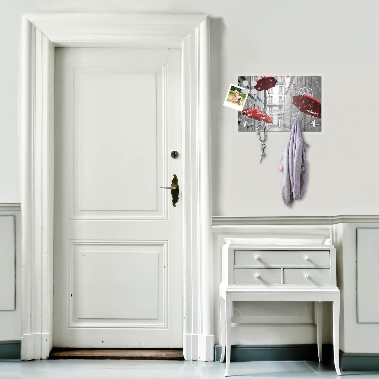 FUNKTION: Mit dem banjado Schlüsselbrett Rote Schirme hat Ihre Suche nach dem Schlüsselbund endlich ein Ende! Auf gesamt 5 Haken finden auch die größten Schlüssel ihren Platz. Durch den farbenfrohen Motivdruck ist das Schlüsselboard ein Blickfang in jeder Wohnung. DESIGN: Die Schlüsselleiste mit Motiv Rote Schirme hat ein sehr ansprechendes und ausgefallenes Design. Das Glasboard besteht aus einer gehärteten Glasscheibe mit dem Motiv Ihrer Wahl. Ihre neue Schlüsselaufbewahrung ist funktionell und ein optisches Highlight. DETAILS: Das Schlüsselbrett ist 30 x 20 x 4,5 CM (BxHxT). Das ganze Board besteht aus gehärtetem Sicherheitsglas, die Haken zur Selbstmontage präsentieren sich in Edelstahl-Optik. Für einen sicheren Halt erfolgt die Aufhängung an 2 vorgefertigten Haltern an der Rückseite. Das Montagematerial fügen wir bei. NUTZEN: Hier findet alles seinen Platz: Schlüsselbunde, Geschirrtücher, Hundeleinen oder Kinderjacken. Das Glas kann mit Kreidestiften bzw. Whiteboard-Marker beschrieben werden, mit extrastarken Neodym-Magneten können Sie auch Notizen anheften. BANJADO: Wir sind ein kleines Team aus dem Herzen von Sachsen und fertigen Ihre neue Schlüsselaufbewahrung von Hand an. Sie erhalten Handarbeit und keine preiswerte Importware. Wir hoffen, dass Ihnen unsere Idee zusagt, herzlichst das banjado Team.