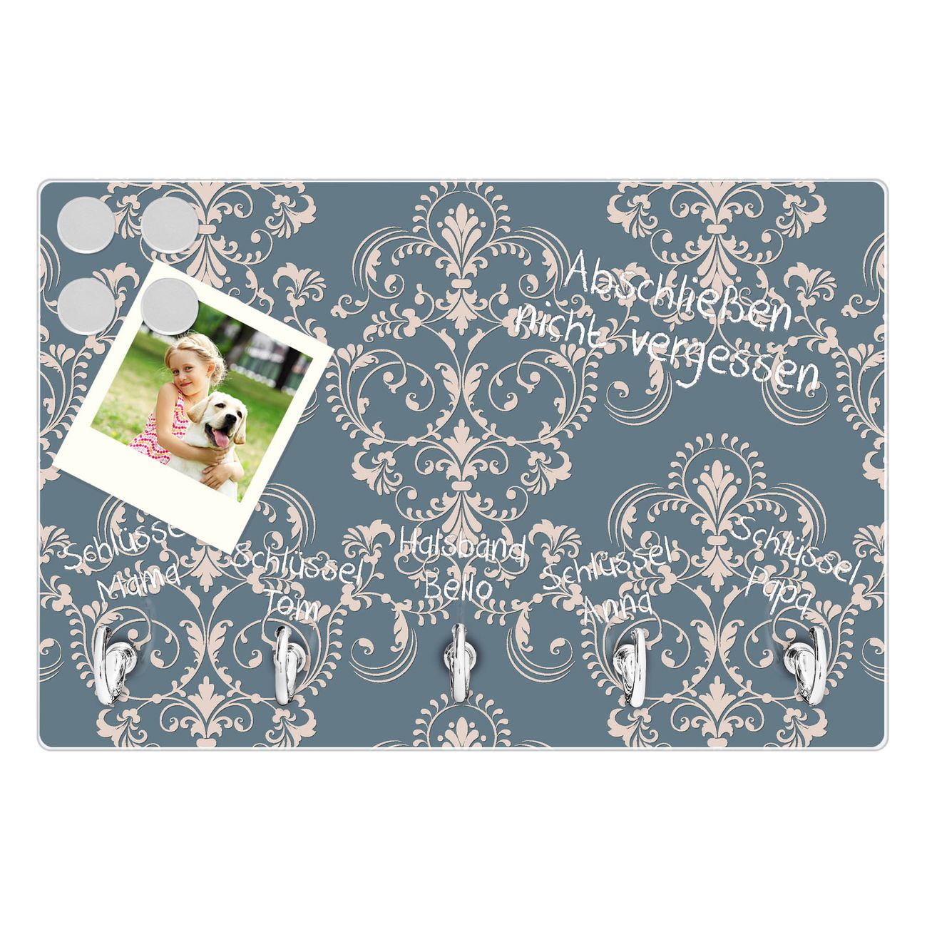 FUNKTION: Mit dem banjado Schlüsselbrett Royal Creme Blau hat Ihre Suche nach dem Schlüsselbund endlich ein Ende! Auf gesamt 5 Haken finden auch die größten Schlüssel ihren Platz. Durch den farbenfrohen Motivdruck ist das Schlüsselboard ein Blickfang in jeder Wohnung. DESIGN: Die Schlüsselleiste mit Motiv Royal Creme Blau hat ein sehr ansprechendes und ausgefallenes Design. Das Glasboard besteht aus einer gehärteten Glasscheibe mit dem Motiv Ihrer Wahl. Ihre neue Schlüsselaufbewahrung ist funktionell und ein optisches Highlight. DETAILS: Das Schlüsselbrett ist 30 x 20 x 4,5 CM (BxHxT). Das ganze Board besteht aus gehärtetem Sicherheitsglas, die Haken zur Selbstmontage präsentieren sich in Edelstahl-Optik. Für einen sicheren Halt erfolgt die Aufhängung an 2 vorgefertigten Haltern an der Rückseite. Das Montagematerial fügen wir bei. NUTZEN: Hier findet alles seinen Platz: Schlüsselbunde, Geschirrtücher, Hundeleinen oder Kinderjacken. Das Glas kann mit Kreidestiften bzw. Whiteboard-Marker beschrieben werden, mit extrastarken Neodym-Magneten können Sie auch Notizen anheften. BANJADO: Wir sind ein kleines Team aus dem Herzen von Sachsen und fertigen Ihre neue Schlüsselaufbewahrung von Hand an. Sie erhalten Handarbeit und keine preiswerte Importware. Wir hoffen, dass Ihnen unsere Idee zusagt, herzlichst das banjado Team.