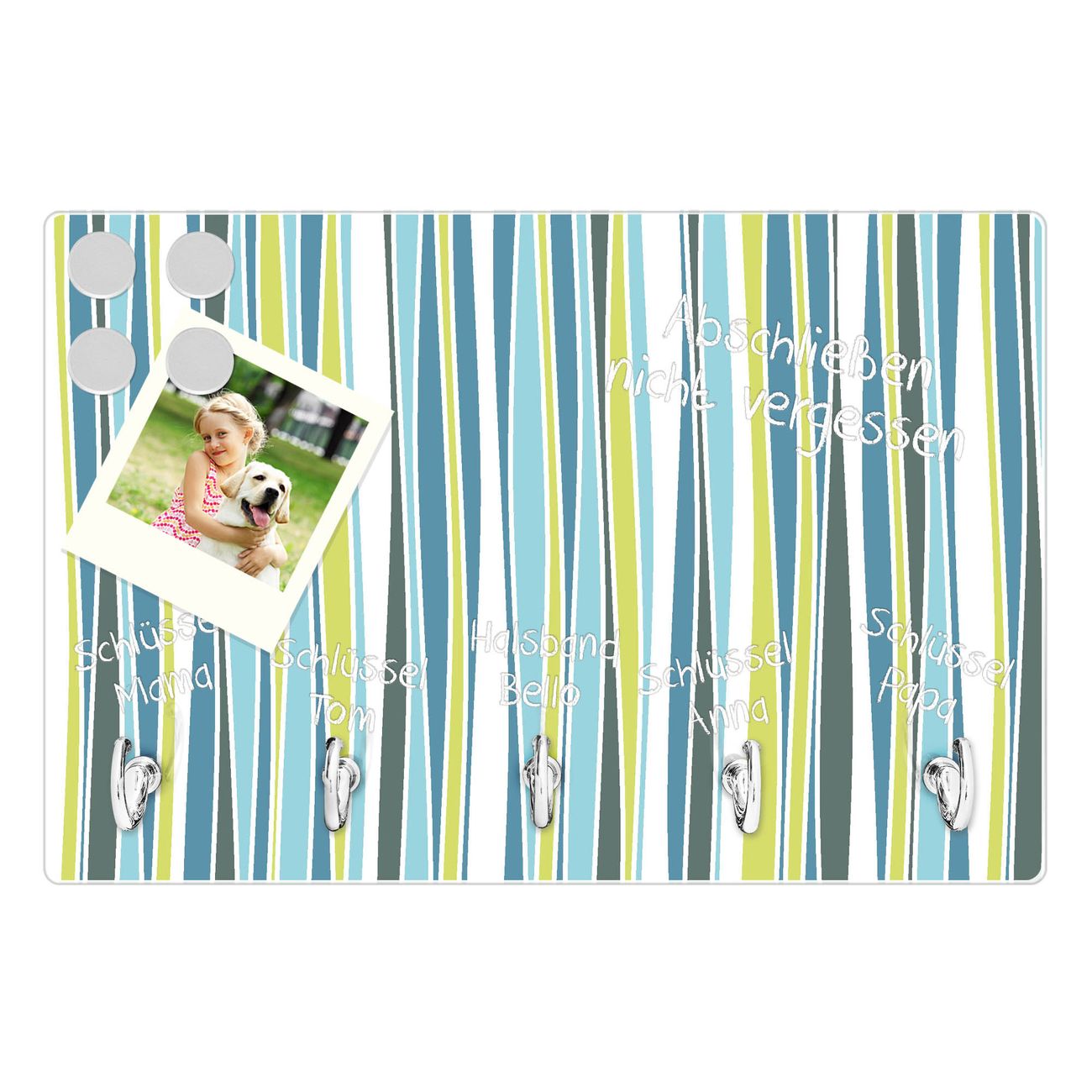 FUNKTION: Mit dem banjado Schlüsselbrett Schilf Abstrakt hat Ihre Suche nach dem Schlüsselbund endlich ein Ende! Auf gesamt 5 Haken finden auch die größten Schlüssel ihren Platz. Durch den farbenfrohen Motivdruck ist das Schlüsselboard ein Blickfang in jeder Wohnung. DESIGN: Die Schlüsselleiste mit Motiv Schilf Abstrakt hat ein sehr ansprechendes und ausgefallenes Design. Das Glasboard besteht aus einer gehärteten Glasscheibe mit dem Motiv Ihrer Wahl. Ihre neue Schlüsselaufbewahrung ist funktionell und ein optisches Highlight. DETAILS: Das Schlüsselbrett ist 30 x 20 x 4,5 CM (BxHxT). Das ganze Board besteht aus gehärtetem Sicherheitsglas, die Haken zur Selbstmontage präsentieren sich in Edelstahl-Optik. Für einen sicheren Halt erfolgt die Aufhängung an 2 vorgefertigten Haltern an der Rückseite. Das Montagematerial fügen wir bei. NUTZEN: Hier findet alles seinen Platz: Schlüsselbunde, Geschirrtücher, Hundeleinen oder Kinderjacken. Das Glas kann mit Kreidestiften bzw. Whiteboard-Marker beschrieben werden, mit extrastarken Neodym-Magneten können Sie auch Notizen anheften. BANJADO: Wir sind ein kleines Team aus dem Herzen von Sachsen und fertigen Ihre neue Schlüsselaufbewahrung von Hand an. Sie erhalten Handarbeit und keine preiswerte Importware. Wir hoffen, dass Ihnen unsere Idee zusagt, herzlichst das banjado Team.