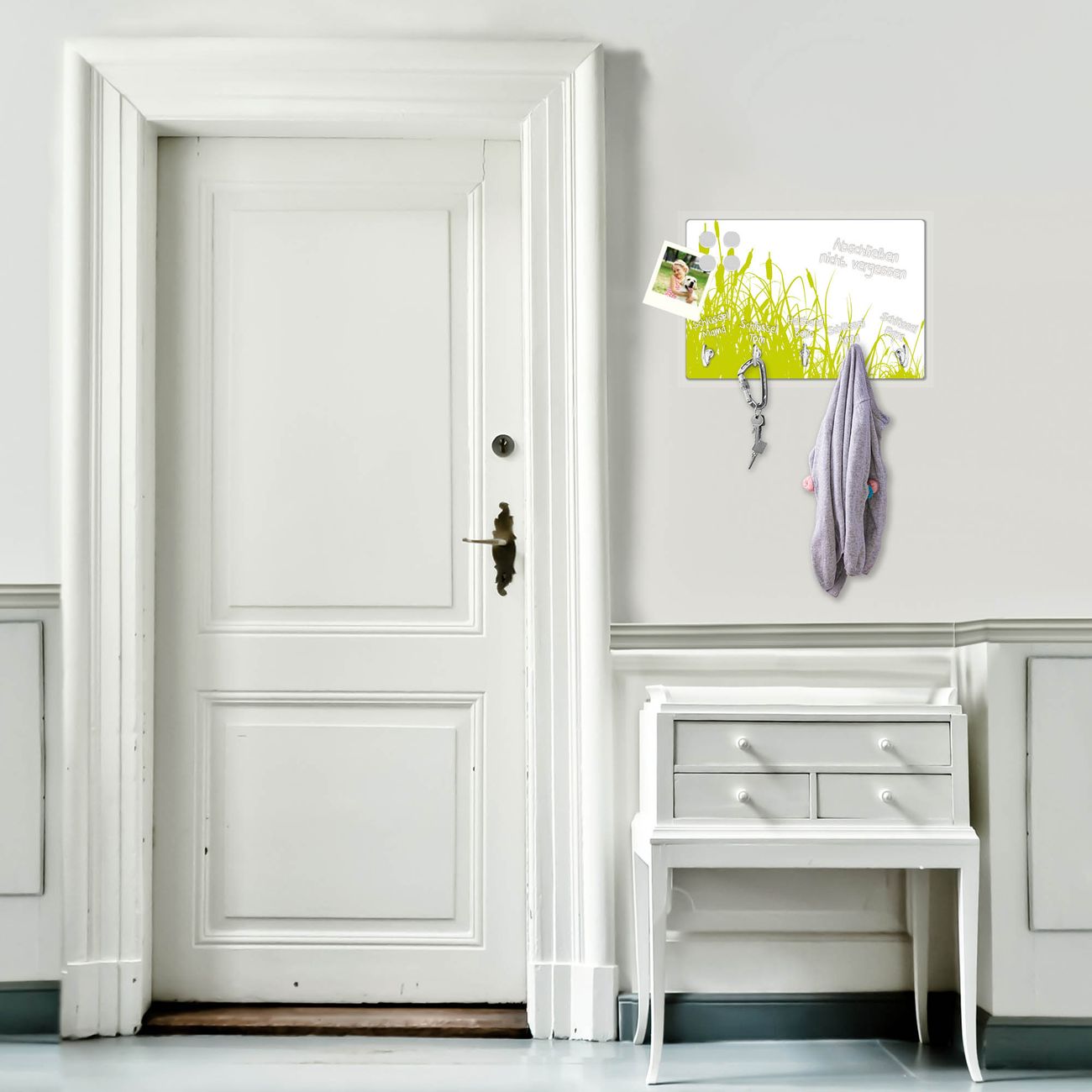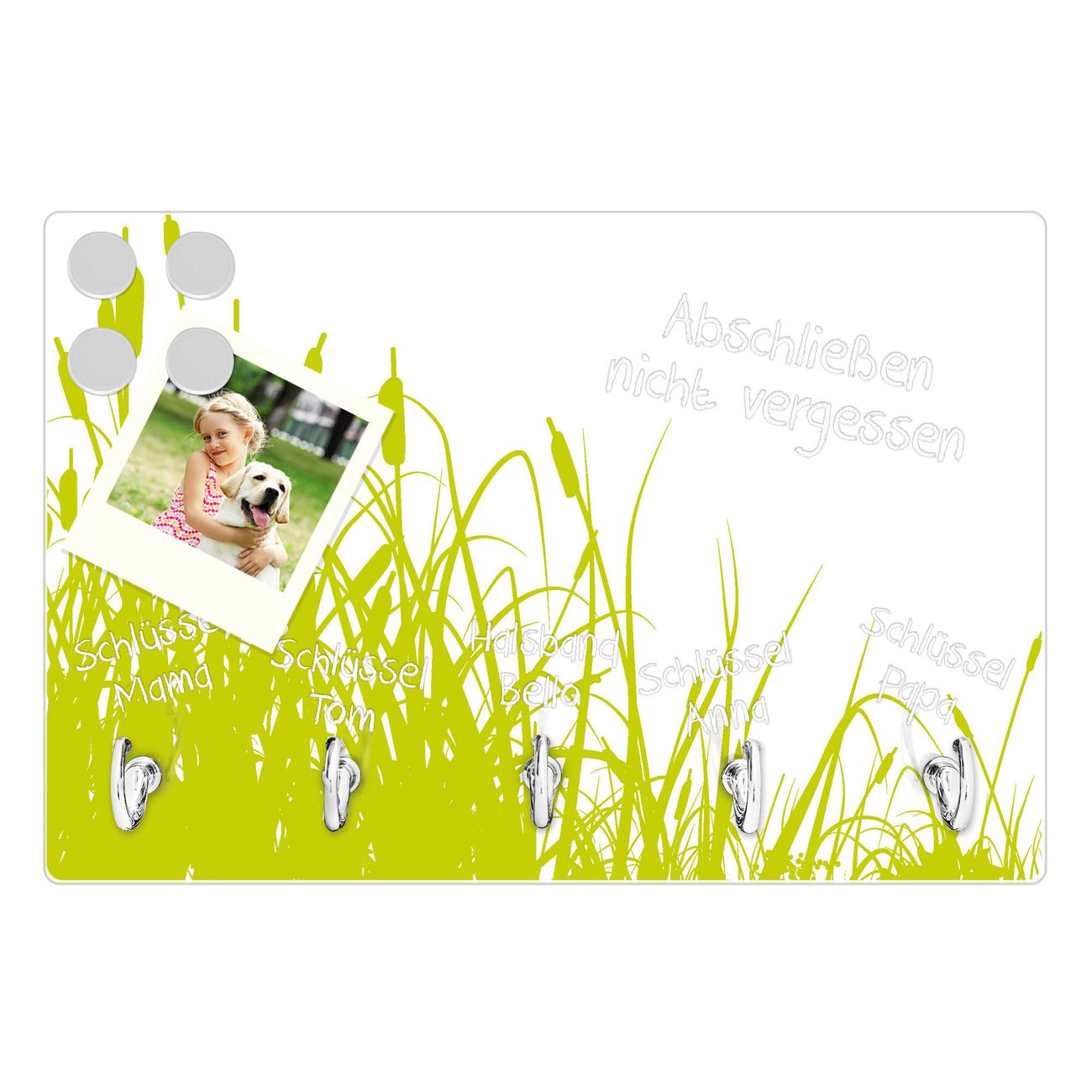FUNKTION: Mit dem banjado Schlüsselbrett Schilf hat Ihre Suche nach dem Schlüsselbund endlich ein Ende! Auf gesamt 5 Haken finden auch die größten Schlüssel ihren Platz. Durch den farbenfrohen Motivdruck ist das Schlüsselboard ein Blickfang in jeder Wohnung. DESIGN: Die Schlüsselleiste mit Motiv Schilf hat ein sehr ansprechendes und ausgefallenes Design. Das Glasboard besteht aus einer gehärteten Glasscheibe mit dem Motiv Ihrer Wahl. Ihre neue Schlüsselaufbewahrung ist funktionell und ein optisches Highlight. DETAILS: Das Schlüsselbrett ist 30 x 20 x 4,5 CM (BxHxT). Das ganze Board besteht aus gehärtetem Sicherheitsglas, die Haken zur Selbstmontage präsentieren sich in Edelstahl-Optik. Für einen sicheren Halt erfolgt die Aufhängung an 2 vorgefertigten Haltern an der Rückseite. Das Montagematerial fügen wir bei. NUTZEN: Hier findet alles seinen Platz: Schlüsselbunde, Geschirrtücher, Hundeleinen oder Kinderjacken. Das Glas kann mit Kreidestiften bzw. Whiteboard-Marker beschrieben werden, mit extrastarken Neodym-Magneten können Sie auch Notizen anheften. BANJADO: Wir sind ein kleines Team aus dem Herzen von Sachsen und fertigen Ihre neue Schlüsselaufbewahrung von Hand an. Sie erhalten Handarbeit und keine preiswerte Importware. Wir hoffen, dass Ihnen unsere Idee zusagt, herzlichst das banjado Team.