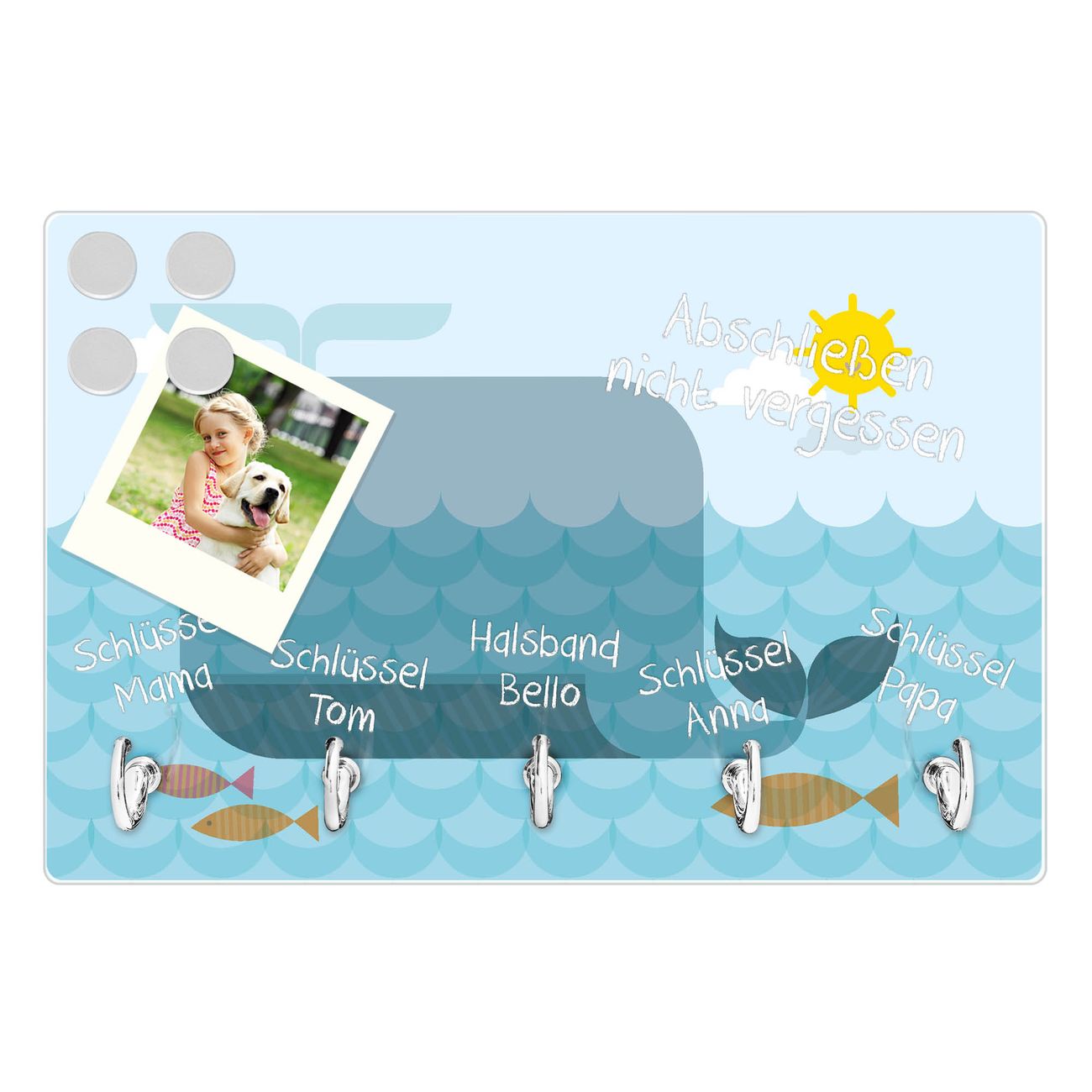 FUNKTION: Mit dem banjado Schlüsselbrett Schlafender Wal hat Ihre Suche nach dem Schlüsselbund endlich ein Ende! Auf gesamt 5 Haken finden auch die größten Schlüssel ihren Platz. Durch den farbenfrohen Motivdruck ist das Schlüsselboard ein Blickfang in jeder Wohnung. DESIGN: Die Schlüsselleiste mit Motiv Schlafender Wal hat ein sehr ansprechendes und ausgefallenes Design. Das Glasboard besteht aus einer gehärteten Glasscheibe mit dem Motiv Ihrer Wahl. Ihre neue Schlüsselaufbewahrung ist funktionell und ein optisches Highlight. DETAILS: Das Schlüsselbrett ist 30 x 20 x 4,5 CM (BxHxT). Das ganze Board besteht aus gehärtetem Sicherheitsglas, die Haken zur Selbstmontage präsentieren sich in Edelstahl-Optik. Für einen sicheren Halt erfolgt die Aufhängung an 2 vorgefertigten Haltern an der Rückseite. Das Montagematerial fügen wir bei. NUTZEN: Hier findet alles seinen Platz: Schlüsselbunde, Geschirrtücher, Hundeleinen oder Kinderjacken. Das Glas kann mit Kreidestiften bzw. Whiteboard-Marker beschrieben werden, mit extrastarken Neodym-Magneten können Sie auch Notizen anheften. BANJADO: Wir sind ein kleines Team aus dem Herzen von Sachsen und fertigen Ihre neue Schlüsselaufbewahrung von Hand an. Sie erhalten Handarbeit und keine preiswerte Importware. Wir hoffen, dass Ihnen unsere Idee zusagt, herzlichst das banjado Team.