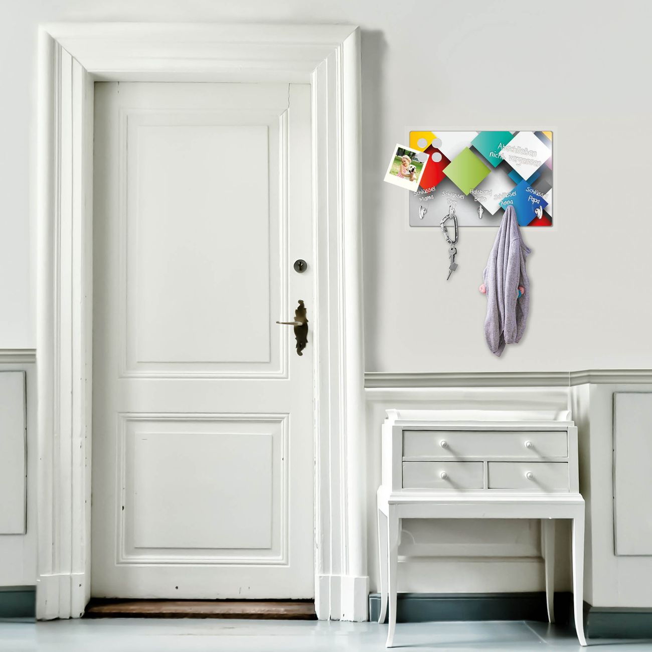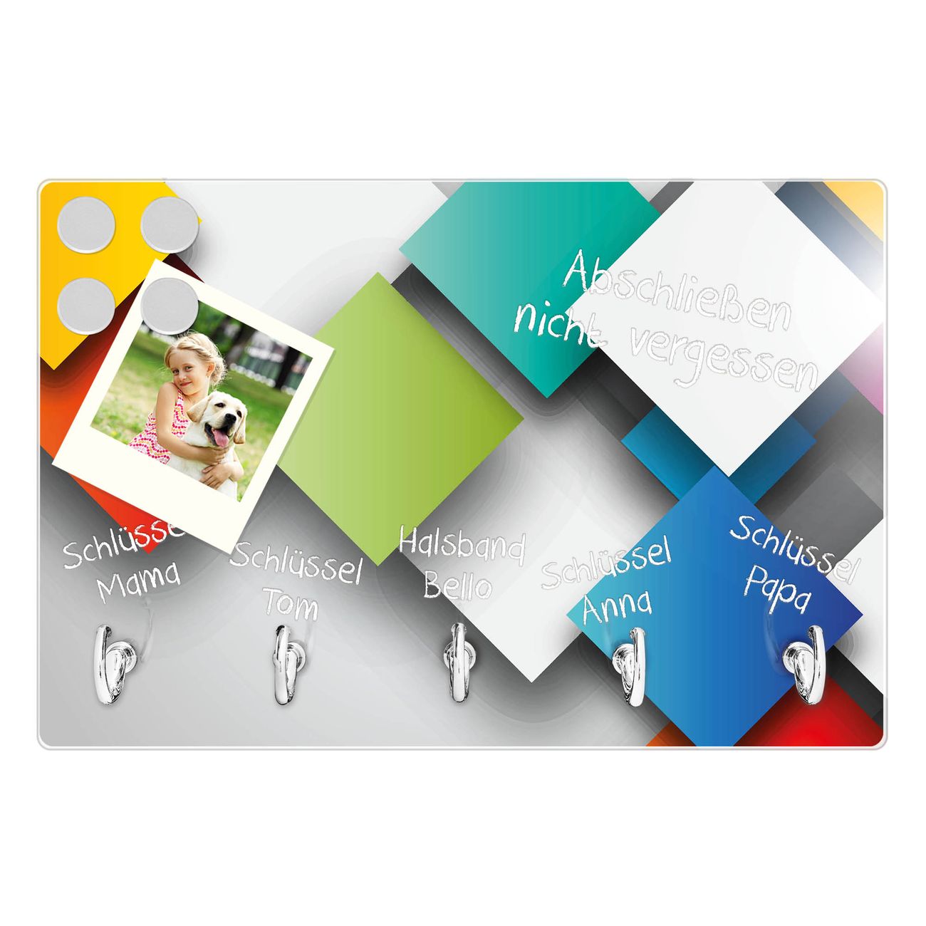 FUNKTION: Mit dem banjado Schlüsselbrett Schwebende Quadrate hat Ihre Suche nach dem Schlüsselbund endlich ein Ende! Auf gesamt 5 Haken finden auch die größten Schlüssel ihren Platz. Durch den farbenfrohen Motivdruck ist das Schlüsselboard ein Blickfang in jeder Wohnung. DESIGN: Die Schlüsselleiste mit Motiv Schwebende Quadrate hat ein sehr ansprechendes und ausgefallenes Design. Das Glasboard besteht aus einer gehärteten Glasscheibe mit dem Motiv Ihrer Wahl. Ihre neue Schlüsselaufbewahrung ist funktionell und ein optisches Highlight. DETAILS: Das Schlüsselbrett ist 30 x 20 x 4,5 CM (BxHxT). Das ganze Board besteht aus gehärtetem Sicherheitsglas, die Haken zur Selbstmontage präsentieren sich in Edelstahl-Optik. Für einen sicheren Halt erfolgt die Aufhängung an 2 vorgefertigten Haltern an der Rückseite. Das Montagematerial fügen wir bei. NUTZEN: Hier findet alles seinen Platz: Schlüsselbunde, Geschirrtücher, Hundeleinen oder Kinderjacken. Das Glas kann mit Kreidestiften bzw. Whiteboard-Marker beschrieben werden, mit extrastarken Neodym-Magneten können Sie auch Notizen anheften. BANJADO: Wir sind ein kleines Team aus dem Herzen von Sachsen und fertigen Ihre neue Schlüsselaufbewahrung von Hand an. Sie erhalten Handarbeit und keine preiswerte Importware. Wir hoffen, dass Ihnen unsere Idee zusagt, herzlichst das banjado Team.