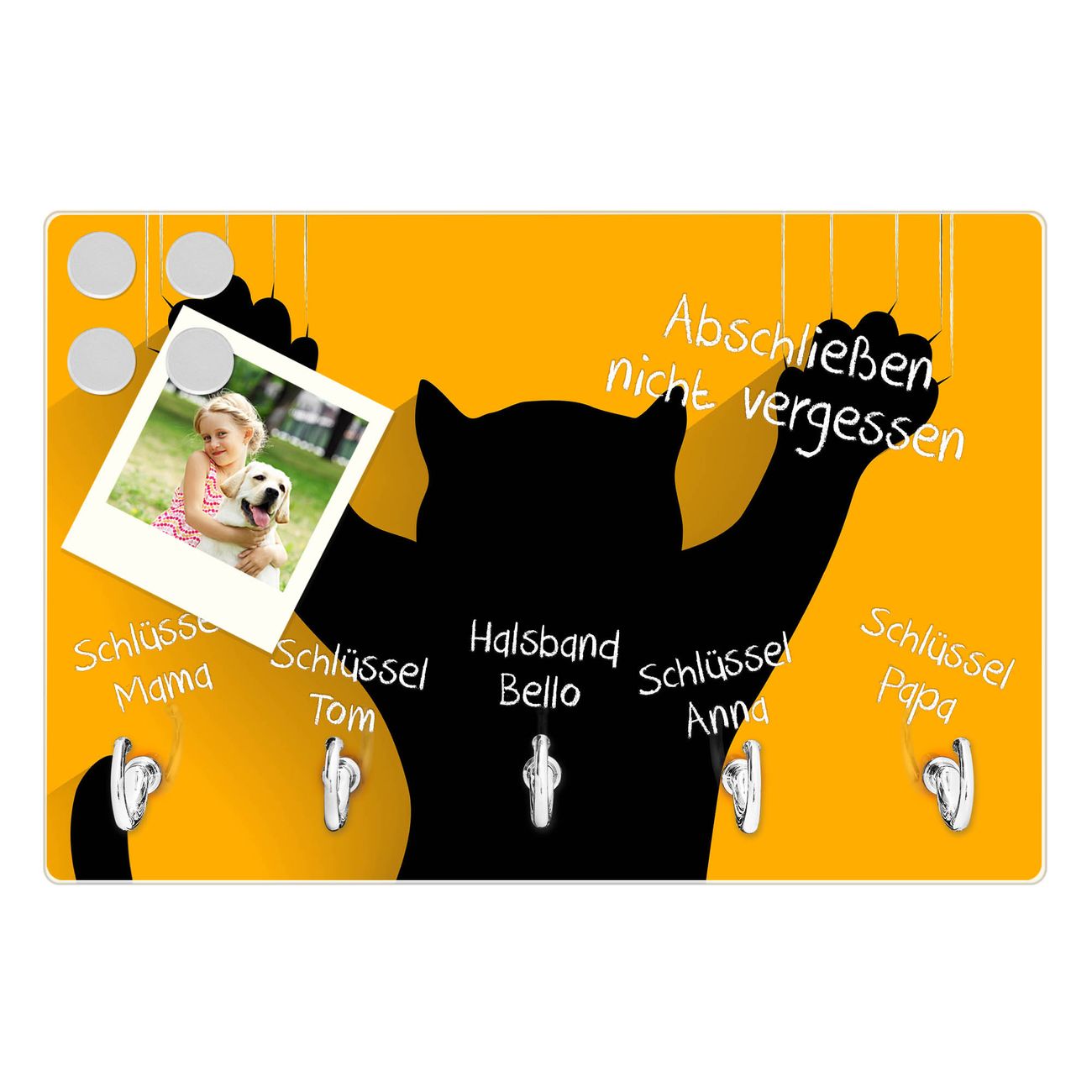 FUNKTION: Mit dem banjado Schlüsselbrett Scratch hat Ihre Suche nach dem Schlüsselbund endlich ein Ende! Auf gesamt 5 Haken finden auch die größten Schlüssel ihren Platz. Durch den farbenfrohen Motivdruck ist das Schlüsselboard ein Blickfang in jeder Wohnung. DESIGN: Die Schlüsselleiste mit Motiv Scratch hat ein sehr ansprechendes und ausgefallenes Design. Das Glasboard besteht aus einer gehärteten Glasscheibe mit dem Motiv Ihrer Wahl. Ihre neue Schlüsselaufbewahrung ist funktionell und ein optisches Highlight. DETAILS: Das Schlüsselbrett ist 30 x 20 x 4,5 CM (BxHxT). Das ganze Board besteht aus gehärtetem Sicherheitsglas, die Haken zur Selbstmontage präsentieren sich in Edelstahl-Optik. Für einen sicheren Halt erfolgt die Aufhängung an 2 vorgefertigten Haltern an der Rückseite. Das Montagematerial fügen wir bei. NUTZEN: Hier findet alles seinen Platz: Schlüsselbunde, Geschirrtücher, Hundeleinen oder Kinderjacken. Das Glas kann mit Kreidestiften bzw. Whiteboard-Marker beschrieben werden, mit extrastarken Neodym-Magneten können Sie auch Notizen anheften. BANJADO: Wir sind ein kleines Team aus dem Herzen von Sachsen und fertigen Ihre neue Schlüsselaufbewahrung von Hand an. Sie erhalten Handarbeit und keine preiswerte Importware. Wir hoffen, dass Ihnen unsere Idee zusagt, herzlichst das banjado Team.