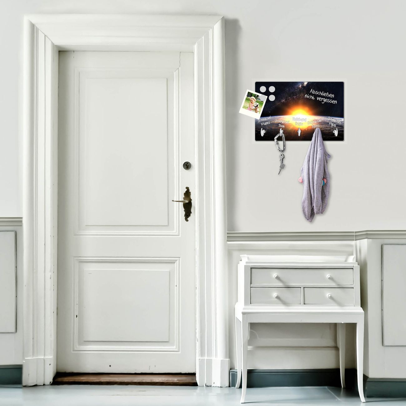 FUNKTION: Mit dem banjado Schlüsselbrett Sonne im Weltall hat Ihre Suche nach dem Schlüsselbund endlich ein Ende! Auf gesamt 5 Haken finden auch die größten Schlüssel ihren Platz. Durch den farbenfrohen Motivdruck ist das Schlüsselboard ein Blickfang in jeder Wohnung. DESIGN: Die Schlüsselleiste mit Motiv Sonne im Weltall hat ein sehr ansprechendes und ausgefallenes Design. Das Glasboard besteht aus einer gehärteten Glasscheibe mit dem Motiv Ihrer Wahl. Ihre neue Schlüsselaufbewahrung ist funktionell und ein optisches Highlight. DETAILS: Das Schlüsselbrett ist 30 x 20 x 4,5 CM (BxHxT). Das ganze Board besteht aus gehärtetem Sicherheitsglas, die Haken zur Selbstmontage präsentieren sich in Edelstahl-Optik. Für einen sicheren Halt erfolgt die Aufhängung an 2 vorgefertigten Haltern an der Rückseite. Das Montagematerial fügen wir bei. NUTZEN: Hier findet alles seinen Platz: Schlüsselbunde, Geschirrtücher, Hundeleinen oder Kinderjacken. Das Glas kann mit Kreidestiften bzw. Whiteboard-Marker beschrieben werden, mit extrastarken Neodym-Magneten können Sie auch Notizen anheften. BANJADO: Wir sind ein kleines Team aus dem Herzen von Sachsen und fertigen Ihre neue Schlüsselaufbewahrung von Hand an. Sie erhalten Handarbeit und keine preiswerte Importware. Wir hoffen, dass Ihnen unsere Idee zusagt, herzlichst das banjado Team.
