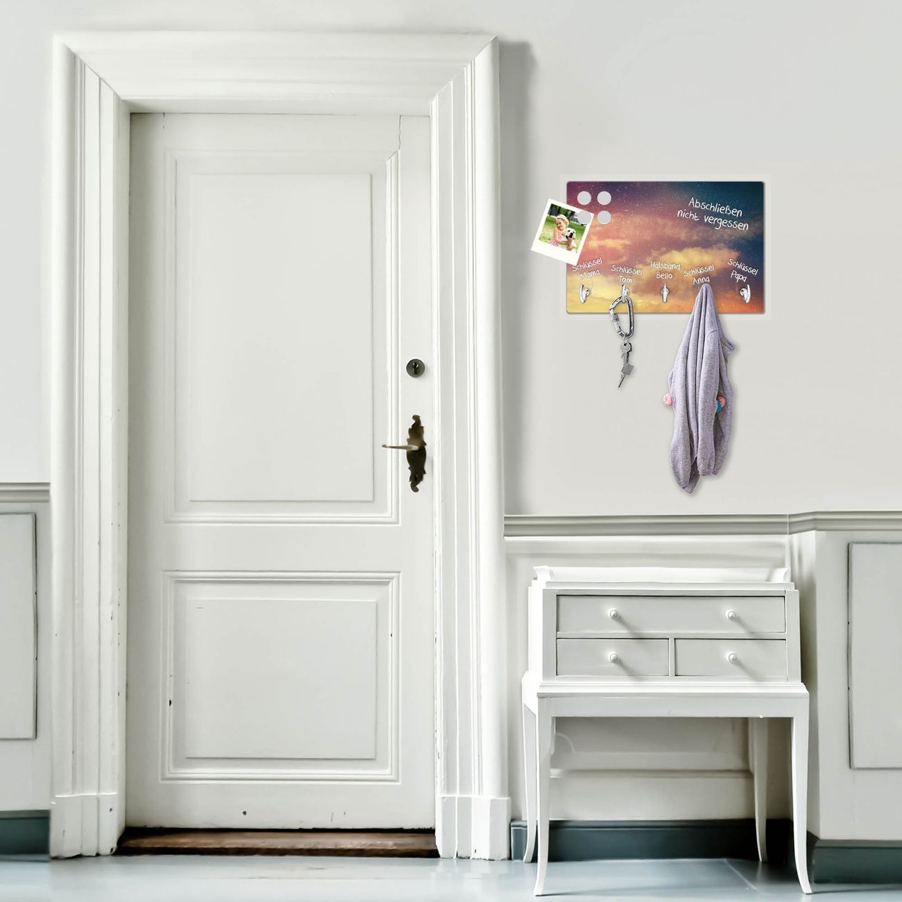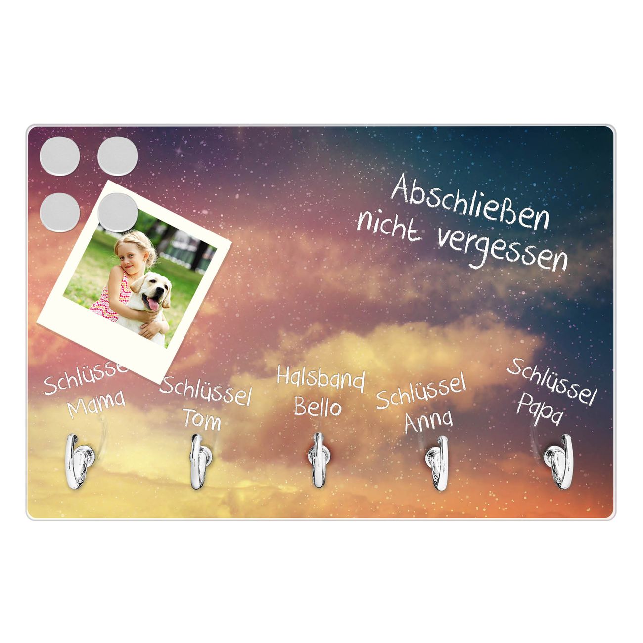 FUNKTION: Mit dem banjado Schlüsselbrett Sternenhimmel hat Ihre Suche nach dem Schlüsselbund endlich ein Ende! Auf gesamt 5 Haken finden auch die größten Schlüssel ihren Platz. Durch den farbenfrohen Motivdruck ist das Schlüsselboard ein Blickfang in jeder Wohnung. DESIGN: Die Schlüsselleiste mit Motiv Sternenhimmel hat ein sehr ansprechendes und ausgefallenes Design. Das Glasboard besteht aus einer gehärteten Glasscheibe mit dem Motiv Ihrer Wahl. Ihre neue Schlüsselaufbewahrung ist funktionell und ein optisches Highlight. DETAILS: Das Schlüsselbrett ist 30 x 20 x 4,5 CM (BxHxT). Das ganze Board besteht aus gehärtetem Sicherheitsglas, die Haken zur Selbstmontage präsentieren sich in Edelstahl-Optik. Für einen sicheren Halt erfolgt die Aufhängung an 2 vorgefertigten Haltern an der Rückseite. Das Montagematerial fügen wir bei. NUTZEN: Hier findet alles seinen Platz: Schlüsselbunde, Geschirrtücher, Hundeleinen oder Kinderjacken. Das Glas kann mit Kreidestiften bzw. Whiteboard-Marker beschrieben werden, mit extrastarken Neodym-Magneten können Sie auch Notizen anheften. BANJADO: Wir sind ein kleines Team aus dem Herzen von Sachsen und fertigen Ihre neue Schlüsselaufbewahrung von Hand an. Sie erhalten Handarbeit und keine preiswerte Importware. Wir hoffen, dass Ihnen unsere Idee zusagt, herzlichst das banjado Team.