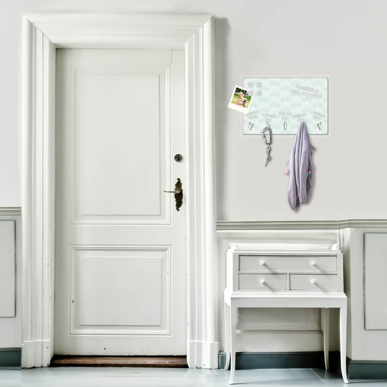 FUNKTION: Mit dem banjado Schlüsselbrett Strahlen Mint hat Ihre Suche nach dem Schlüsselbund endlich ein Ende! Auf gesamt 5 Haken finden auch die größten Schlüssel ihren Platz. Durch den farbenfrohen Motivdruck ist das Schlüsselboard ein Blickfang in jeder Wohnung. DESIGN: Die Schlüsselleiste mit Motiv Strahlen Mint hat ein sehr ansprechendes und ausgefallenes Design. Das Glasboard besteht aus einer gehärteten Glasscheibe mit dem Motiv Ihrer Wahl. Ihre neue Schlüsselaufbewahrung ist funktionell und ein optisches Highlight. DETAILS: Das Schlüsselbrett ist 30 x 20 x 4,5 CM (BxHxT). Das ganze Board besteht aus gehärtetem Sicherheitsglas, die Haken zur Selbstmontage präsentieren sich in Edelstahl-Optik. Für einen sicheren Halt erfolgt die Aufhängung an 2 vorgefertigten Haltern an der Rückseite. Das Montagematerial fügen wir bei. NUTZEN: Hier findet alles seinen Platz: Schlüsselbunde, Geschirrtücher, Hundeleinen oder Kinderjacken. Das Glas kann mit Kreidestiften bzw. Whiteboard-Marker beschrieben werden, mit extrastarken Neodym-Magneten können Sie auch Notizen anheften. BANJADO: Wir sind ein kleines Team aus dem Herzen von Sachsen und fertigen Ihre neue Schlüsselaufbewahrung von Hand an. Sie erhalten Handarbeit und keine preiswerte Importware. Wir hoffen, dass Ihnen unsere Idee zusagt, herzlichst das banjado Team.