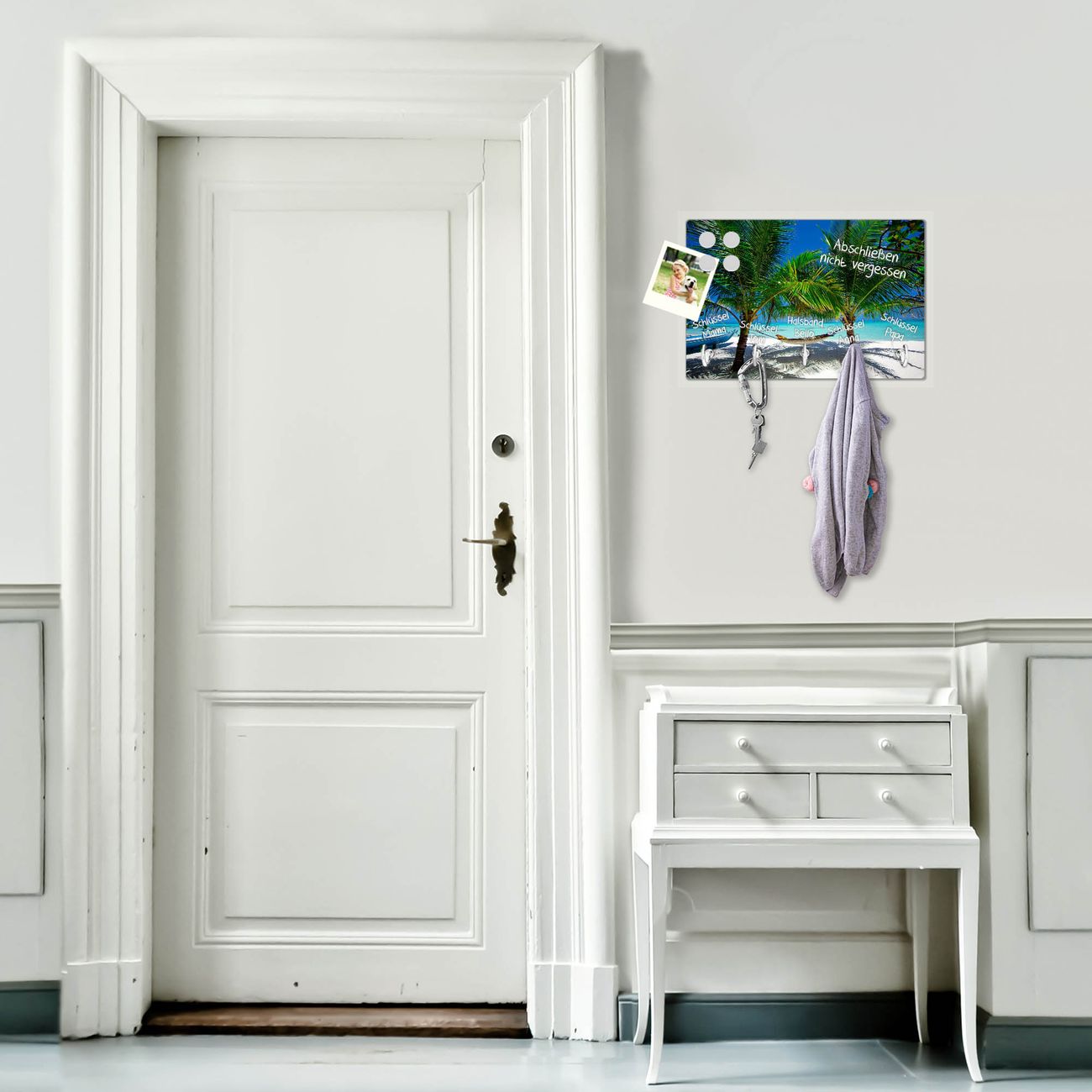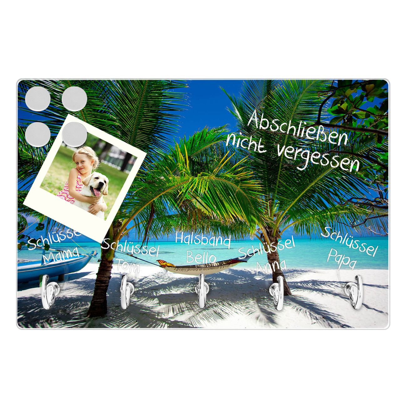 FUNKTION: Mit dem banjado Schlüsselbrett Strand hat Ihre Suche nach dem Schlüsselbund endlich ein Ende! Auf gesamt 5 Haken finden auch die größten Schlüssel ihren Platz. Durch den farbenfrohen Motivdruck ist das Schlüsselboard ein Blickfang in jeder Wohnung. DESIGN: Die Schlüsselleiste mit Motiv Strand hat ein sehr ansprechendes und ausgefallenes Design. Das Glasboard besteht aus einer gehärteten Glasscheibe mit dem Motiv Ihrer Wahl. Ihre neue Schlüsselaufbewahrung ist funktionell und ein optisches Highlight. DETAILS: Das Schlüsselbrett ist 30 x 20 x 4,5 CM (BxHxT). Das ganze Board besteht aus gehärtetem Sicherheitsglas, die Haken zur Selbstmontage präsentieren sich in Edelstahl-Optik. Für einen sicheren Halt erfolgt die Aufhängung an 2 vorgefertigten Haltern an der Rückseite. Das Montagematerial fügen wir bei. NUTZEN: Hier findet alles seinen Platz: Schlüsselbunde, Geschirrtücher, Hundeleinen oder Kinderjacken. Das Glas kann mit Kreidestiften bzw. Whiteboard-Marker beschrieben werden, mit extrastarken Neodym-Magneten können Sie auch Notizen anheften. BANJADO: Wir sind ein kleines Team aus dem Herzen von Sachsen und fertigen Ihre neue Schlüsselaufbewahrung von Hand an. Sie erhalten Handarbeit und keine preiswerte Importware. Wir hoffen, dass Ihnen unsere Idee zusagt, herzlichst das banjado Team.