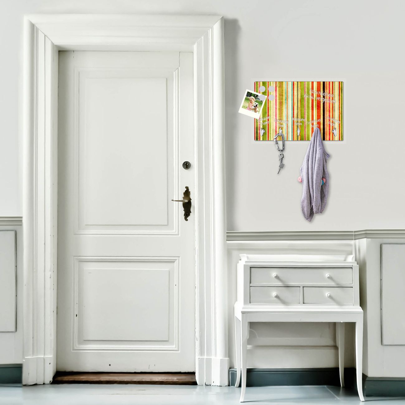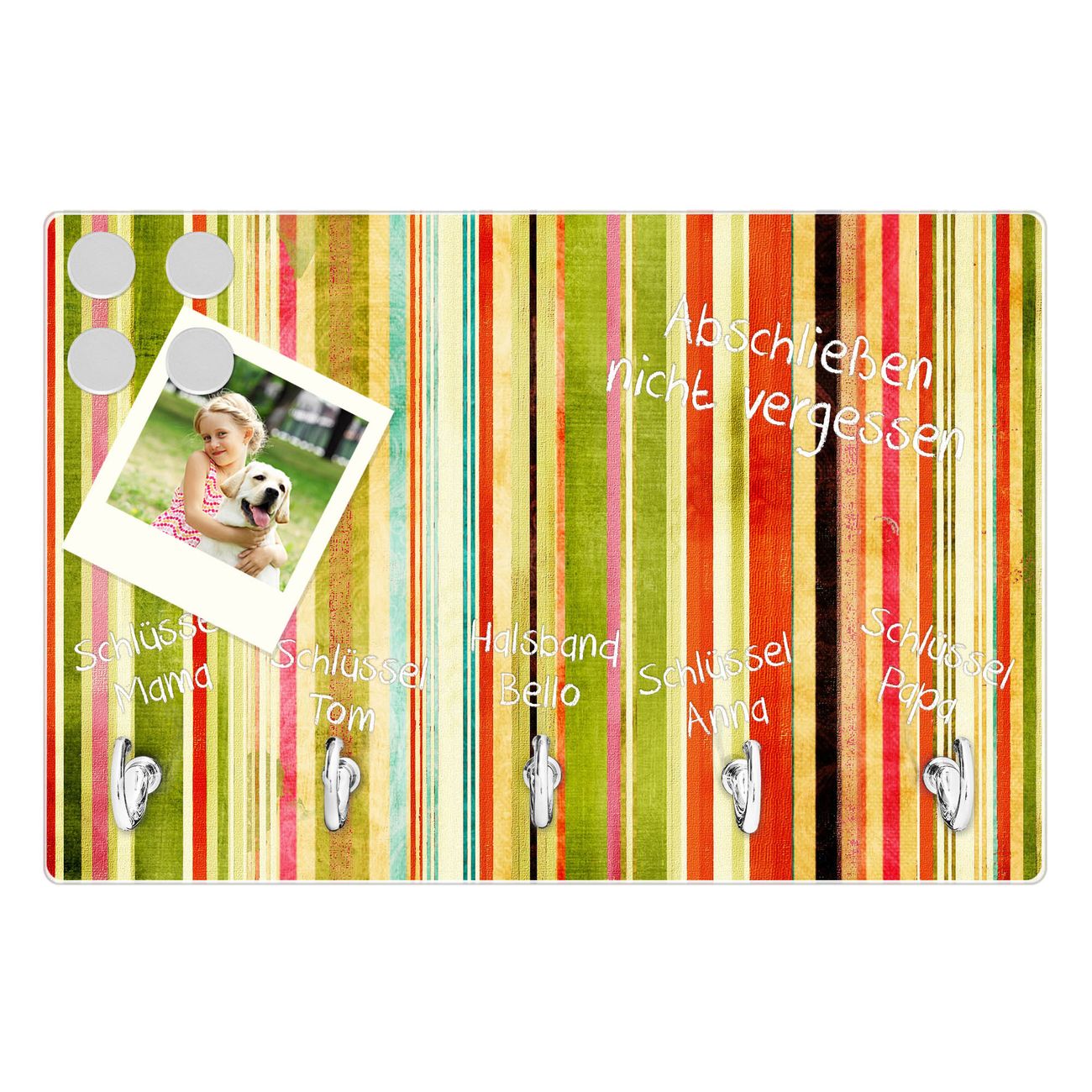 FUNKTION: Mit dem banjado Schlüsselbrett Streifen hat Ihre Suche nach dem Schlüsselbund endlich ein Ende! Auf gesamt 5 Haken finden auch die größten Schlüssel ihren Platz. Durch den farbenfrohen Motivdruck ist das Schlüsselboard ein Blickfang in jeder Wohnung. DESIGN: Die Schlüsselleiste mit Motiv Streifen hat ein sehr ansprechendes und ausgefallenes Design. Das Glasboard besteht aus einer gehärteten Glasscheibe mit dem Motiv Ihrer Wahl. Ihre neue Schlüsselaufbewahrung ist funktionell und ein optisches Highlight. DETAILS: Das Schlüsselbrett ist 30 x 20 x 4,5 CM (BxHxT). Das ganze Board besteht aus gehärtetem Sicherheitsglas, die Haken zur Selbstmontage präsentieren sich in Edelstahl-Optik. Für einen sicheren Halt erfolgt die Aufhängung an 2 vorgefertigten Haltern an der Rückseite. Das Montagematerial fügen wir bei. NUTZEN: Hier findet alles seinen Platz: Schlüsselbunde, Geschirrtücher, Hundeleinen oder Kinderjacken. Das Glas kann mit Kreidestiften bzw. Whiteboard-Marker beschrieben werden, mit extrastarken Neodym-Magneten können Sie auch Notizen anheften. BANJADO: Wir sind ein kleines Team aus dem Herzen von Sachsen und fertigen Ihre neue Schlüsselaufbewahrung von Hand an. Sie erhalten Handarbeit und keine preiswerte Importware. Wir hoffen, dass Ihnen unsere Idee zusagt, herzlichst das banjado Team.