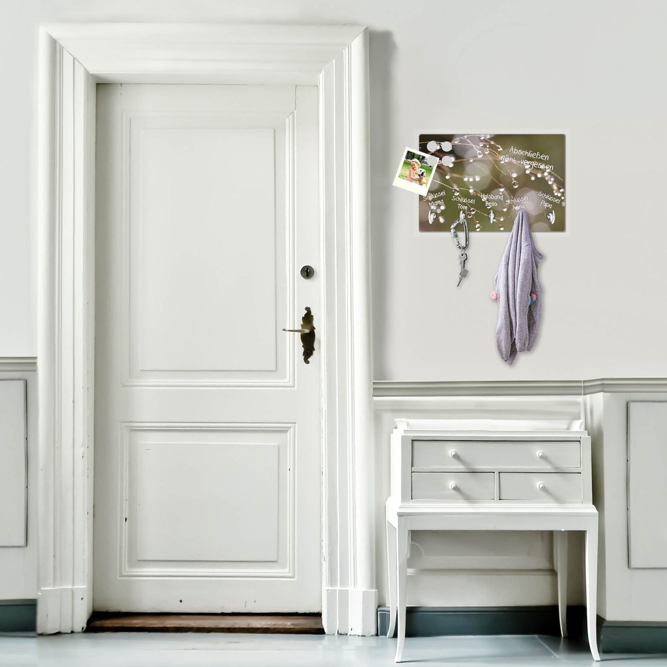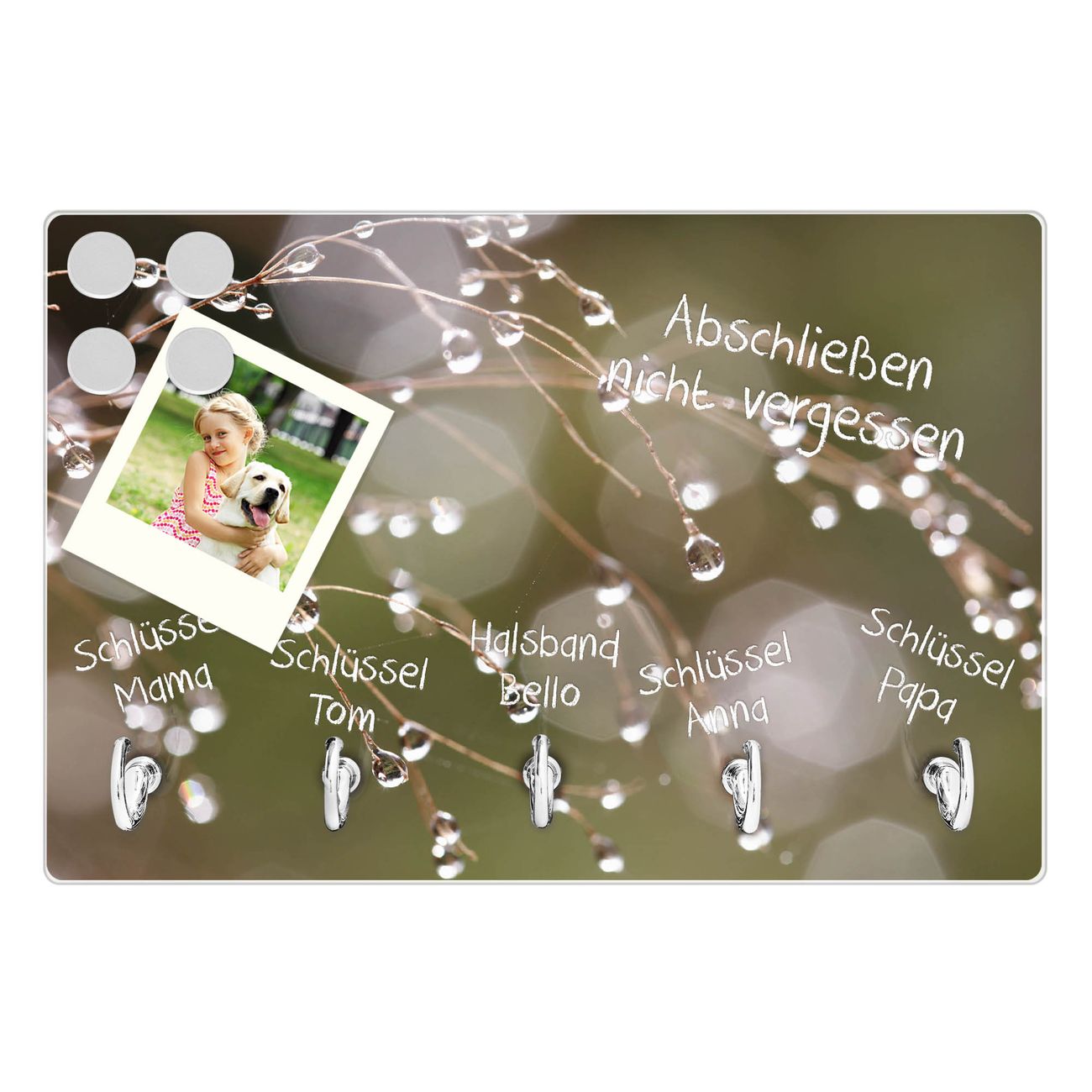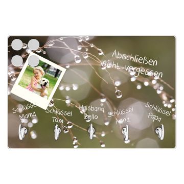 FUNKTION: Mit dem banjado Schlüsselbrett Tau Auf Zweigen hat Ihre Suche nach dem Schlüsselbund endlich ein Ende! Auf gesamt 5 Haken finden auch die größten Schlüssel ihren Platz. Durch den farbenfrohen Motivdruck ist das Schlüsselboard ein Blickfang in jeder Wohnung. DESIGN: Die Schlüsselleiste mit Motiv Tau Auf Zweigen hat ein sehr ansprechendes und ausgefallenes Design. Das Glasboard besteht aus einer gehärteten Glasscheibe mit dem Motiv Ihrer Wahl. Ihre neue Schlüsselaufbewahrung ist funktionell und ein optisches Highlight. DETAILS: Das Schlüsselbrett ist 30 x 20 x 4,5 CM (BxHxT). Das ganze Board besteht aus gehärtetem Sicherheitsglas, die Haken zur Selbstmontage präsentieren sich in Edelstahl-Optik. Für einen sicheren Halt erfolgt die Aufhängung an 2 vorgefertigten Haltern an der Rückseite. Das Montagematerial fügen wir bei. NUTZEN: Hier findet alles seinen Platz: Schlüsselbunde, Geschirrtücher, Hundeleinen oder Kinderjacken. Das Glas kann mit Kreidestiften bzw. Whiteboard-Marker beschrieben werden, mit extrastarken Neodym-Magneten können Sie auch Notizen anheften. BANJADO: Wir sind ein kleines Team aus dem Herzen von Sachsen und fertigen Ihre neue Schlüsselaufbewahrung von Hand an. Sie erhalten Handarbeit und keine preiswerte Importware. Wir hoffen, dass Ihnen unsere Idee zusagt, herzlichst das banjado Team.