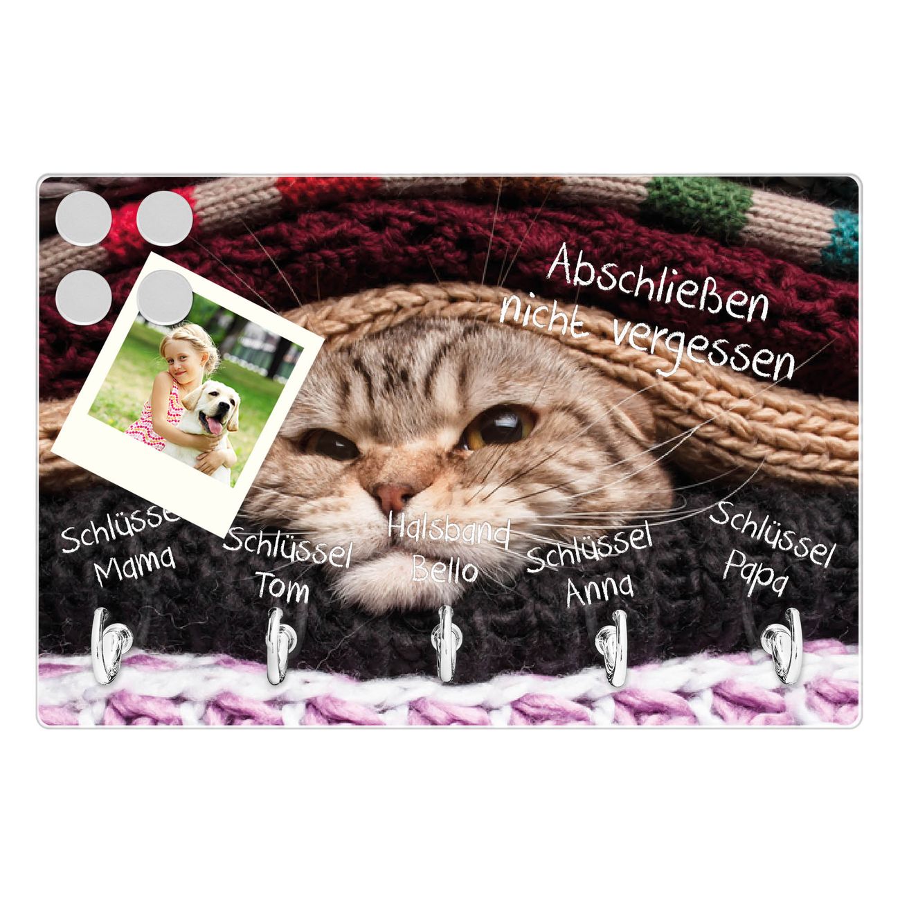 FUNKTION: Mit dem banjado Schlüsselbrett Theo hat Ihre Suche nach dem Schlüsselbund endlich ein Ende! Auf gesamt 5 Haken finden auch die größten Schlüssel ihren Platz. Durch den farbenfrohen Motivdruck ist das Schlüsselboard ein Blickfang in jeder Wohnung. DESIGN: Die Schlüsselleiste mit Motiv Theo hat ein sehr ansprechendes und ausgefallenes Design. Das Glasboard besteht aus einer gehärteten Glasscheibe mit dem Motiv Ihrer Wahl. Ihre neue Schlüsselaufbewahrung ist funktionell und ein optisches Highlight. DETAILS: Das Schlüsselbrett ist 30 x 20 x 4,5 CM (BxHxT). Das ganze Board besteht aus gehärtetem Sicherheitsglas, die Haken zur Selbstmontage präsentieren sich in Edelstahl-Optik. Für einen sicheren Halt erfolgt die Aufhängung an 2 vorgefertigten Haltern an der Rückseite. Das Montagematerial fügen wir bei. NUTZEN: Hier findet alles seinen Platz: Schlüsselbunde, Geschirrtücher, Hundeleinen oder Kinderjacken. Das Glas kann mit Kreidestiften bzw. Whiteboard-Marker beschrieben werden, mit extrastarken Neodym-Magneten können Sie auch Notizen anheften. BANJADO: Wir sind ein kleines Team aus dem Herzen von Sachsen und fertigen Ihre neue Schlüsselaufbewahrung von Hand an. Sie erhalten Handarbeit und keine preiswerte Importware. Wir hoffen, dass Ihnen unsere Idee zusagt, herzlichst das banjado Team.