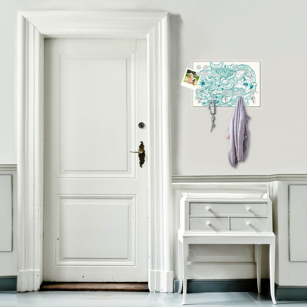 FUNKTION: Mit dem banjado Schlüsselbrett Tiefsee hat Ihre Suche nach dem Schlüsselbund endlich ein Ende! Auf gesamt 5 Haken finden auch die größten Schlüssel ihren Platz. Durch den farbenfrohen Motivdruck ist das Schlüsselboard ein Blickfang in jeder Wohnung. DESIGN: Die Schlüsselleiste mit Motiv Tiefsee hat ein sehr ansprechendes und ausgefallenes Design. Das Glasboard besteht aus einer gehärteten Glasscheibe mit dem Motiv Ihrer Wahl. Ihre neue Schlüsselaufbewahrung ist funktionell und ein optisches Highlight. DETAILS: Das Schlüsselbrett ist 30 x 20 x 4,5 CM (BxHxT). Das ganze Board besteht aus gehärtetem Sicherheitsglas, die Haken zur Selbstmontage präsentieren sich in Edelstahl-Optik. Für einen sicheren Halt erfolgt die Aufhängung an 2 vorgefertigten Haltern an der Rückseite. Das Montagematerial fügen wir bei. NUTZEN: Hier findet alles seinen Platz: Schlüsselbunde, Geschirrtücher, Hundeleinen oder Kinderjacken. Das Glas kann mit Kreidestiften bzw. Whiteboard-Marker beschrieben werden, mit extrastarken Neodym-Magneten können Sie auch Notizen anheften. BANJADO: Wir sind ein kleines Team aus dem Herzen von Sachsen und fertigen Ihre neue Schlüsselaufbewahrung von Hand an. Sie erhalten Handarbeit und keine preiswerte Importware. Wir hoffen, dass Ihnen unsere Idee zusagt, herzlichst das banjado Team.