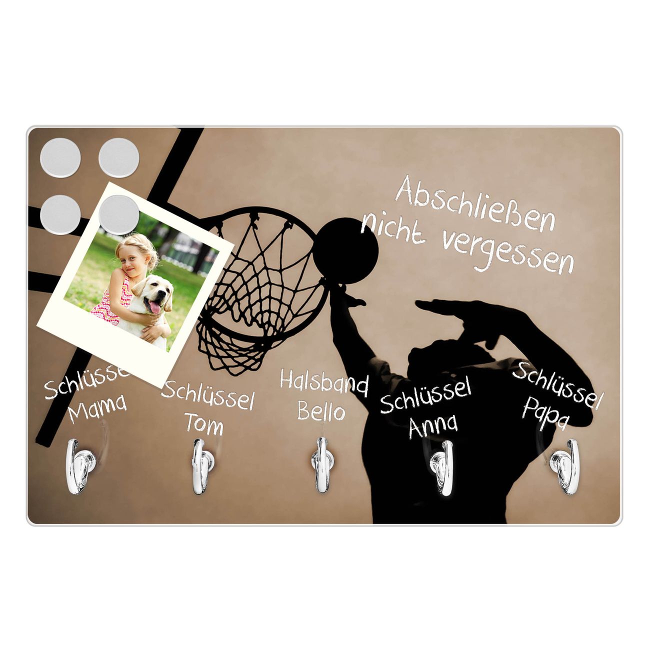 FUNKTION: Mit dem banjado Schlüsselbrett Tip In hat Ihre Suche nach dem Schlüsselbund endlich ein Ende! Auf gesamt 5 Haken finden auch die größten Schlüssel ihren Platz. Durch den farbenfrohen Motivdruck ist das Schlüsselboard ein Blickfang in jeder Wohnung. DESIGN: Die Schlüsselleiste mit Motiv Tip In hat ein sehr ansprechendes und ausgefallenes Design. Das Glasboard besteht aus einer gehärteten Glasscheibe mit dem Motiv Ihrer Wahl. Ihre neue Schlüsselaufbewahrung ist funktionell und ein optisches Highlight. DETAILS: Das Schlüsselbrett ist 30 x 20 x 4,5 CM (BxHxT). Das ganze Board besteht aus gehärtetem Sicherheitsglas, die Haken zur Selbstmontage präsentieren sich in Edelstahl-Optik. Für einen sicheren Halt erfolgt die Aufhängung an 2 vorgefertigten Haltern an der Rückseite. Das Montagematerial fügen wir bei. NUTZEN: Hier findet alles seinen Platz: Schlüsselbunde, Geschirrtücher, Hundeleinen oder Kinderjacken. Das Glas kann mit Kreidestiften bzw. Whiteboard-Marker beschrieben werden, mit extrastarken Neodym-Magneten können Sie auch Notizen anheften. BANJADO: Wir sind ein kleines Team aus dem Herzen von Sachsen und fertigen Ihre neue Schlüsselaufbewahrung von Hand an. Sie erhalten Handarbeit und keine preiswerte Importware. Wir hoffen, dass Ihnen unsere Idee zusagt, herzlichst das banjado Team.