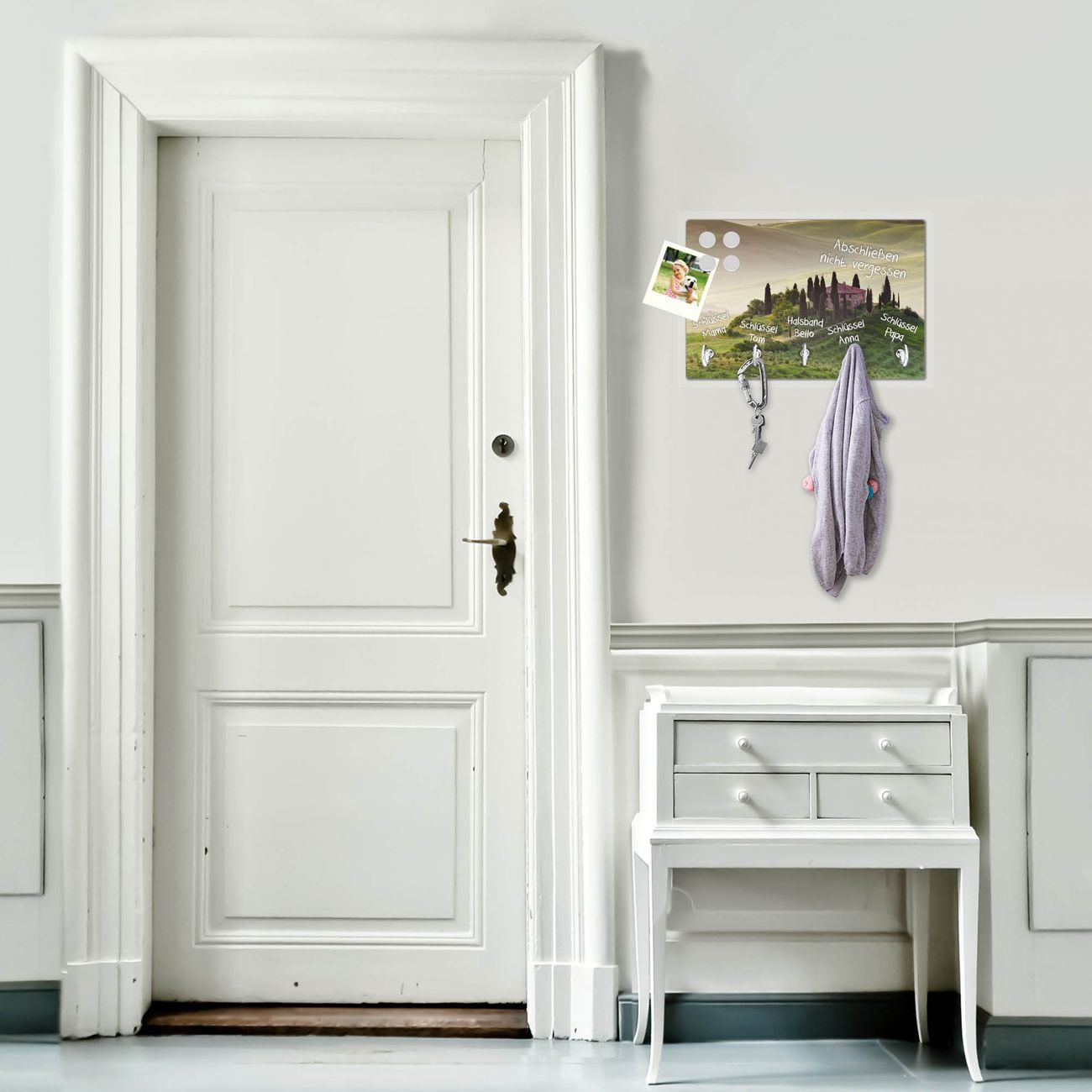 FUNKTION: Mit dem banjado Schlüsselbrett Toscana hat Ihre Suche nach dem Schlüsselbund endlich ein Ende! Auf gesamt 5 Haken finden auch die größten Schlüssel ihren Platz. Durch den farbenfrohen Motivdruck ist das Schlüsselboard ein Blickfang in jeder Wohnung. DESIGN: Die Schlüsselleiste mit Motiv Toscana hat ein sehr ansprechendes und ausgefallenes Design. Das Glasboard besteht aus einer gehärteten Glasscheibe mit dem Motiv Ihrer Wahl. Ihre neue Schlüsselaufbewahrung ist funktionell und ein optisches Highlight. DETAILS: Das Schlüsselbrett ist 30 x 20 x 4,5 CM (BxHxT). Das ganze Board besteht aus gehärtetem Sicherheitsglas, die Haken zur Selbstmontage präsentieren sich in Edelstahl-Optik. Für einen sicheren Halt erfolgt die Aufhängung an 2 vorgefertigten Haltern an der Rückseite. Das Montagematerial fügen wir bei. NUTZEN: Hier findet alles seinen Platz: Schlüsselbunde, Geschirrtücher, Hundeleinen oder Kinderjacken. Das Glas kann mit Kreidestiften bzw. Whiteboard-Marker beschrieben werden, mit extrastarken Neodym-Magneten können Sie auch Notizen anheften. BANJADO: Wir sind ein kleines Team aus dem Herzen von Sachsen und fertigen Ihre neue Schlüsselaufbewahrung von Hand an. Sie erhalten Handarbeit und keine preiswerte Importware. Wir hoffen, dass Ihnen unsere Idee zusagt, herzlichst das banjado Team.