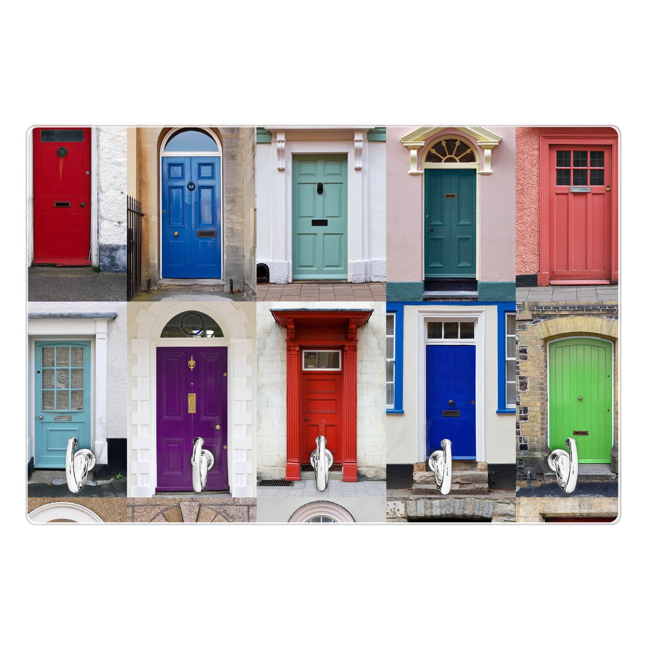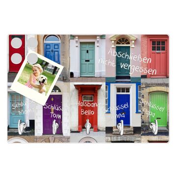 FUNKTION: Mit dem banjado Schlüsselbrett Türen hat Ihre Suche nach dem Schlüsselbund endlich ein Ende! Auf gesamt 5 Haken finden auch die größten Schlüssel ihren Platz. Durch den farbenfrohen Motivdruck ist das Schlüsselboard ein Blickfang in jeder Wohnung. DESIGN: Die Schlüsselleiste mit Motiv Türen hat ein sehr ansprechendes und ausgefallenes Design. Das Glasboard besteht aus einer gehärteten Glasscheibe mit dem Motiv Ihrer Wahl. Ihre neue Schlüsselaufbewahrung ist funktionell und ein optisches Highlight. DETAILS: Das Schlüsselbrett ist 30 x 20 x 4,5 CM (BxHxT). Das ganze Board besteht aus gehärtetem Sicherheitsglas, die Haken zur Selbstmontage präsentieren sich in Edelstahl-Optik. Für einen sicheren Halt erfolgt die Aufhängung an 2 vorgefertigten Haltern an der Rückseite. Das Montagematerial fügen wir bei. NUTZEN: Hier findet alles seinen Platz: Schlüsselbunde, Geschirrtücher, Hundeleinen oder Kinderjacken. Das Glas kann mit Kreidestiften bzw. Whiteboard-Marker beschrieben werden, mit extrastarken Neodym-Magneten können Sie auch Notizen anheften. BANJADO: Wir sind ein kleines Team aus dem Herzen von Sachsen und fertigen Ihre neue Schlüsselaufbewahrung von Hand an. Sie erhalten Handarbeit und keine preiswerte Importware. Wir hoffen, dass Ihnen unsere Idee zusagt, herzlichst das banjado Team.