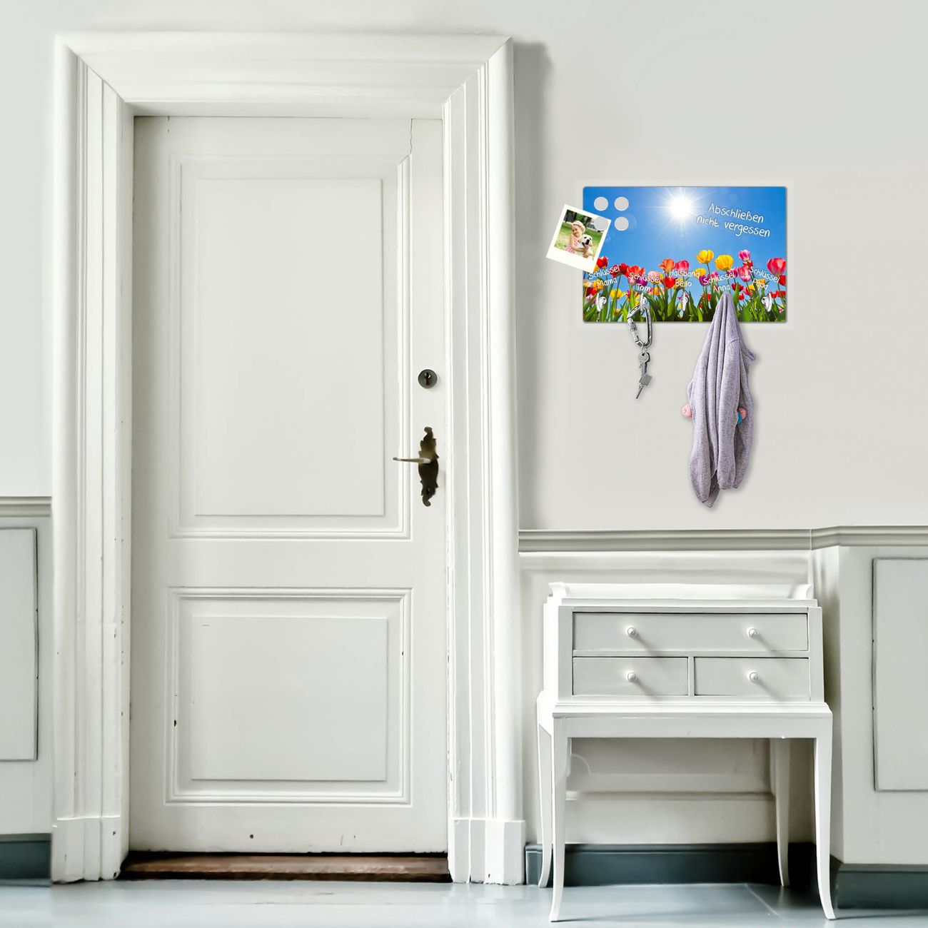 FUNKTION: Mit dem banjado Schlüsselbrett Tulpenmeer hat Ihre Suche nach dem Schlüsselbund endlich ein Ende! Auf gesamt 5 Haken finden auch die größten Schlüssel ihren Platz. Durch den farbenfrohen Motivdruck ist das Schlüsselboard ein Blickfang in jeder Wohnung. DESIGN: Die Schlüsselleiste mit Motiv Tulpenmeer hat ein sehr ansprechendes und ausgefallenes Design. Das Glasboard besteht aus einer gehärteten Glasscheibe mit dem Motiv Ihrer Wahl. Ihre neue Schlüsselaufbewahrung ist funktionell und ein optisches Highlight. DETAILS: Das Schlüsselbrett ist 30 x 20 x 4,5 CM (BxHxT). Das ganze Board besteht aus gehärtetem Sicherheitsglas, die Haken zur Selbstmontage präsentieren sich in Edelstahl-Optik. Für einen sicheren Halt erfolgt die Aufhängung an 2 vorgefertigten Haltern an der Rückseite. Das Montagematerial fügen wir bei. NUTZEN: Hier findet alles seinen Platz: Schlüsselbunde, Geschirrtücher, Hundeleinen oder Kinderjacken. Das Glas kann mit Kreidestiften bzw. Whiteboard-Marker beschrieben werden, mit extrastarken Neodym-Magneten können Sie auch Notizen anheften. BANJADO: Wir sind ein kleines Team aus dem Herzen von Sachsen und fertigen Ihre neue Schlüsselaufbewahrung von Hand an. Sie erhalten Handarbeit und keine preiswerte Importware. Wir hoffen, dass Ihnen unsere Idee zusagt, herzlichst das banjado Team.