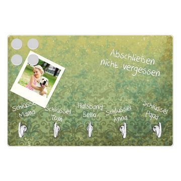 FUNKTION: Mit dem banjado Schlüsselbrett Vintage Messing hat Ihre Suche nach dem Schlüsselbund endlich ein Ende! Auf gesamt 5 Haken finden auch die größten Schlüssel ihren Platz. Durch den farbenfrohen Motivdruck ist das Schlüsselboard ein Blickfang in jeder Wohnung. DESIGN: Die Schlüsselleiste mit Motiv Vintage Messing hat ein sehr ansprechendes und ausgefallenes Design. Das Glasboard besteht aus einer gehärteten Glasscheibe mit dem Motiv Ihrer Wahl. Ihre neue Schlüsselaufbewahrung ist funktionell und ein optisches Highlight. DETAILS: Das Schlüsselbrett ist 30 x 20 x 4,5 CM (BxHxT). Das ganze Board besteht aus gehärtetem Sicherheitsglas, die Haken zur Selbstmontage präsentieren sich in Edelstahl-Optik. Für einen sicheren Halt erfolgt die Aufhängung an 2 vorgefertigten Haltern an der Rückseite. Das Montagematerial fügen wir bei. NUTZEN: Hier findet alles seinen Platz: Schlüsselbunde, Geschirrtücher, Hundeleinen oder Kinderjacken. Das Glas kann mit Kreidestiften bzw. Whiteboard-Marker beschrieben werden, mit extrastarken Neodym-Magneten können Sie auch Notizen anheften. BANJADO: Wir sind ein kleines Team aus dem Herzen von Sachsen und fertigen Ihre neue Schlüsselaufbewahrung von Hand an. Sie erhalten Handarbeit und keine preiswerte Importware. Wir hoffen, dass Ihnen unsere Idee zusagt, herzlichst das banjado Team.