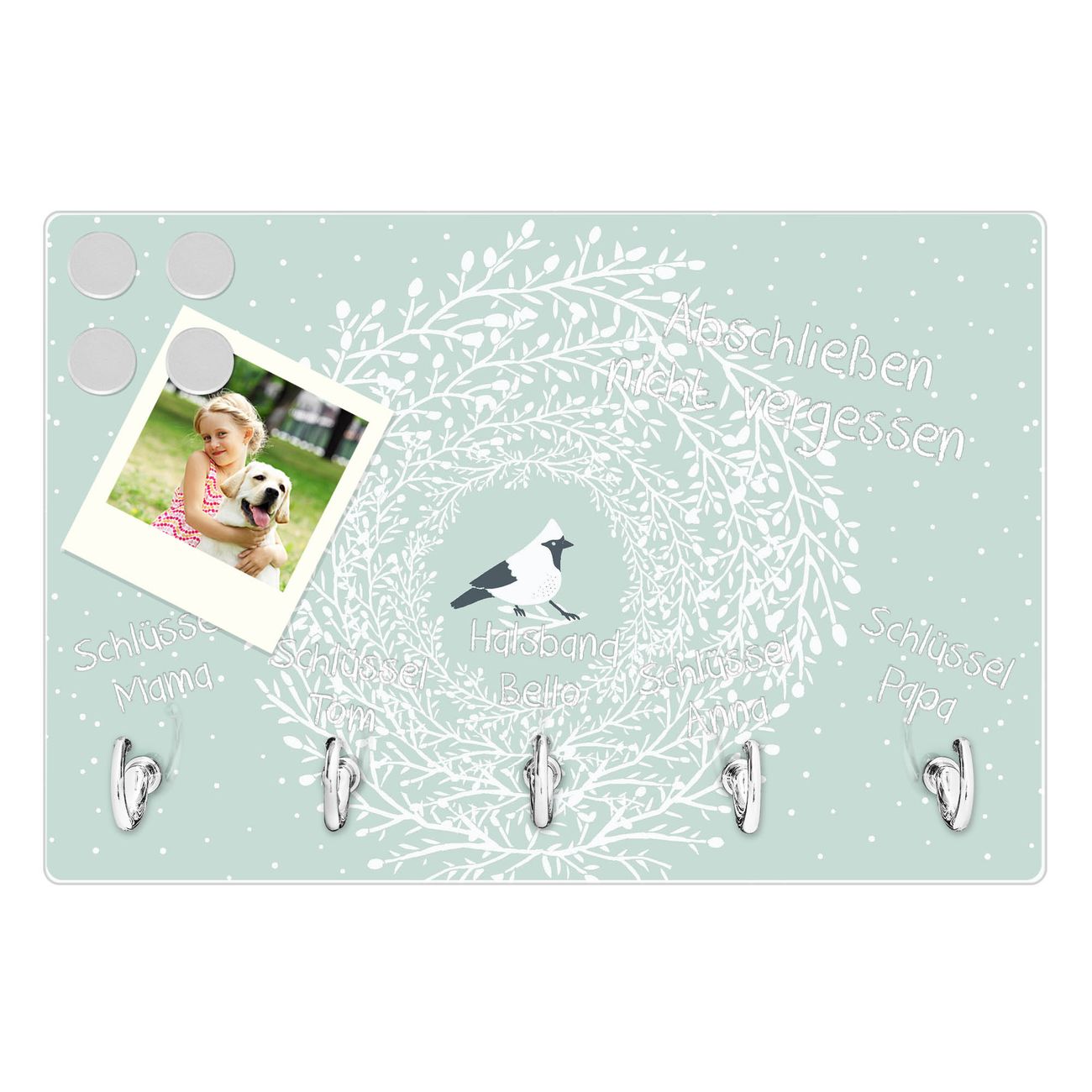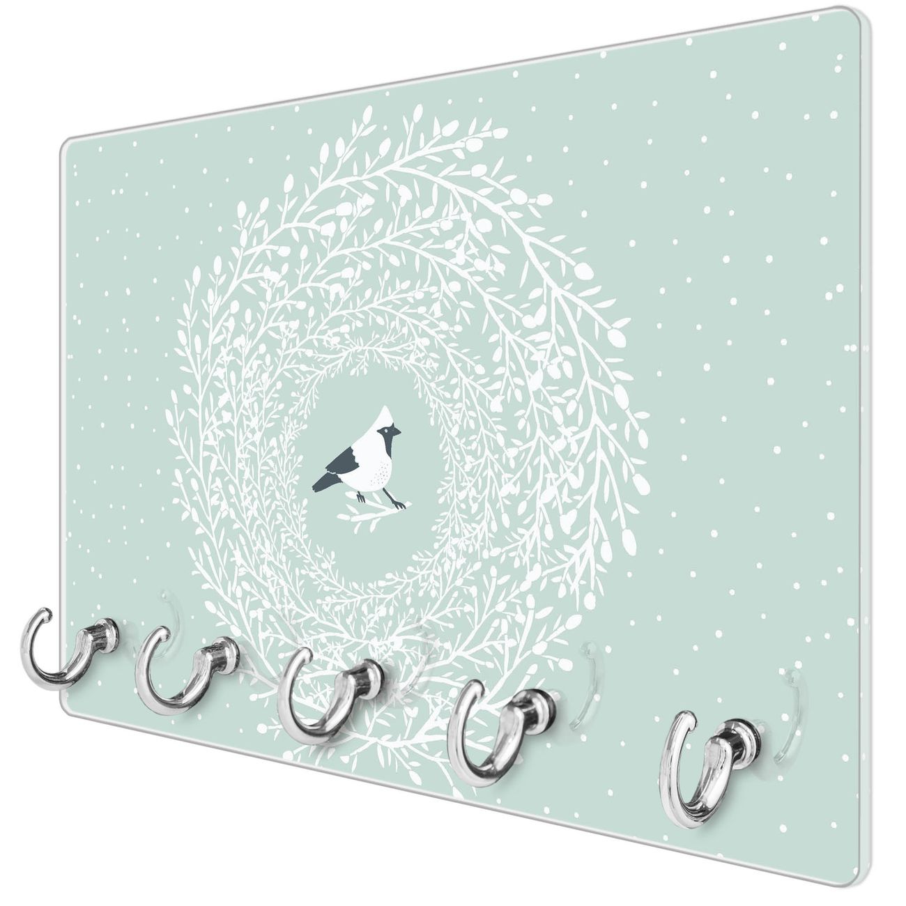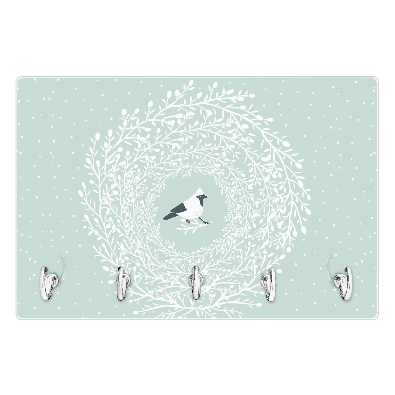 Glas Schlüsselbrett mit 5 Haken Vogel im Kranz