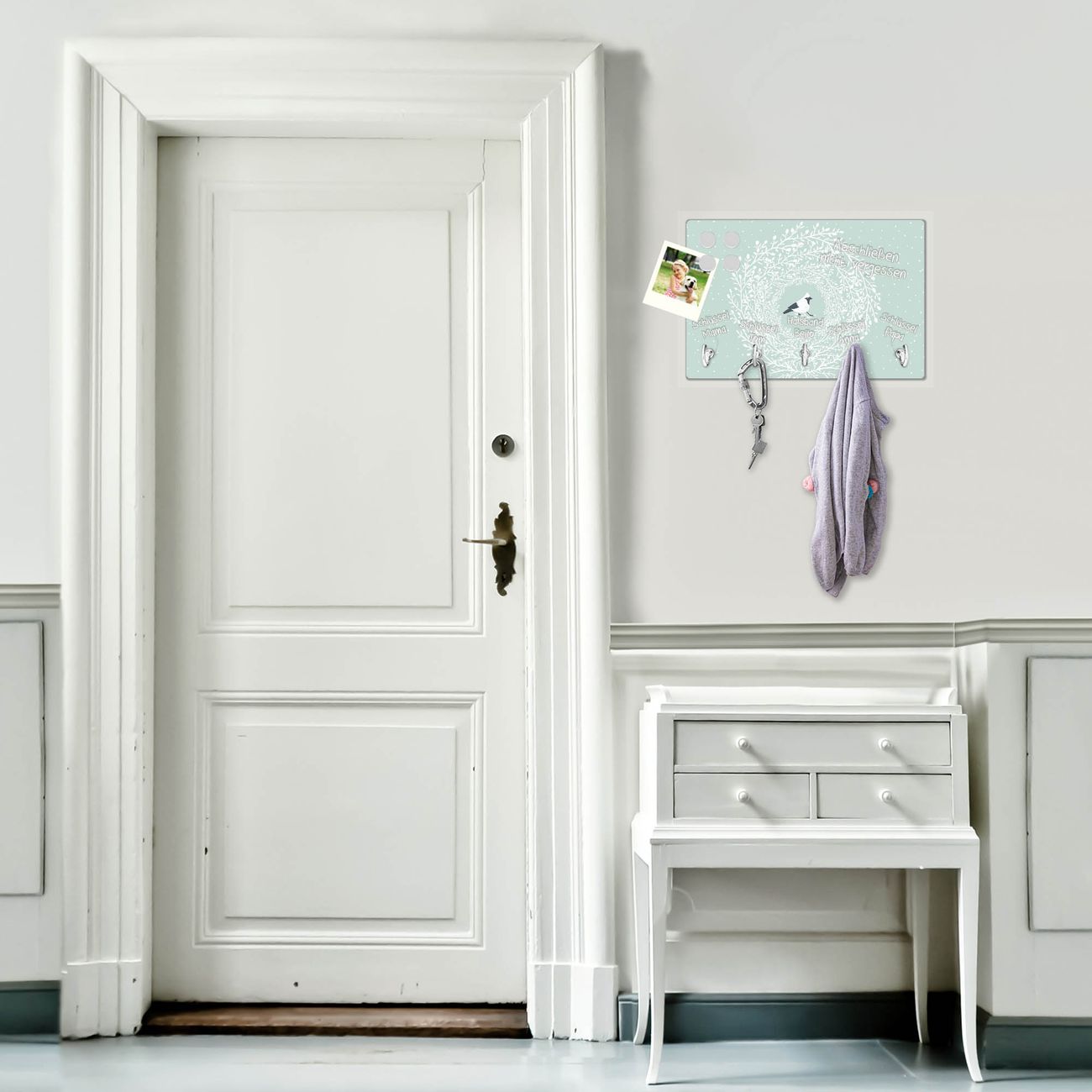FUNKTION: Mit dem banjado Schlüsselbrett Vogel im Kranz hat Ihre Suche nach dem Schlüsselbund endlich ein Ende! Auf gesamt 5 Haken finden auch die größten Schlüssel ihren Platz. Durch den farbenfrohen Motivdruck ist das Schlüsselboard ein Blickfang in jeder Wohnung. DESIGN: Die Schlüsselleiste mit Motiv Vogel im Kranz hat ein sehr ansprechendes und ausgefallenes Design. Das Glasboard besteht aus einer gehärteten Glasscheibe mit dem Motiv Ihrer Wahl. Ihre neue Schlüsselaufbewahrung ist funktionell und ein optisches Highlight. DETAILS: Das Schlüsselbrett ist 30 x 20 x 4,5 CM (BxHxT). Das ganze Board besteht aus gehärtetem Sicherheitsglas, die Haken zur Selbstmontage präsentieren sich in Edelstahl-Optik. Für einen sicheren Halt erfolgt die Aufhängung an 2 vorgefertigten Haltern an der Rückseite. Das Montagematerial fügen wir bei. NUTZEN: Hier findet alles seinen Platz: Schlüsselbunde, Geschirrtücher, Hundeleinen oder Kinderjacken. Das Glas kann mit Kreidestiften bzw. Whiteboard-Marker beschrieben werden, mit extrastarken Neodym-Magneten können Sie auch Notizen anheften. BANJADO: Wir sind ein kleines Team aus dem Herzen von Sachsen und fertigen Ihre neue Schlüsselaufbewahrung von Hand an. Sie erhalten Handarbeit und keine preiswerte Importware. Wir hoffen, dass Ihnen unsere Idee zusagt, herzlichst das banjado Team.