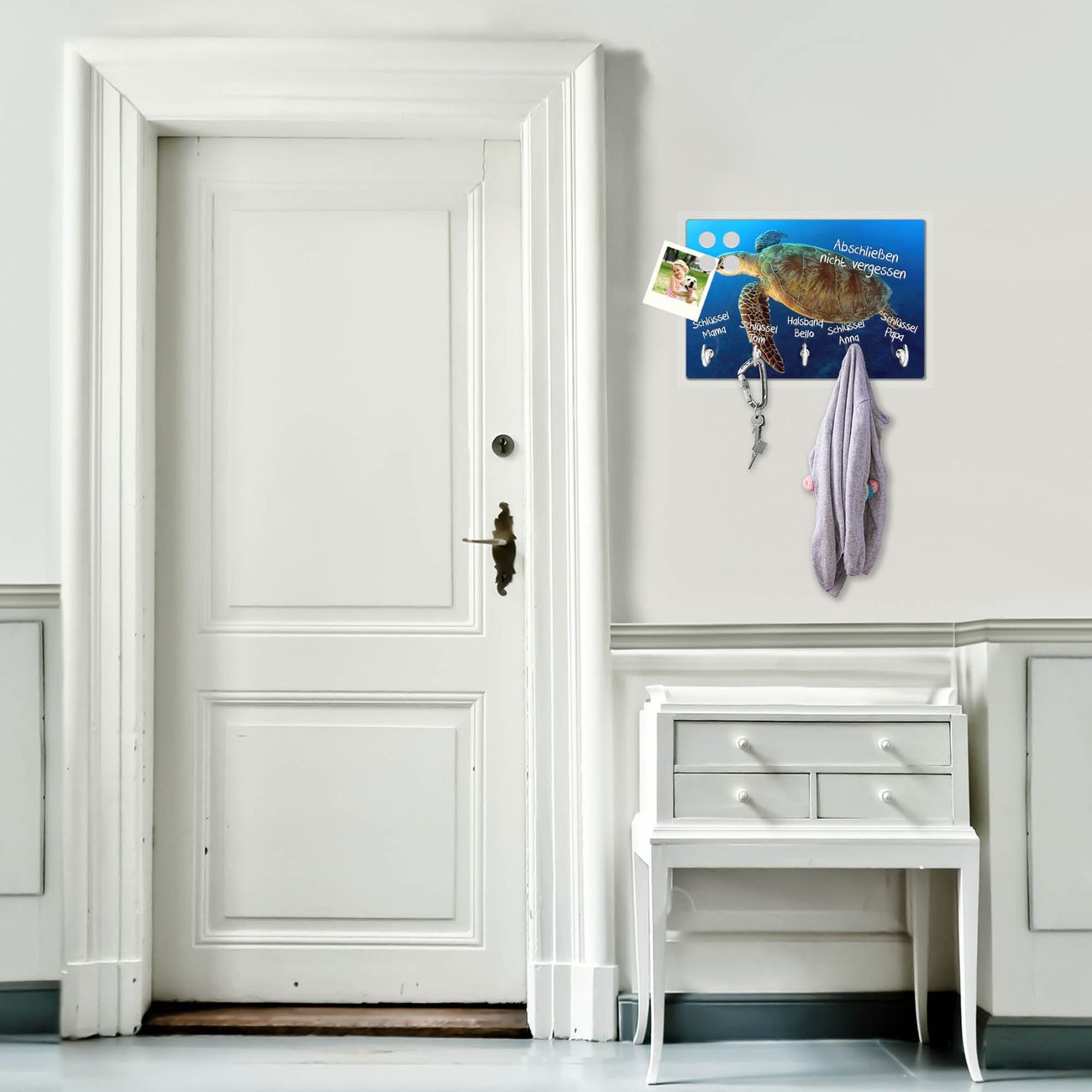 FUNKTION: Mit dem banjado Schlüsselbrett Wasserschildkröte hat Ihre Suche nach dem Schlüsselbund endlich ein Ende! Auf gesamt 5 Haken finden auch die größten Schlüssel ihren Platz. Durch den farbenfrohen Motivdruck ist das Schlüsselboard ein Blickfang in jeder Wohnung. DESIGN: Die Schlüsselleiste mit Motiv Wasserschildkröte hat ein sehr ansprechendes und ausgefallenes Design. Das Glasboard besteht aus einer gehärteten Glasscheibe mit dem Motiv Ihrer Wahl. Ihre neue Schlüsselaufbewahrung ist funktionell und ein optisches Highlight. DETAILS: Das Schlüsselbrett ist 30 x 20 x 4,5 CM (BxHxT). Das ganze Board besteht aus gehärtetem Sicherheitsglas, die Haken zur Selbstmontage präsentieren sich in Edelstahl-Optik. Für einen sicheren Halt erfolgt die Aufhängung an 2 vorgefertigten Haltern an der Rückseite. Das Montagematerial fügen wir bei. NUTZEN: Hier findet alles seinen Platz: Schlüsselbunde, Geschirrtücher, Hundeleinen oder Kinderjacken. Das Glas kann mit Kreidestiften bzw. Whiteboard-Marker beschrieben werden, mit extrastarken Neodym-Magneten können Sie auch Notizen anheften. BANJADO: Wir sind ein kleines Team aus dem Herzen von Sachsen und fertigen Ihre neue Schlüsselaufbewahrung von Hand an. Sie erhalten Handarbeit und keine preiswerte Importware. Wir hoffen, dass Ihnen unsere Idee zusagt, herzlichst das banjado Team.