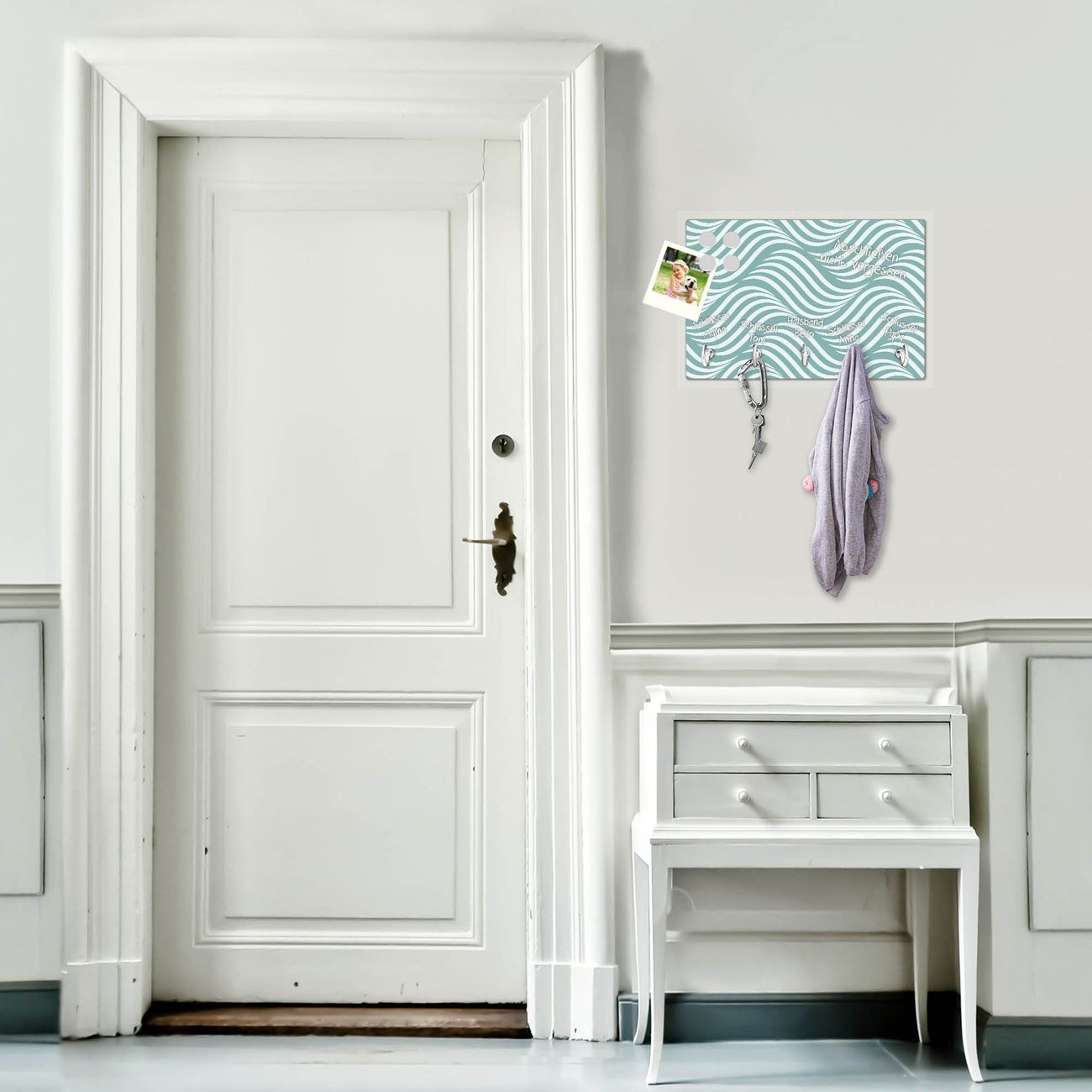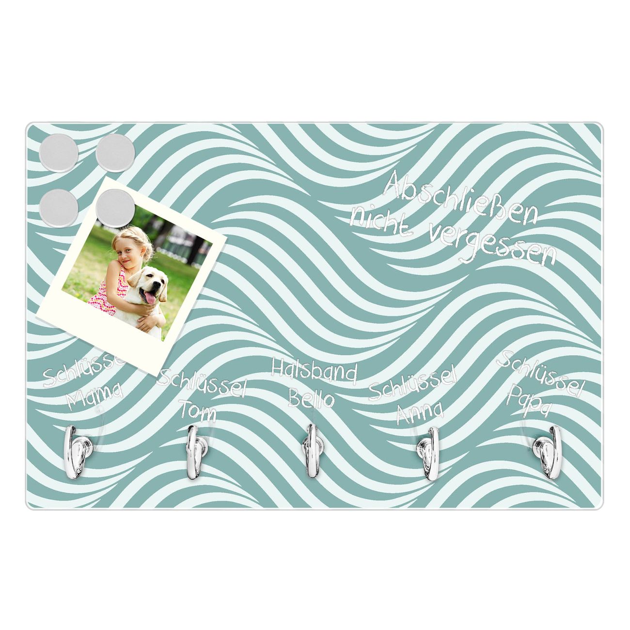 FUNKTION: Mit dem banjado Schlüsselbrett Wellen Lindgrün hat Ihre Suche nach dem Schlüsselbund endlich ein Ende! Auf gesamt 5 Haken finden auch die größten Schlüssel ihren Platz. Durch den farbenfrohen Motivdruck ist das Schlüsselboard ein Blickfang in jeder Wohnung. DESIGN: Die Schlüsselleiste mit Motiv Wellen Lindgrün hat ein sehr ansprechendes und ausgefallenes Design. Das Glasboard besteht aus einer gehärteten Glasscheibe mit dem Motiv Ihrer Wahl. Ihre neue Schlüsselaufbewahrung ist funktionell und ein optisches Highlight. DETAILS: Das Schlüsselbrett ist 30 x 20 x 4,5 CM (BxHxT). Das ganze Board besteht aus gehärtetem Sicherheitsglas, die Haken zur Selbstmontage präsentieren sich in Edelstahl-Optik. Für einen sicheren Halt erfolgt die Aufhängung an 2 vorgefertigten Haltern an der Rückseite. Das Montagematerial fügen wir bei. NUTZEN: Hier findet alles seinen Platz: Schlüsselbunde, Geschirrtücher, Hundeleinen oder Kinderjacken. Das Glas kann mit Kreidestiften bzw. Whiteboard-Marker beschrieben werden, mit extrastarken Neodym-Magneten können Sie auch Notizen anheften. BANJADO: Wir sind ein kleines Team aus dem Herzen von Sachsen und fertigen Ihre neue Schlüsselaufbewahrung von Hand an. Sie erhalten Handarbeit und keine preiswerte Importware. Wir hoffen, dass Ihnen unsere Idee zusagt, herzlichst das banjado Team.