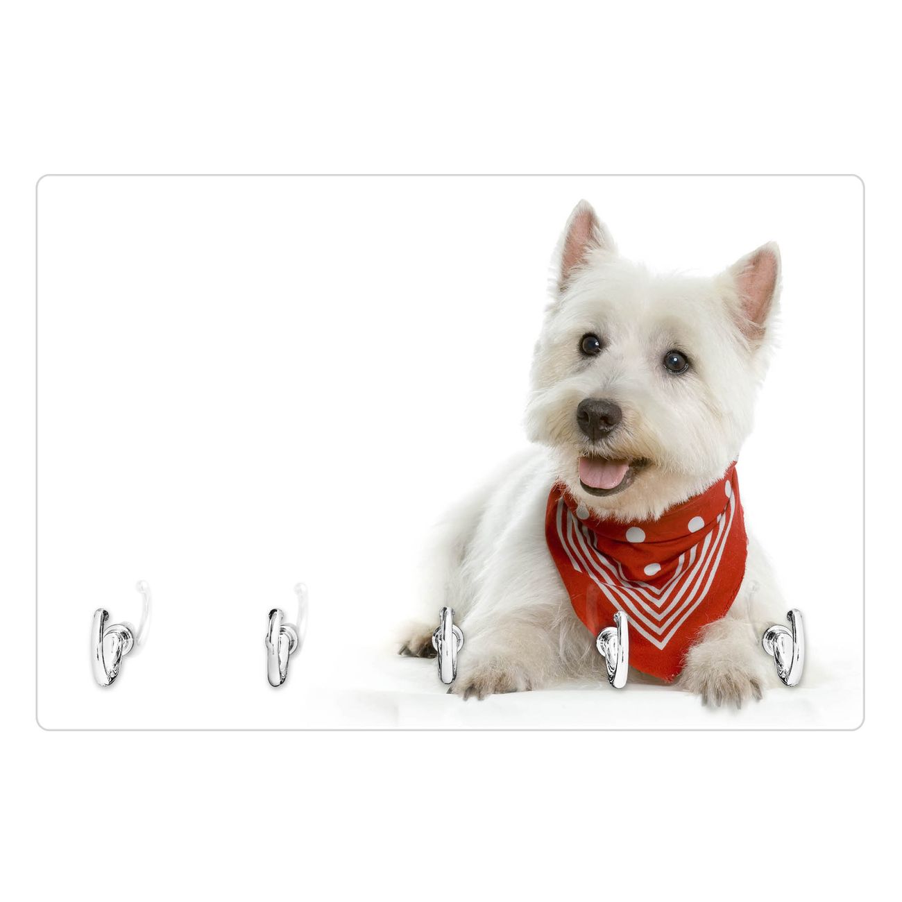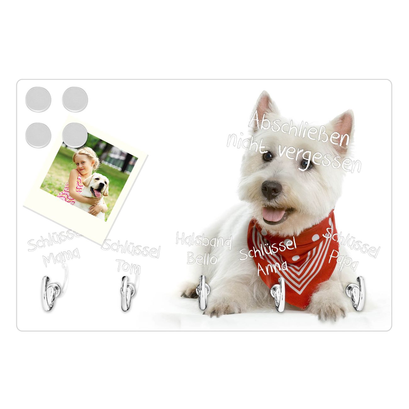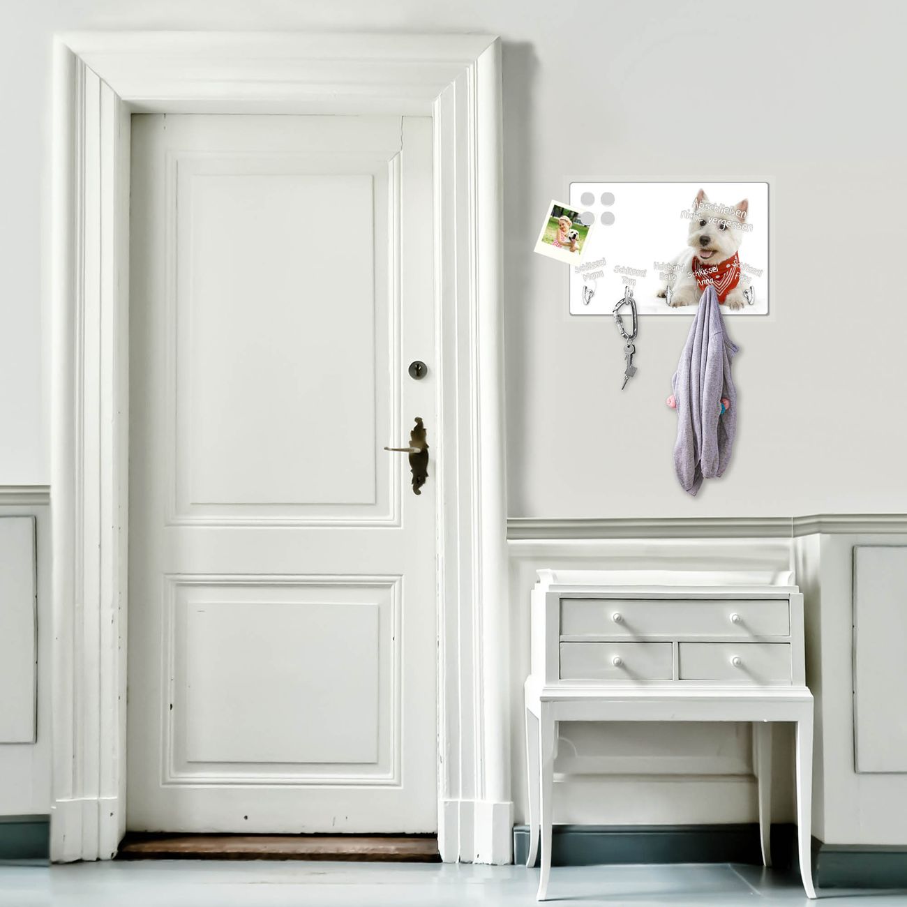 FUNKTION: Mit dem banjado Schlüsselbrett Westie hat Ihre Suche nach dem Schlüsselbund endlich ein Ende! Auf gesamt 5 Haken finden auch die größten Schlüssel ihren Platz. Durch den farbenfrohen Motivdruck ist das Schlüsselboard ein Blickfang in jeder Wohnung. DESIGN: Die Schlüsselleiste mit Motiv Westie hat ein sehr ansprechendes und ausgefallenes Design. Das Glasboard besteht aus einer gehärteten Glasscheibe mit dem Motiv Ihrer Wahl. Ihre neue Schlüsselaufbewahrung ist funktionell und ein optisches Highlight. DETAILS: Das Schlüsselbrett ist 30 x 20 x 4,5 CM (BxHxT). Das ganze Board besteht aus gehärtetem Sicherheitsglas, die Haken zur Selbstmontage präsentieren sich in Edelstahl-Optik. Für einen sicheren Halt erfolgt die Aufhängung an 2 vorgefertigten Haltern an der Rückseite. Das Montagematerial fügen wir bei. NUTZEN: Hier findet alles seinen Platz: Schlüsselbunde, Geschirrtücher, Hundeleinen oder Kinderjacken. Das Glas kann mit Kreidestiften bzw. Whiteboard-Marker beschrieben werden, mit extrastarken Neodym-Magneten können Sie auch Notizen anheften. BANJADO: Wir sind ein kleines Team aus dem Herzen von Sachsen und fertigen Ihre neue Schlüsselaufbewahrung von Hand an. Sie erhalten Handarbeit und keine preiswerte Importware. Wir hoffen, dass Ihnen unsere Idee zusagt, herzlichst das banjado Team.