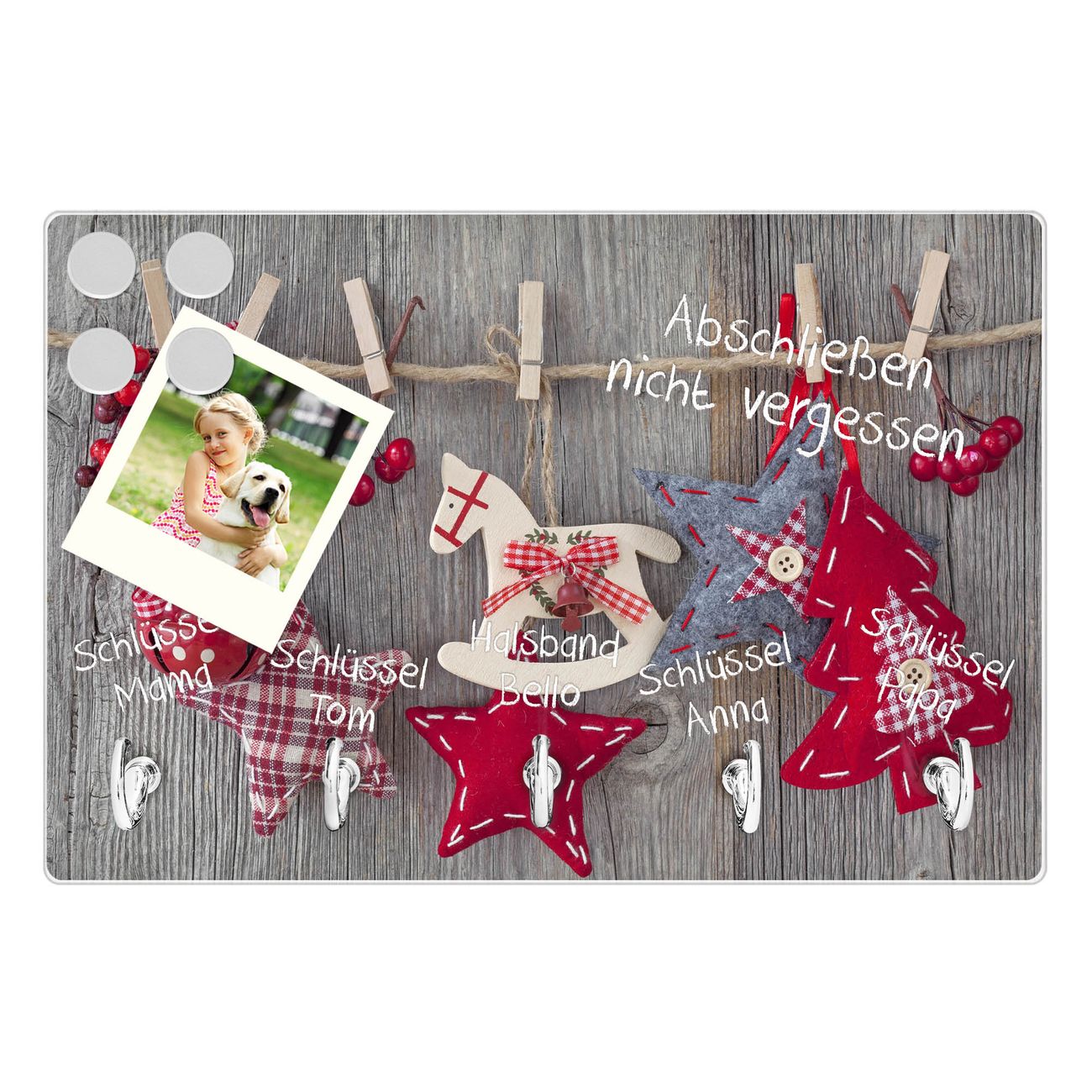 FUNKTION: Mit dem banjado Schlüsselbrett Winterdekoration hat Ihre Suche nach dem Schlüsselbund endlich ein Ende! Auf gesamt 5 Haken finden auch die größten Schlüssel ihren Platz. Durch den farbenfrohen Motivdruck ist das Schlüsselboard ein Blickfang in jeder Wohnung. DESIGN: Die Schlüsselleiste mit Motiv Winterdekoration hat ein sehr ansprechendes und ausgefallenes Design. Das Glasboard besteht aus einer gehärteten Glasscheibe mit dem Motiv Ihrer Wahl. Ihre neue Schlüsselaufbewahrung ist funktionell und ein optisches Highlight. DETAILS: Das Schlüsselbrett ist 30 x 20 x 4,5 CM (BxHxT). Das ganze Board besteht aus gehärtetem Sicherheitsglas, die Haken zur Selbstmontage präsentieren sich in Edelstahl-Optik. Für einen sicheren Halt erfolgt die Aufhängung an 2 vorgefertigten Haltern an der Rückseite. Das Montagematerial fügen wir bei. NUTZEN: Hier findet alles seinen Platz: Schlüsselbunde, Geschirrtücher, Hundeleinen oder Kinderjacken. Das Glas kann mit Kreidestiften bzw. Whiteboard-Marker beschrieben werden, mit extrastarken Neodym-Magneten können Sie auch Notizen anheften. BANJADO: Wir sind ein kleines Team aus dem Herzen von Sachsen und fertigen Ihre neue Schlüsselaufbewahrung von Hand an. Sie erhalten Handarbeit und keine preiswerte Importware. Wir hoffen, dass Ihnen unsere Idee zusagt, herzlichst das banjado Team.