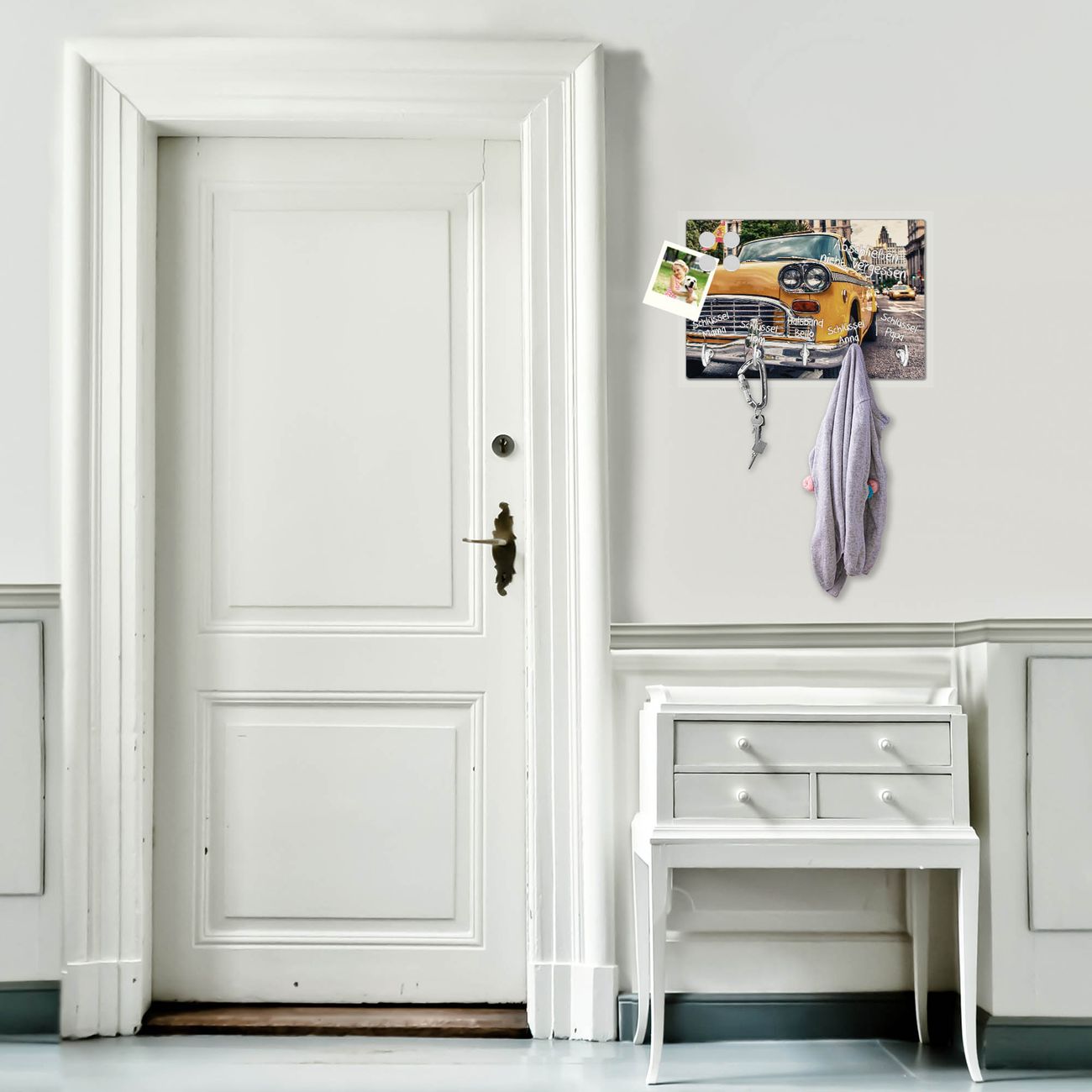 FUNKTION: Mit dem banjado Schlüsselbrett Yellow Cab hat Ihre Suche nach dem Schlüsselbund endlich ein Ende! Auf gesamt 5 Haken finden auch die größten Schlüssel ihren Platz. Durch den farbenfrohen Motivdruck ist das Schlüsselboard ein Blickfang in jeder Wohnung. DESIGN: Die Schlüsselleiste mit Motiv Yellow Cab hat ein sehr ansprechendes und ausgefallenes Design. Das Glasboard besteht aus einer gehärteten Glasscheibe mit dem Motiv Ihrer Wahl. Ihre neue Schlüsselaufbewahrung ist funktionell und ein optisches Highlight. DETAILS: Das Schlüsselbrett ist 30 x 20 x 4,5 CM (BxHxT). Das ganze Board besteht aus gehärtetem Sicherheitsglas, die Haken zur Selbstmontage präsentieren sich in Edelstahl-Optik. Für einen sicheren Halt erfolgt die Aufhängung an 2 vorgefertigten Haltern an der Rückseite. Das Montagematerial fügen wir bei. NUTZEN: Hier findet alles seinen Platz: Schlüsselbunde, Geschirrtücher, Hundeleinen oder Kinderjacken. Das Glas kann mit Kreidestiften bzw. Whiteboard-Marker beschrieben werden, mit extrastarken Neodym-Magneten können Sie auch Notizen anheften. BANJADO: Wir sind ein kleines Team aus dem Herzen von Sachsen und fertigen Ihre neue Schlüsselaufbewahrung von Hand an. Sie erhalten Handarbeit und keine preiswerte Importware. Wir hoffen, dass Ihnen unsere Idee zusagt, herzlichst das banjado Team.