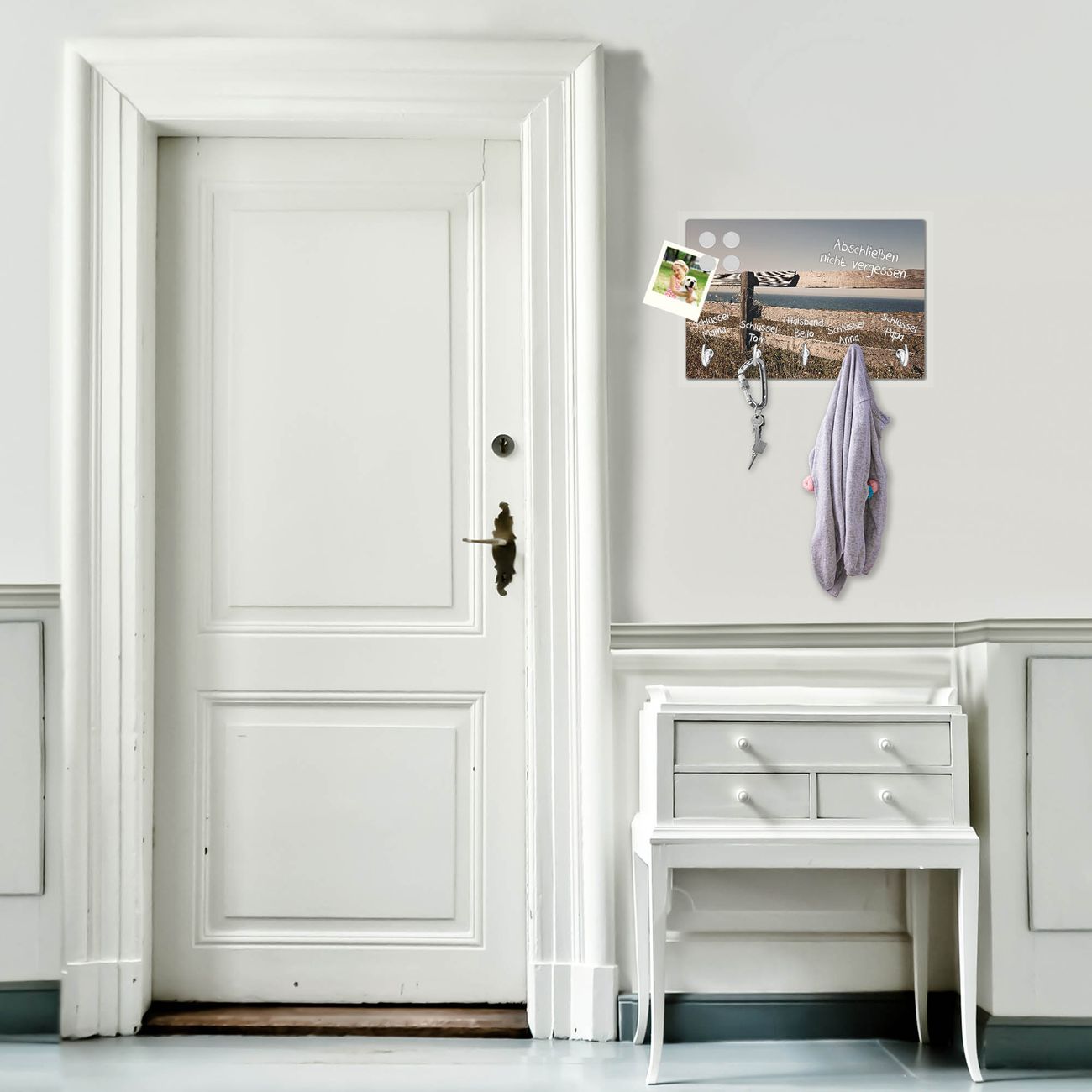 FUNKTION: Mit dem banjado Schlüsselbrett Zaun am Meer hat Ihre Suche nach dem Schlüsselbund endlich ein Ende! Auf gesamt 5 Haken finden auch die größten Schlüssel ihren Platz. Durch den farbenfrohen Motivdruck ist das Schlüsselboard ein Blickfang in jeder Wohnung. DESIGN: Die Schlüsselleiste mit Motiv Zaun am Meer hat ein sehr ansprechendes und ausgefallenes Design. Das Glasboard besteht aus einer gehärteten Glasscheibe mit dem Motiv Ihrer Wahl. Ihre neue Schlüsselaufbewahrung ist funktionell und ein optisches Highlight. DETAILS: Das Schlüsselbrett ist 30 x 20 x 4,5 CM (BxHxT). Das ganze Board besteht aus gehärtetem Sicherheitsglas, die Haken zur Selbstmontage präsentieren sich in Edelstahl-Optik. Für einen sicheren Halt erfolgt die Aufhängung an 2 vorgefertigten Haltern an der Rückseite. Das Montagematerial fügen wir bei. NUTZEN: Hier findet alles seinen Platz: Schlüsselbunde, Geschirrtücher, Hundeleinen oder Kinderjacken. Das Glas kann mit Kreidestiften bzw. Whiteboard-Marker beschrieben werden, mit extrastarken Neodym-Magneten können Sie auch Notizen anheften. BANJADO: Wir sind ein kleines Team aus dem Herzen von Sachsen und fertigen Ihre neue Schlüsselaufbewahrung von Hand an. Sie erhalten Handarbeit und keine preiswerte Importware. Wir hoffen, dass Ihnen unsere Idee zusagt, herzlichst das banjado Team.