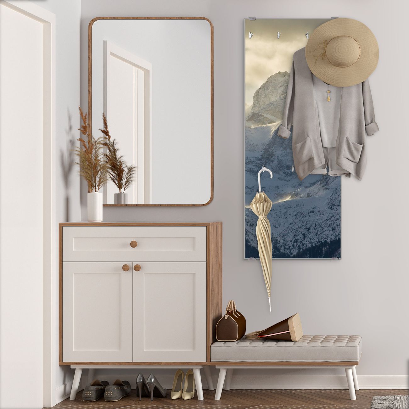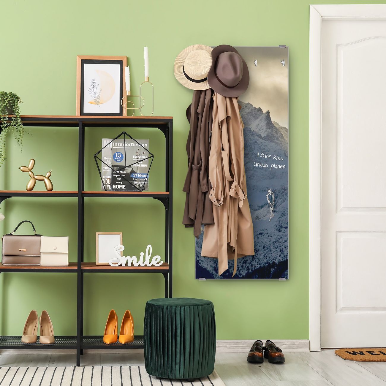 FUNKTION: Die banjado Wandgarderobe mit Motiv Alpen im Sonnenschein ist Ihr täglicher Begleiter. Zuverlässig hängen hier Ihre Jacken und Mäntel griffbereit. Das Echtglas ist Ihr Paneel auch beschreibbar und wieder abwischbar. DESIGN: Sie erhalten eine Garderobenleiste aus elegantem Echtglas mit dem Farbbrillanten Motiv Alpen im Sonnenschein hinterklebt. Das Design ist zeitlos klassisch, ohne dabei auf Funktionalität zu verzichten. Suchen Sie aus einer Vielzahl von Motiven das für Ihre Einrichtung Passende aus. DETAILS: Die Flurgarderobe besteht aus 4mm gehärtetem Sicherheitsglas. Sie ist 50cm breit, 125cm hoch und 6cm tief. Die Garderobenhaken zur Selbstmontage präsentieren sich in Edelstahl-Optik, ebenso die Abstandshalter für die Wandmontage. Ihre neue Garderobe ist sofort einsatzbereit. NUTZEN: Ihre neue Garderobe hält nicht nur zuverlässig Ihre Kleidung, sie ist auch optisch ein Blickfang. Durch das Glas können Sie an der Garderobe mit wasserlöslichen Kreidestiften oder Whiteboard-Markern auch Nachrichten hinterlassen. BANJADO: Wir sind ein kleines kreatives Team aus Sachsen und entwickeln Produkte die Design und Funktionalität verbinden sollen. Viel Freude mit Ihrer neuen Garderobe wünscht das banjado-Team!