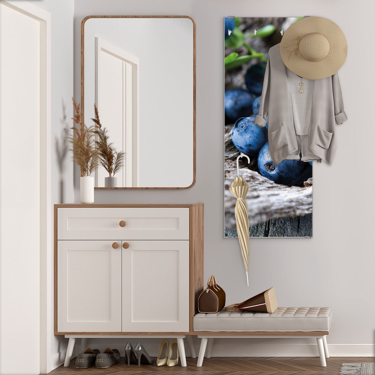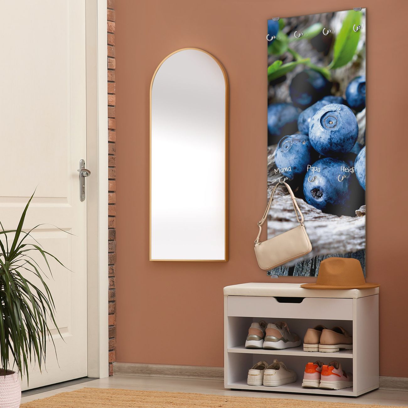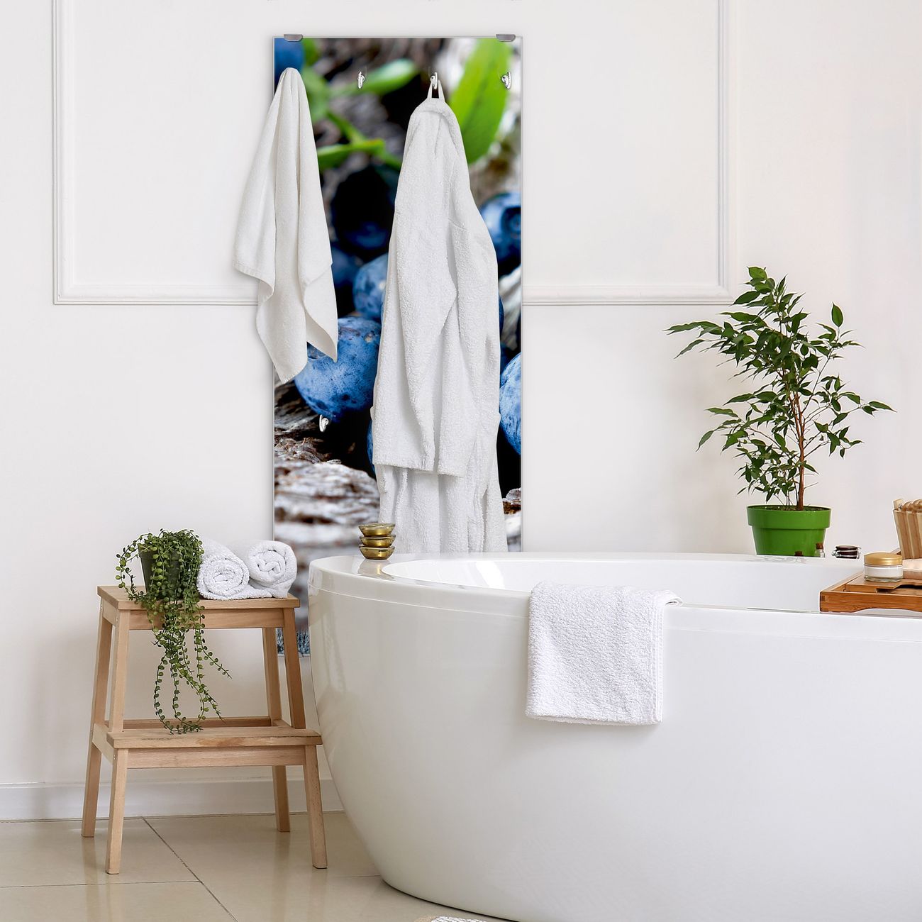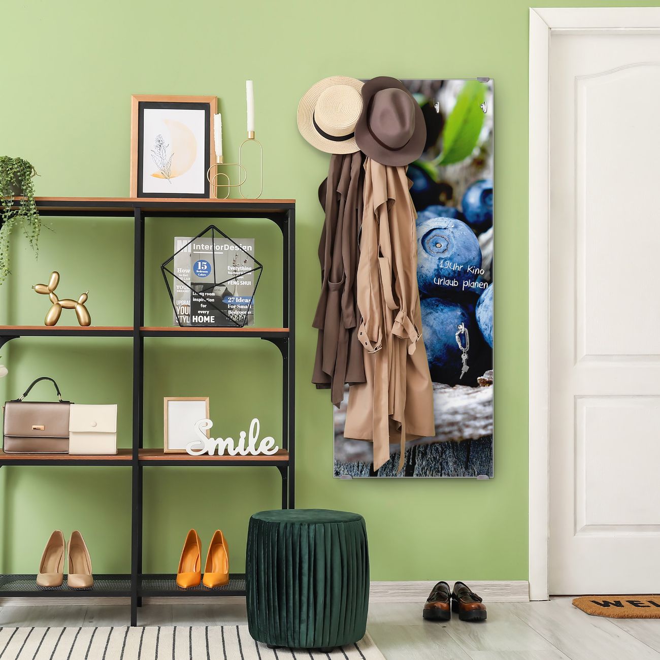 FUNKTION: Die banjado Wandgarderobe mit Motiv Blaubeeren ist Ihr täglicher Begleiter. Zuverlässig hängen hier Ihre Jacken und Mäntel griffbereit. Das Echtglas ist Ihr Paneel auch beschreibbar und wieder abwischbar. DESIGN: Sie erhalten eine Garderobenleiste aus elegantem Echtglas mit dem Farbbrillanten Motiv Blaubeeren hinterklebt. Das Design ist zeitlos klassisch, ohne dabei auf Funktionalität zu verzichten. Suchen Sie aus einer Vielzahl von Motiven das für Ihre Einrichtung Passende aus. DETAILS: Die Flurgarderobe besteht aus 4mm gehärtetem Sicherheitsglas. Sie ist 50cm breit, 125cm hoch und 6cm tief. Die Garderobenhaken zur Selbstmontage präsentieren sich in Edelstahl-Optik, ebenso die Abstandshalter für die Wandmontage. Ihre neue Garderobe ist sofort einsatzbereit. NUTZEN: Ihre neue Garderobe hält nicht nur zuverlässig Ihre Kleidung, sie ist auch optisch ein Blickfang. Durch das Glas können Sie an der Garderobe mit wasserlöslichen Kreidestiften oder Whiteboard-Markern auch Nachrichten hinterlassen. BANJADO: Wir sind ein kleines kreatives Team aus Sachsen und entwickeln Produkte die Design und Funktionalität verbinden sollen. Viel Freude mit Ihrer neuen Garderobe wünscht das banjado-Team!