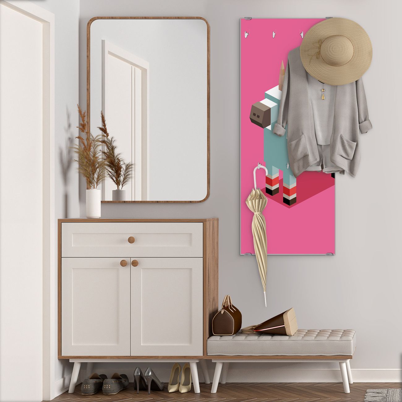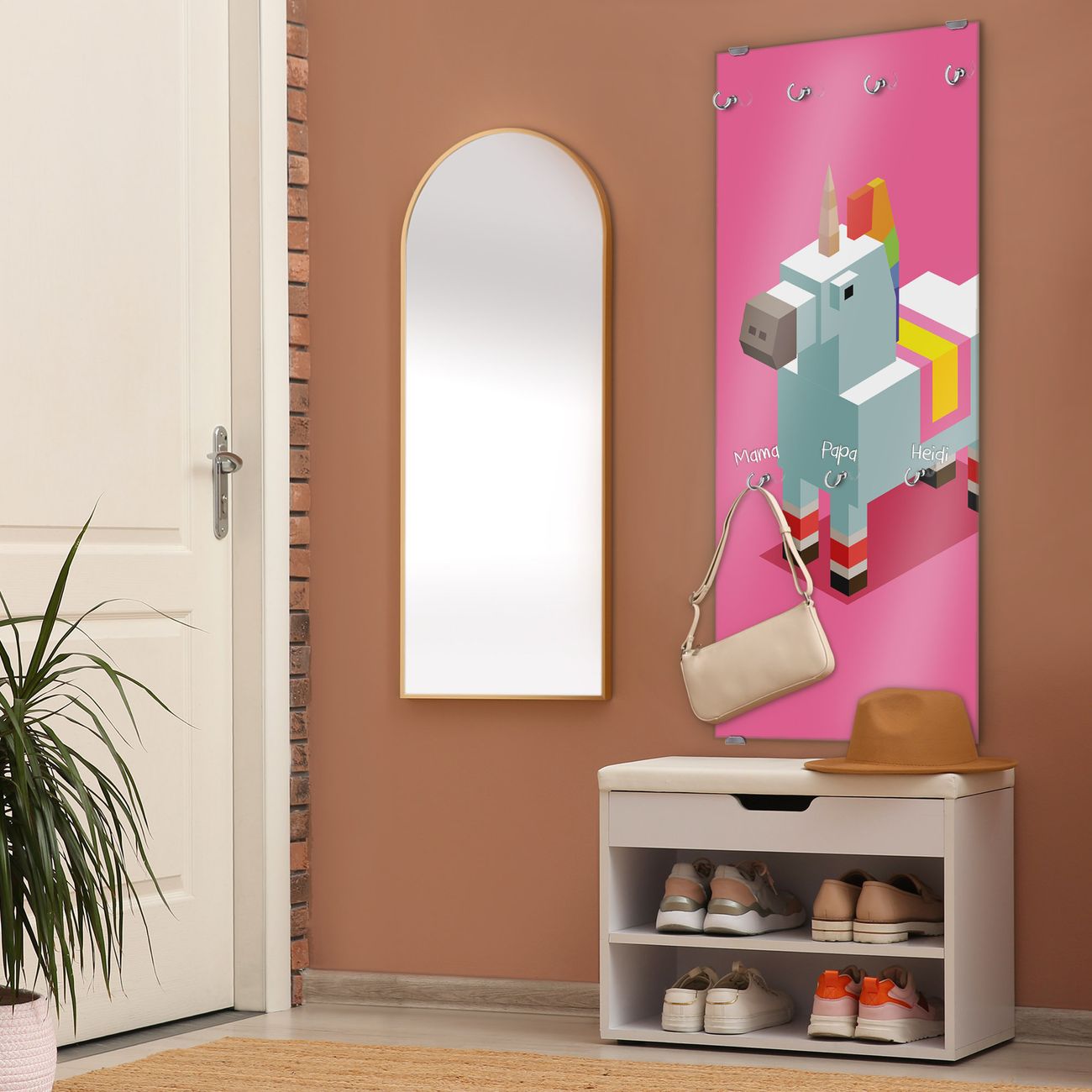 FUNKTION: Die banjado Wandgarderobe mit Motiv Einhorn Block ist Ihr täglicher Begleiter. Zuverlässig hängen hier Ihre Jacken und Mäntel griffbereit. Das Echtglas ist Ihr Paneel auch beschreibbar und wieder abwischbar. DESIGN: Sie erhalten eine Garderobenleiste aus elegantem Echtglas mit dem Farbbrillanten Motiv Einhorn Block hinterklebt. Das Design ist zeitlos klassisch, ohne dabei auf Funktionalität zu verzichten. Suchen Sie aus einer Vielzahl von Motiven das für Ihre Einrichtung Passende aus. DETAILS: Die Flurgarderobe besteht aus 4mm gehärtetem Sicherheitsglas. Sie ist 50cm breit, 125cm hoch und 6cm tief. Die Garderobenhaken zur Selbstmontage präsentieren sich in Edelstahl-Optik, ebenso die Abstandshalter für die Wandmontage. Ihre neue Garderobe ist sofort einsatzbereit. NUTZEN: Ihre neue Garderobe hält nicht nur zuverlässig Ihre Kleidung, sie ist auch optisch ein Blickfang. Durch das Glas können Sie an der Garderobe mit wasserlöslichen Kreidestiften oder Whiteboard-Markern auch Nachrichten hinterlassen. BANJADO: Wir sind ein kleines kreatives Team aus Sachsen und entwickeln Produkte die Design und Funktionalität verbinden sollen. Viel Freude mit Ihrer neuen Garderobe wünscht das banjado-Team!