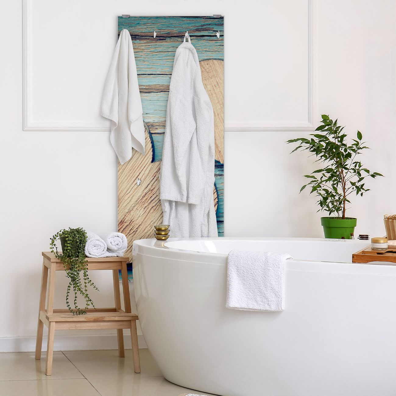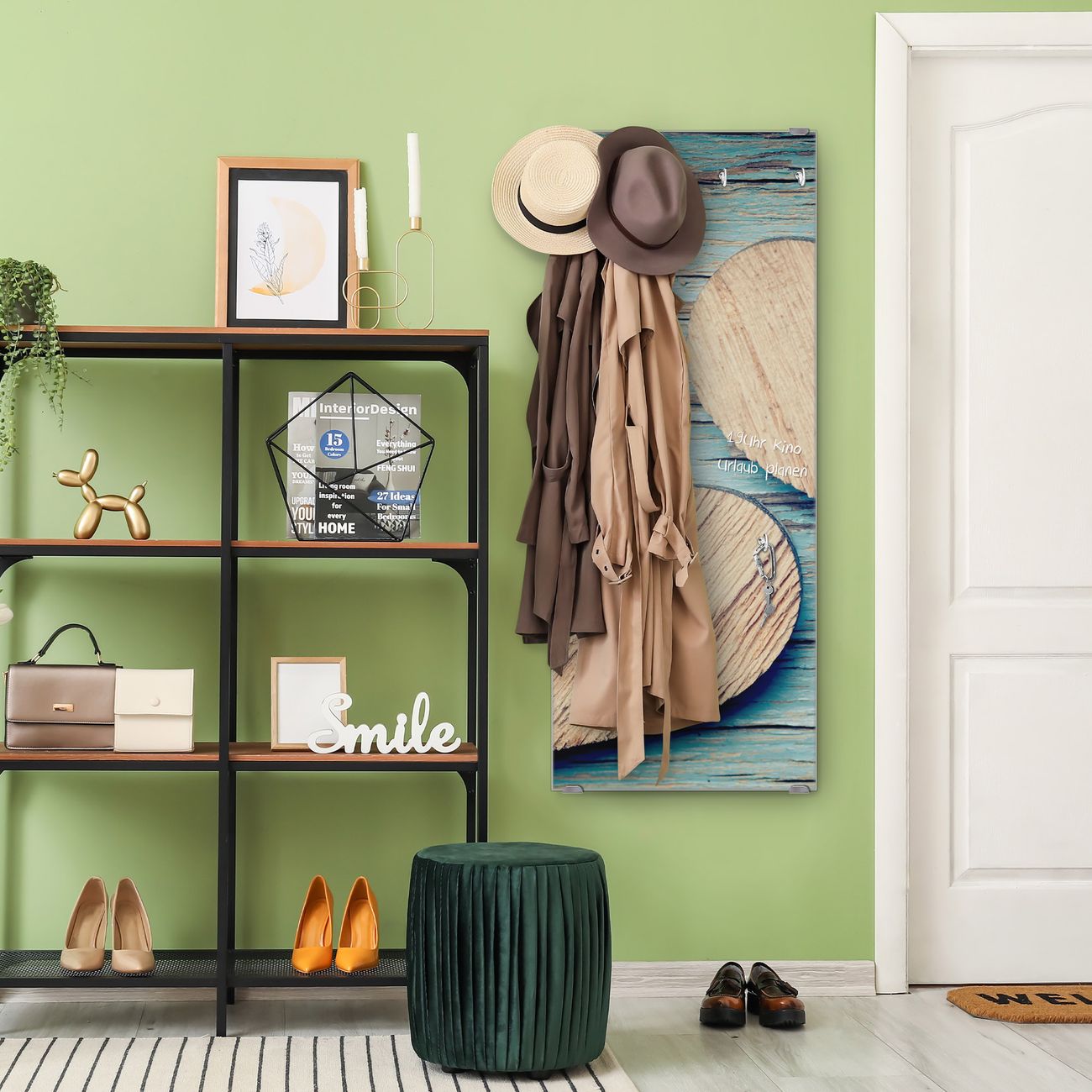 FUNKTION: Die banjado Wandgarderobe mit Motiv Holz Herzen ist Ihr täglicher Begleiter. Zuverlässig hängen hier Ihre Jacken und Mäntel griffbereit. Das Echtglas ist Ihr Paneel auch beschreibbar und wieder abwischbar. DESIGN: Sie erhalten eine Garderobenleiste aus elegantem Echtglas mit dem Farbbrillanten Motiv Holz Herzen hinterklebt. Das Design ist zeitlos klassisch, ohne dabei auf Funktionalität zu verzichten. Suchen Sie aus einer Vielzahl von Motiven das für Ihre Einrichtung Passende aus. DETAILS: Die Flurgarderobe besteht aus 4mm gehärtetem Sicherheitsglas. Sie ist 50cm breit, 125cm hoch und 6cm tief. Die Garderobenhaken zur Selbstmontage präsentieren sich in Edelstahl-Optik, ebenso die Abstandshalter für die Wandmontage. Ihre neue Garderobe ist sofort einsatzbereit. NUTZEN: Ihre neue Garderobe hält nicht nur zuverlässig Ihre Kleidung, sie ist auch optisch ein Blickfang. Durch das Glas können Sie an der Garderobe mit wasserlöslichen Kreidestiften oder Whiteboard-Markern auch Nachrichten hinterlassen. BANJADO: Wir sind ein kleines kreatives Team aus Sachsen und entwickeln Produkte die Design und Funktionalität verbinden sollen. Viel Freude mit Ihrer neuen Garderobe wünscht das banjado-Team!