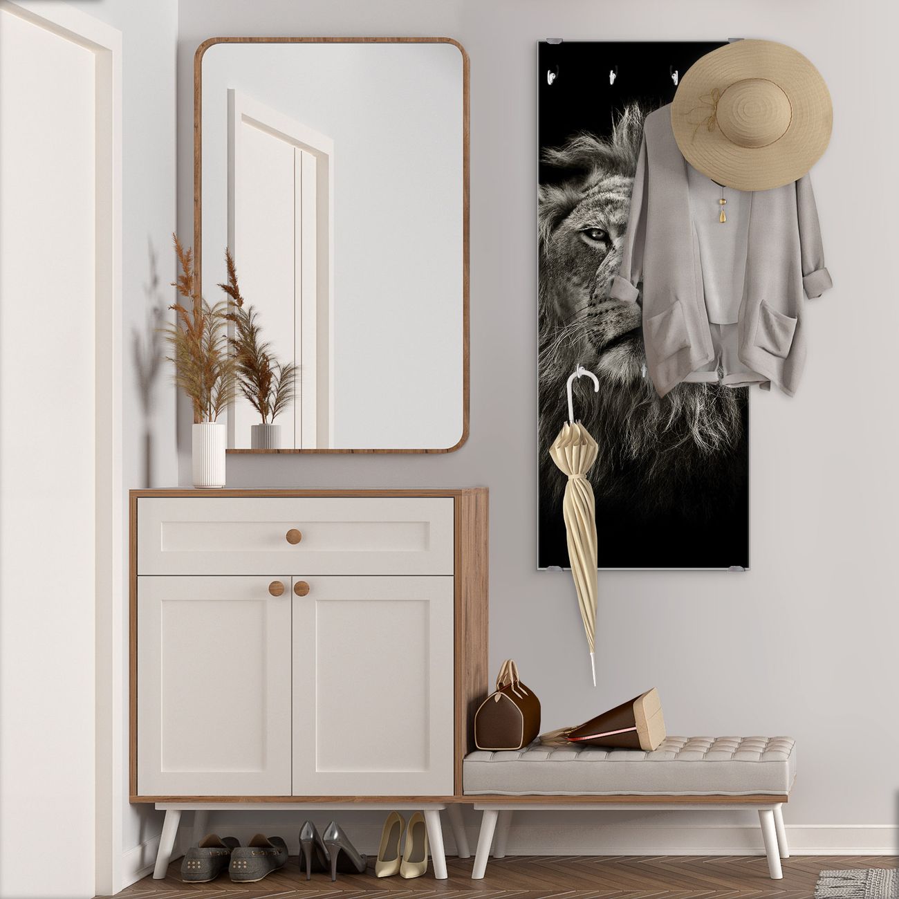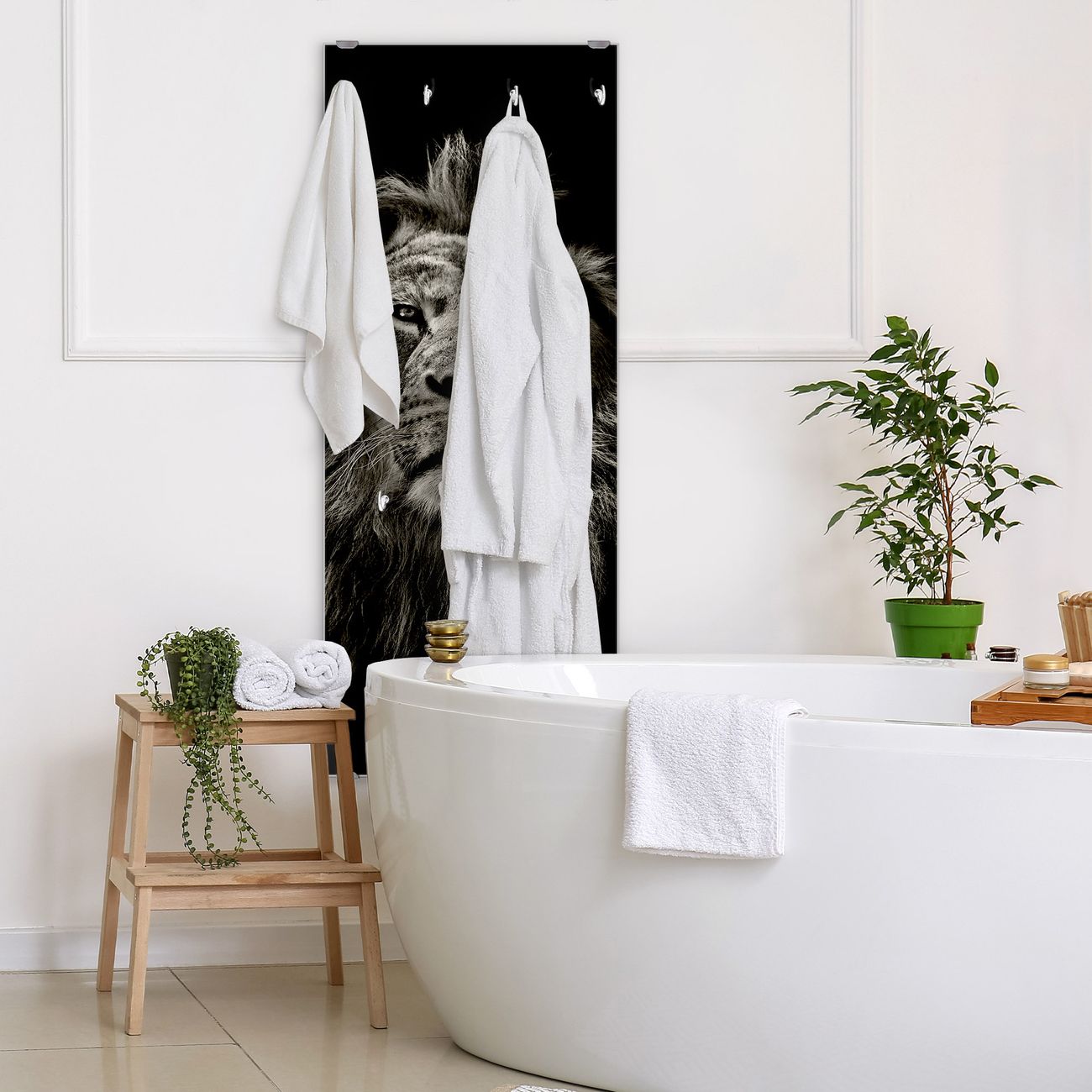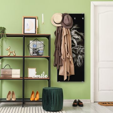 FUNKTION: Die banjado Wandgarderobe mit Motiv Löwe Porträt ist Ihr täglicher Begleiter. Zuverlässig hängen hier Ihre Jacken und Mäntel griffbereit. Das Echtglas ist Ihr Paneel auch beschreibbar und wieder abwischbar. DESIGN: Sie erhalten eine Garderobenleiste aus elegantem Echtglas mit dem Farbbrillanten Motiv Löwe Porträt hinterklebt. Das Design ist zeitlos klassisch, ohne dabei auf Funktionalität zu verzichten. Suchen Sie aus einer Vielzahl von Motiven das für Ihre Einrichtung Passende aus. DETAILS: Die Flurgarderobe besteht aus 4mm gehärtetem Sicherheitsglas. Sie ist 50cm breit, 125cm hoch und 6cm tief. Die Garderobenhaken zur Selbstmontage präsentieren sich in Edelstahl-Optik, ebenso die Abstandshalter für die Wandmontage. Ihre neue Garderobe ist sofort einsatzbereit. NUTZEN: Ihre neue Garderobe hält nicht nur zuverlässig Ihre Kleidung, sie ist auch optisch ein Blickfang. Durch das Glas können Sie an der Garderobe mit wasserlöslichen Kreidestiften oder Whiteboard-Markern auch Nachrichten hinterlassen. BANJADO: Wir sind ein kleines kreatives Team aus Sachsen und entwickeln Produkte die Design und Funktionalität verbinden sollen. Viel Freude mit Ihrer neuen Garderobe wünscht das banjado-Team!