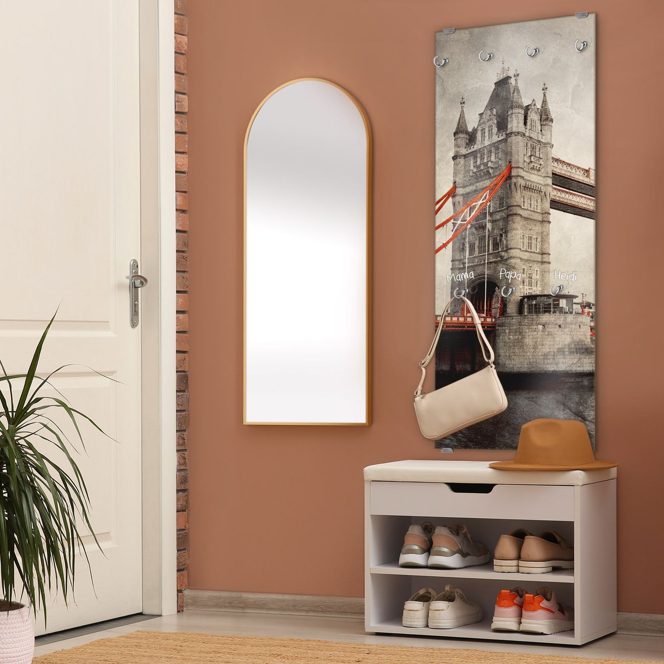 FUNKTION: Die banjado Wandgarderobe mit Motiv London Bridge ist Ihr täglicher Begleiter. Zuverlässig hängen hier Ihre Jacken und Mäntel griffbereit. Das Echtglas ist Ihr Paneel auch beschreibbar und wieder abwischbar. DESIGN: Sie erhalten eine Garderobenleiste aus elegantem Echtglas mit dem Farbbrillanten Motiv London Bridge hinterklebt. Das Design ist zeitlos klassisch, ohne dabei auf Funktionalität zu verzichten. Suchen Sie aus einer Vielzahl von Motiven das für Ihre Einrichtung Passende aus. DETAILS: Die Flurgarderobe besteht aus 4mm gehärtetem Sicherheitsglas. Sie ist 50cm breit, 125cm hoch und 6cm tief. Die Garderobenhaken zur Selbstmontage präsentieren sich in Edelstahl-Optik, ebenso die Abstandshalter für die Wandmontage. Ihre neue Garderobe ist sofort einsatzbereit. NUTZEN: Ihre neue Garderobe hält nicht nur zuverlässig Ihre Kleidung, sie ist auch optisch ein Blickfang. Durch das Glas können Sie an der Garderobe mit wasserlöslichen Kreidestiften oder Whiteboard-Markern auch Nachrichten hinterlassen. BANJADO: Wir sind ein kleines kreatives Team aus Sachsen und entwickeln Produkte die Design und Funktionalität verbinden sollen. Viel Freude mit Ihrer neuen Garderobe wünscht das banjado-Team!