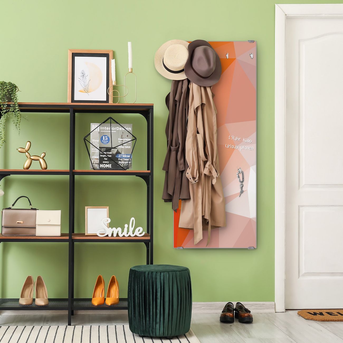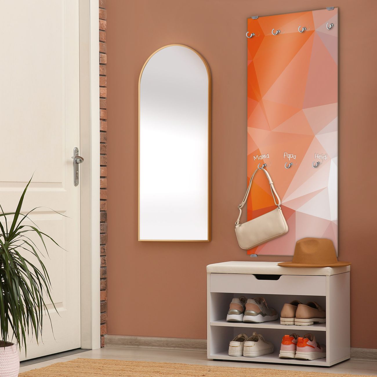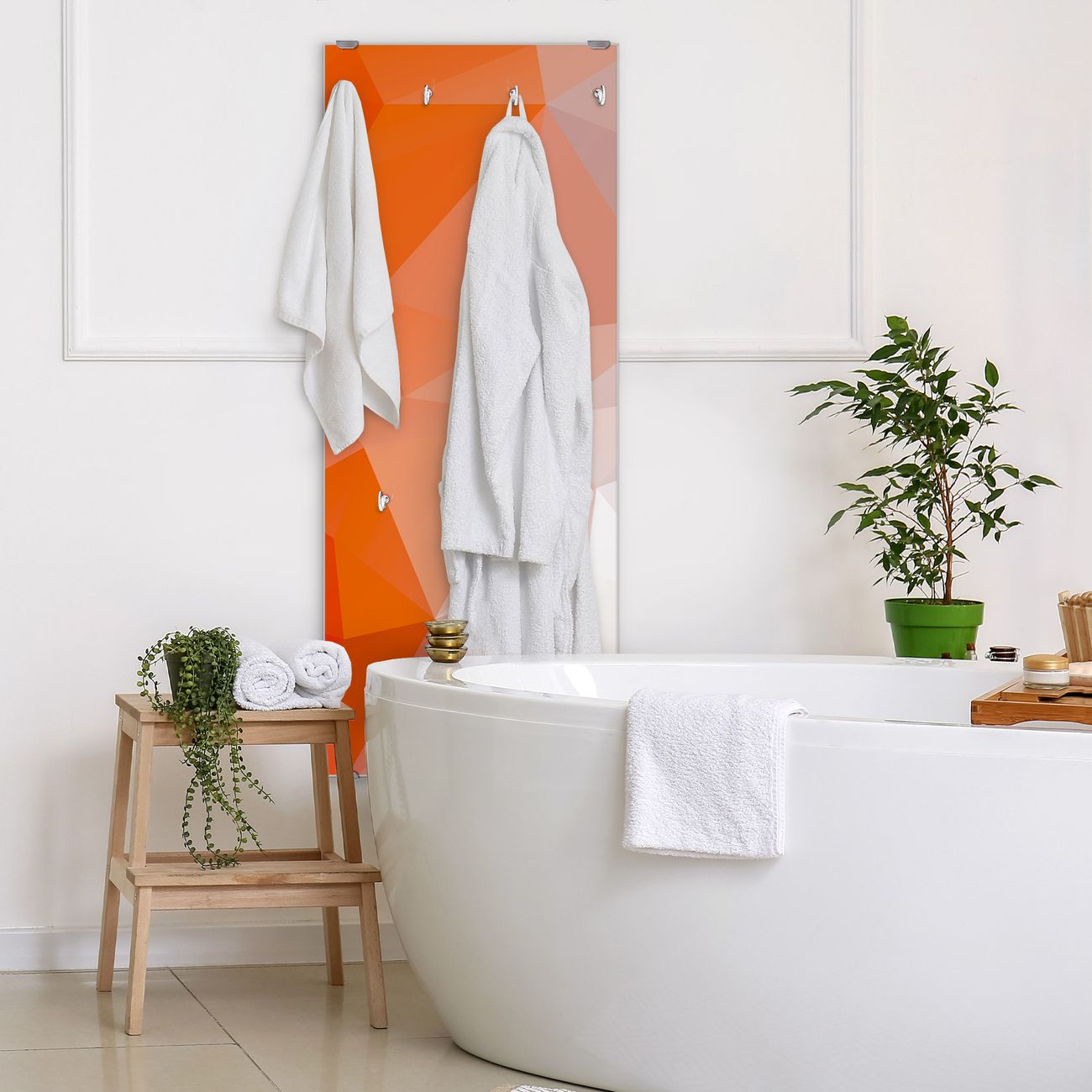 FUNKTION: Die banjado Wandgarderobe mit Motiv Orange Polygon ist Ihr täglicher Begleiter. Zuverlässig hängen hier Ihre Jacken und Mäntel griffbereit. Das Echtglas ist Ihr Paneel auch beschreibbar und wieder abwischbar. DESIGN: Sie erhalten eine Garderobenleiste aus elegantem Echtglas mit dem Farbbrillanten Motiv Orange Polygon hinterklebt. Das Design ist zeitlos klassisch, ohne dabei auf Funktionalität zu verzichten. Suchen Sie aus einer Vielzahl von Motiven das für Ihre Einrichtung Passende aus. DETAILS: Die Flurgarderobe besteht aus 4mm gehärtetem Sicherheitsglas. Sie ist 50cm breit, 125cm hoch und 6cm tief. Die Garderobenhaken zur Selbstmontage präsentieren sich in Edelstahl-Optik, ebenso die Abstandshalter für die Wandmontage. Ihre neue Garderobe ist sofort einsatzbereit. NUTZEN: Ihre neue Garderobe hält nicht nur zuverlässig Ihre Kleidung, sie ist auch optisch ein Blickfang. Durch das Glas können Sie an der Garderobe mit wasserlöslichen Kreidestiften oder Whiteboard-Markern auch Nachrichten hinterlassen. BANJADO: Wir sind ein kleines kreatives Team aus Sachsen und entwickeln Produkte die Design und Funktionalität verbinden sollen. Viel Freude mit Ihrer neuen Garderobe wünscht das banjado-Team!