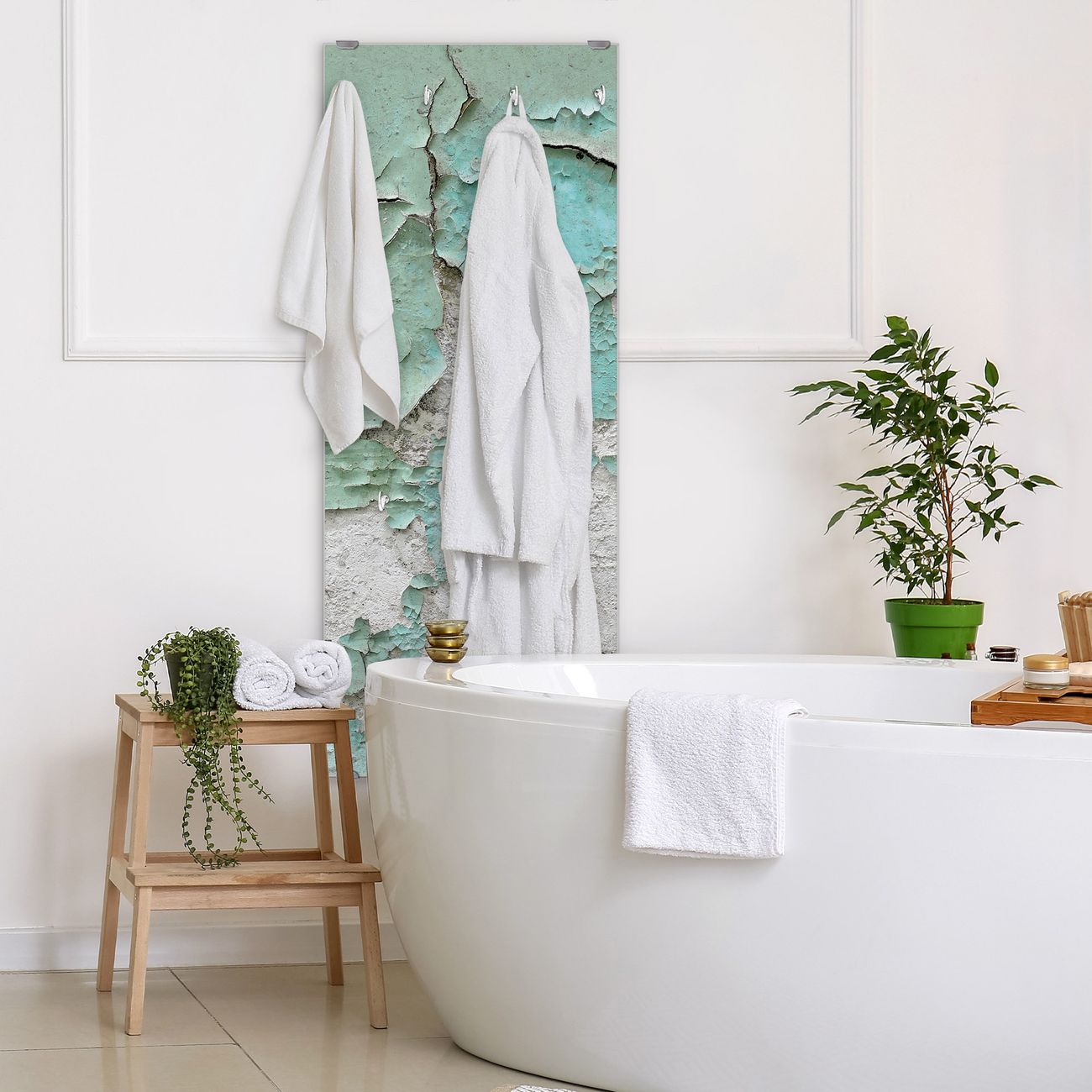 FUNKTION: Die banjado Wandgarderobe mit Motiv Patina Mint ist Ihr täglicher Begleiter. Zuverlässig hängen hier Ihre Jacken und Mäntel griffbereit. Das Echtglas ist Ihr Paneel auch beschreibbar und wieder abwischbar. DESIGN: Sie erhalten eine Garderobenleiste aus elegantem Echtglas mit dem Farbbrillanten Motiv Patina Mint hinterklebt. Das Design ist zeitlos klassisch, ohne dabei auf Funktionalität zu verzichten. Suchen Sie aus einer Vielzahl von Motiven das für Ihre Einrichtung Passende aus. DETAILS: Die Flurgarderobe besteht aus 4mm gehärtetem Sicherheitsglas. Sie ist 50cm breit, 125cm hoch und 6cm tief. Die Garderobenhaken zur Selbstmontage präsentieren sich in Edelstahl-Optik, ebenso die Abstandshalter für die Wandmontage. Ihre neue Garderobe ist sofort einsatzbereit. NUTZEN: Ihre neue Garderobe hält nicht nur zuverlässig Ihre Kleidung, sie ist auch optisch ein Blickfang. Durch das Glas können Sie an der Garderobe mit wasserlöslichen Kreidestiften oder Whiteboard-Markern auch Nachrichten hinterlassen. BANJADO: Wir sind ein kleines kreatives Team aus Sachsen und entwickeln Produkte die Design und Funktionalität verbinden sollen. Viel Freude mit Ihrer neuen Garderobe wünscht das banjado-Team!