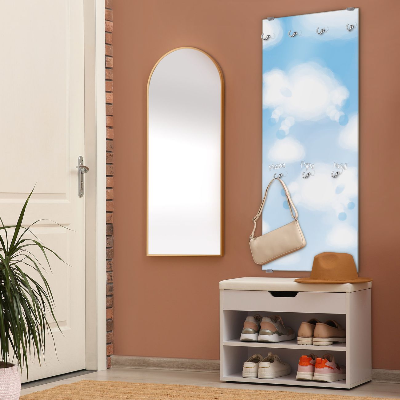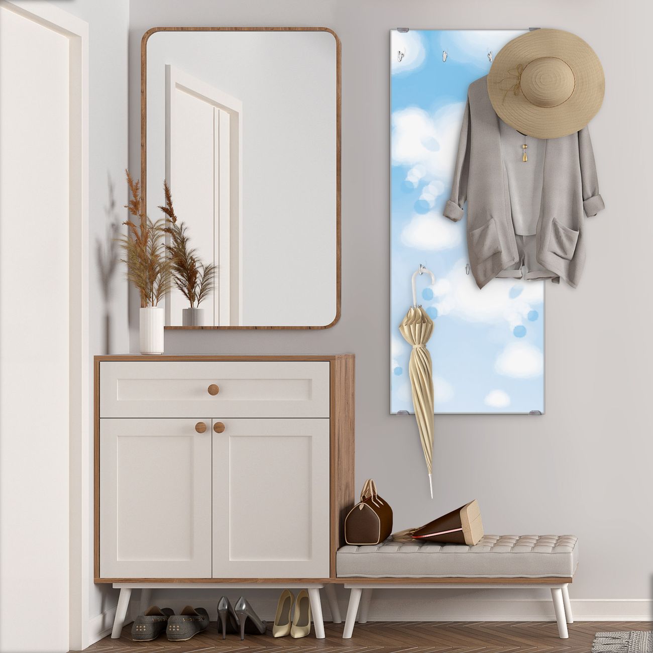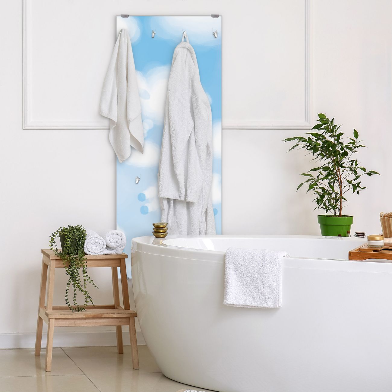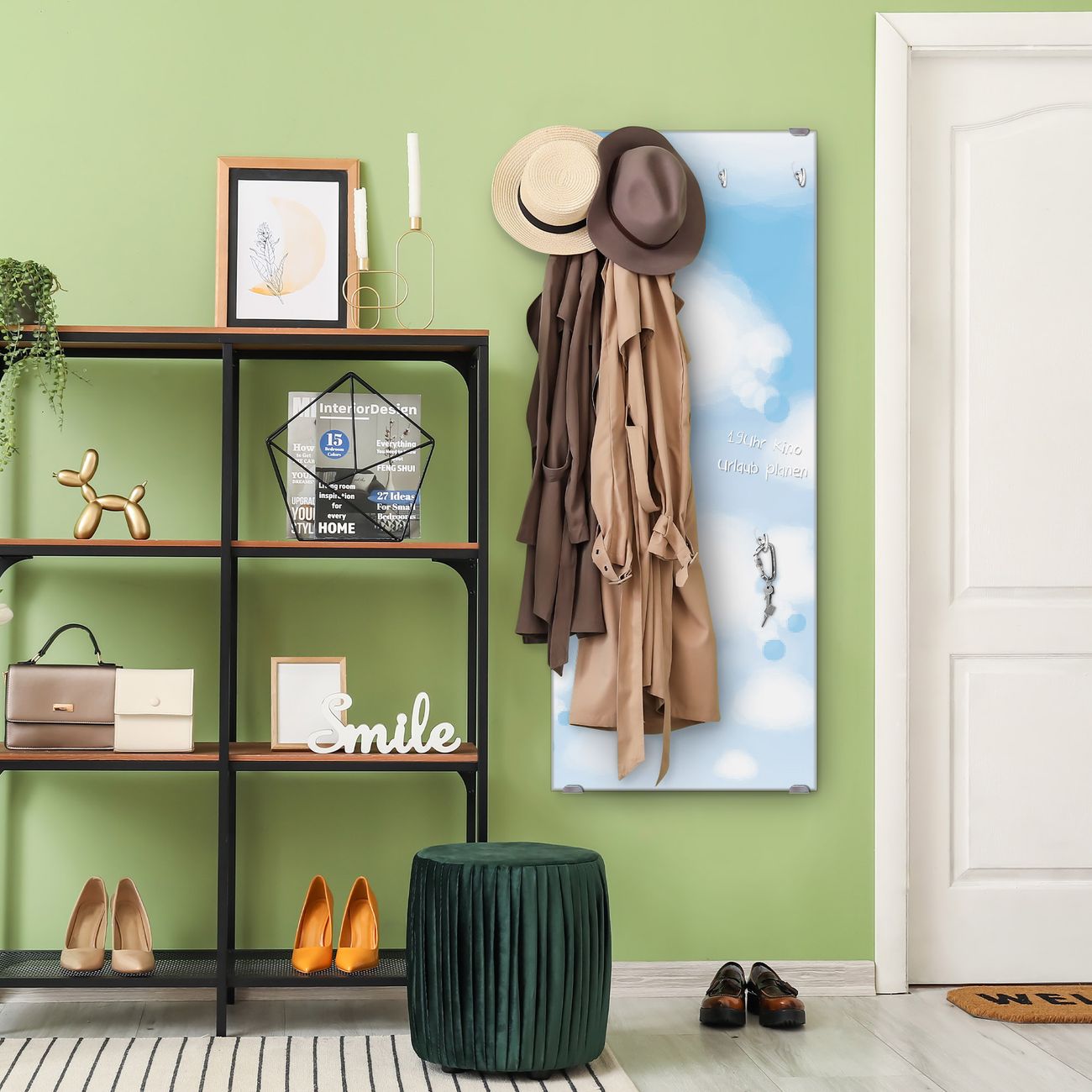 FUNKTION: Die banjado Wandgarderobe mit Motiv Schäfchenwolken ist Ihr täglicher Begleiter. Zuverlässig hängen hier Ihre Jacken und Mäntel griffbereit. Das Echtglas ist Ihr Paneel auch beschreibbar und wieder abwischbar. DESIGN: Sie erhalten eine Garderobenleiste aus elegantem Echtglas mit dem Farbbrillanten Motiv Schäfchenwolken hinterklebt. Das Design ist zeitlos klassisch, ohne dabei auf Funktionalität zu verzichten. Suchen Sie aus einer Vielzahl von Motiven das für Ihre Einrichtung Passende aus. DETAILS: Die Flurgarderobe besteht aus 4mm gehärtetem Sicherheitsglas. Sie ist 50cm breit, 125cm hoch und 6cm tief. Die Garderobenhaken zur Selbstmontage präsentieren sich in Edelstahl-Optik, ebenso die Abstandshalter für die Wandmontage. Ihre neue Garderobe ist sofort einsatzbereit. NUTZEN: Ihre neue Garderobe hält nicht nur zuverlässig Ihre Kleidung, sie ist auch optisch ein Blickfang. Durch das Glas können Sie an der Garderobe mit wasserlöslichen Kreidestiften oder Whiteboard-Markern auch Nachrichten hinterlassen. BANJADO: Wir sind ein kleines kreatives Team aus Sachsen und entwickeln Produkte die Design und Funktionalität verbinden sollen. Viel Freude mit Ihrer neuen Garderobe wünscht das banjado-Team!