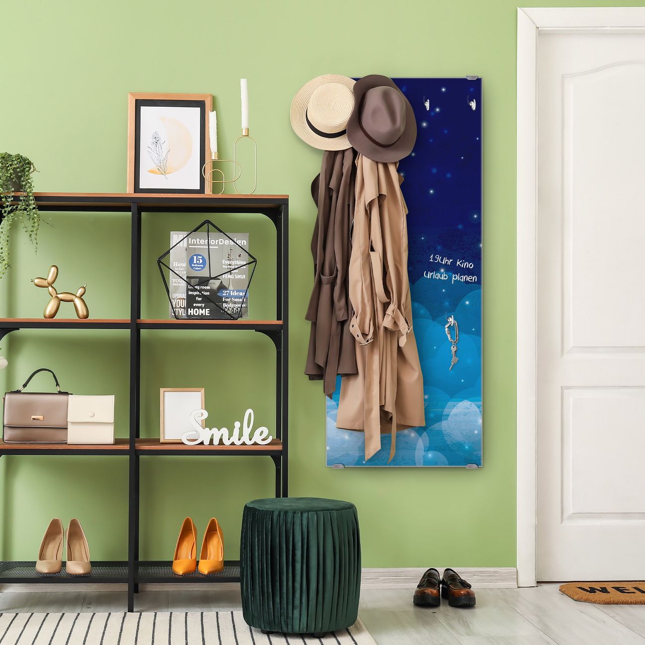 FUNKTION: Die banjado Wandgarderobe mit Motiv Sternenhimmel 2 ist Ihr täglicher Begleiter. Zuverlässig hängen hier Ihre Jacken und Mäntel griffbereit. Das Echtglas ist Ihr Paneel auch beschreibbar und wieder abwischbar. DESIGN: Sie erhalten eine Garderobenleiste aus elegantem Echtglas mit dem Farbbrillanten Motiv Sternenhimmel 2 hinterklebt. Das Design ist zeitlos klassisch, ohne dabei auf Funktionalität zu verzichten. Suchen Sie aus einer Vielzahl von Motiven das für Ihre Einrichtung Passende aus. DETAILS: Die Flurgarderobe besteht aus 4mm gehärtetem Sicherheitsglas. Sie ist 50cm breit, 125cm hoch und 6cm tief. Die Garderobenhaken zur Selbstmontage präsentieren sich in Edelstahl-Optik, ebenso die Abstandshalter für die Wandmontage. Ihre neue Garderobe ist sofort einsatzbereit. NUTZEN: Ihre neue Garderobe hält nicht nur zuverlässig Ihre Kleidung, sie ist auch optisch ein Blickfang. Durch das Glas können Sie an der Garderobe mit wasserlöslichen Kreidestiften oder Whiteboard-Markern auch Nachrichten hinterlassen. BANJADO: Wir sind ein kleines kreatives Team aus Sachsen und entwickeln Produkte die Design und Funktionalität verbinden sollen. Viel Freude mit Ihrer neuen Garderobe wünscht das banjado-Team!