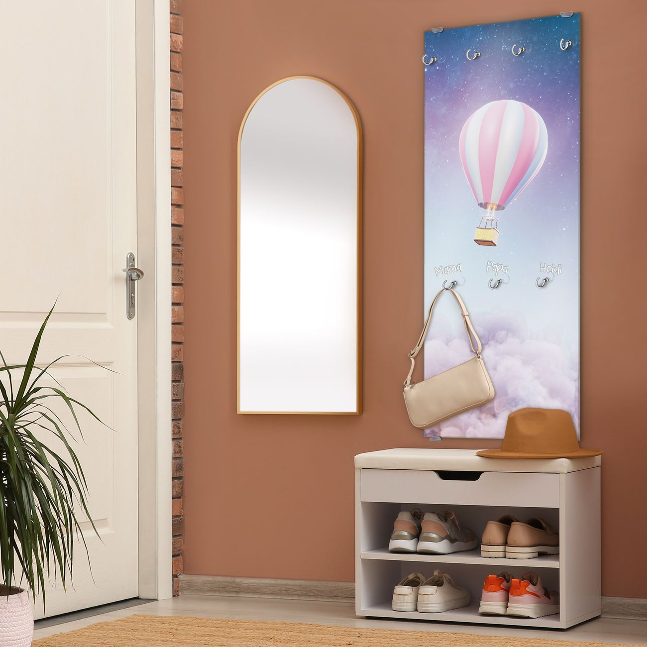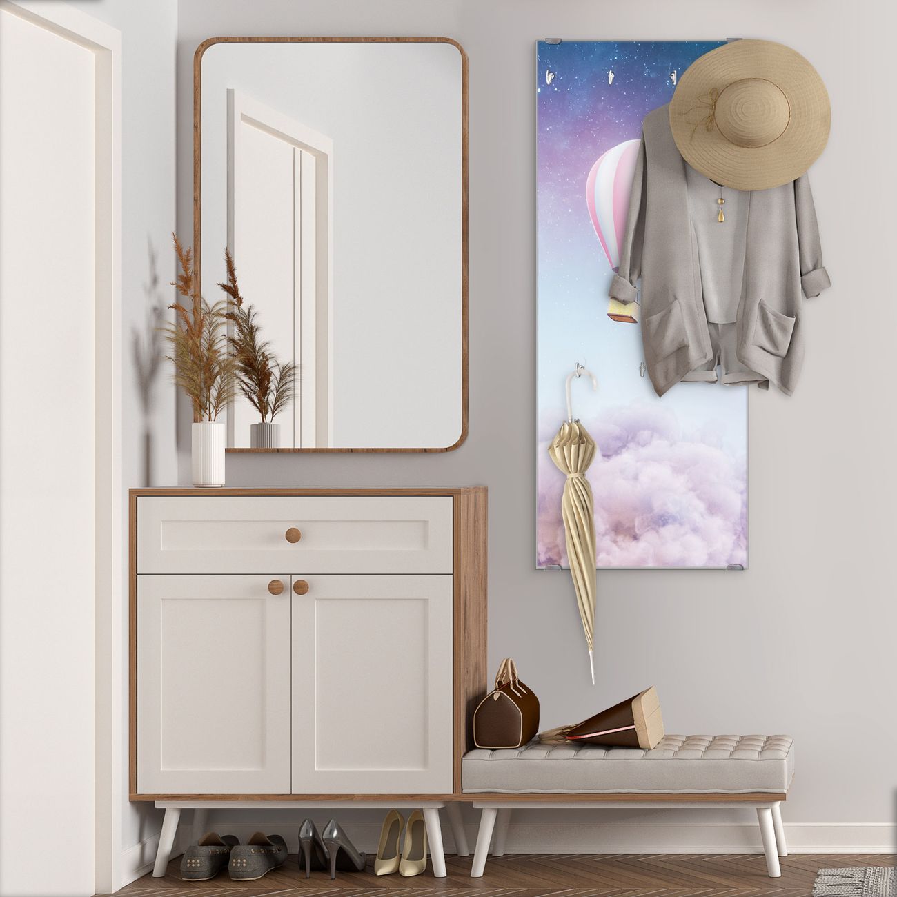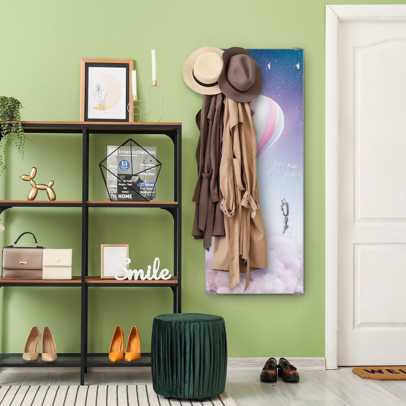 FUNKTION: Die banjado Wandgarderobe mit Motiv Über den Wolken ist Ihr täglicher Begleiter. Zuverlässig hängen hier Ihre Jacken und Mäntel griffbereit. Das Echtglas ist Ihr Paneel auch beschreibbar und wieder abwischbar. DESIGN: Sie erhalten eine Garderobenleiste aus elegantem Echtglas mit dem Farbbrillanten Motiv Über den Wolken hinterklebt. Das Design ist zeitlos klassisch, ohne dabei auf Funktionalität zu verzichten. Suchen Sie aus einer Vielzahl von Motiven das für Ihre Einrichtung Passende aus. DETAILS: Die Flurgarderobe besteht aus 4mm gehärtetem Sicherheitsglas. Sie ist 50cm breit, 125cm hoch und 6cm tief. Die Garderobenhaken zur Selbstmontage präsentieren sich in Edelstahl-Optik, ebenso die Abstandshalter für die Wandmontage. Ihre neue Garderobe ist sofort einsatzbereit. NUTZEN: Ihre neue Garderobe hält nicht nur zuverlässig Ihre Kleidung, sie ist auch optisch ein Blickfang. Durch das Glas können Sie an der Garderobe mit wasserlöslichen Kreidestiften oder Whiteboard-Markern auch Nachrichten hinterlassen. BANJADO: Wir sind ein kleines kreatives Team aus Sachsen und entwickeln Produkte die Design und Funktionalität verbinden sollen. Viel Freude mit Ihrer neuen Garderobe wünscht das banjado-Team!