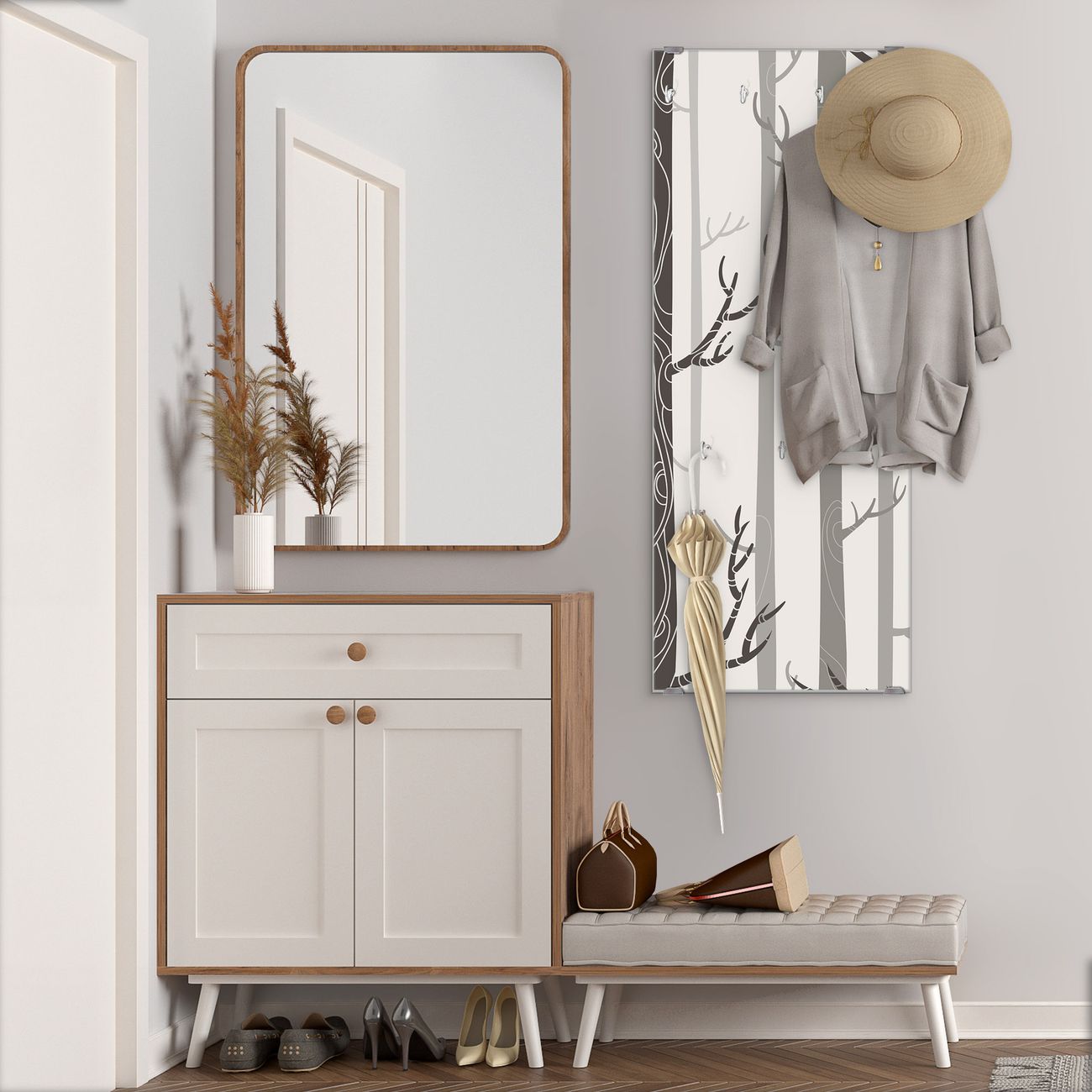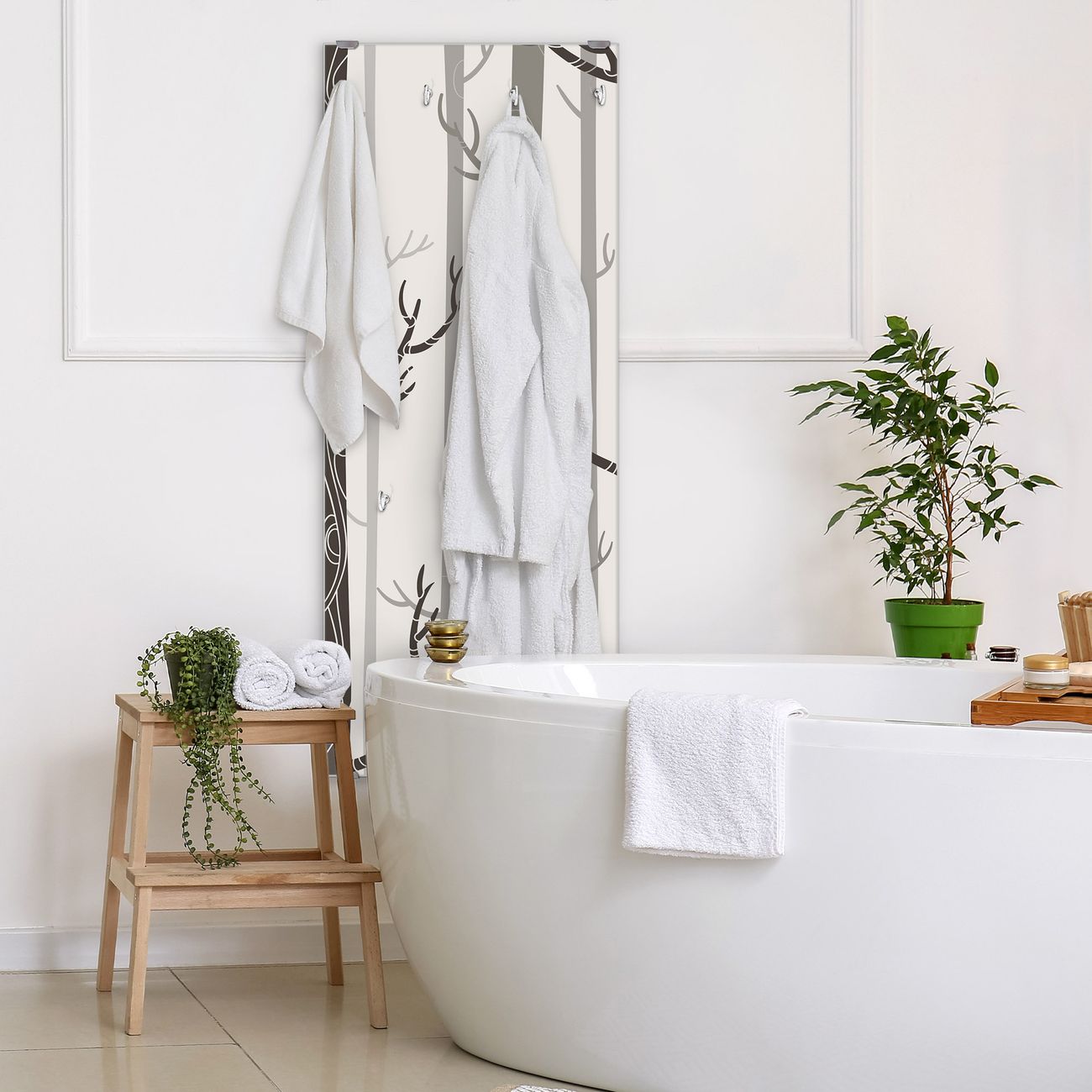 FUNKTION: Die banjado Wandgarderobe mit Motiv Wald ist Ihr täglicher Begleiter. Zuverlässig hängen hier Ihre Jacken und Mäntel griffbereit. Das Echtglas ist Ihr Paneel auch beschreibbar und wieder abwischbar. DESIGN: Sie erhalten eine Garderobenleiste aus elegantem Echtglas mit dem Farbbrillanten Motiv Wald hinterklebt. Das Design ist zeitlos klassisch, ohne dabei auf Funktionalität zu verzichten. Suchen Sie aus einer Vielzahl von Motiven das für Ihre Einrichtung Passende aus. DETAILS: Die Flurgarderobe besteht aus 4mm gehärtetem Sicherheitsglas. Sie ist 50cm breit, 125cm hoch und 6cm tief. Die Garderobenhaken zur Selbstmontage präsentieren sich in Edelstahl-Optik, ebenso die Abstandshalter für die Wandmontage. Ihre neue Garderobe ist sofort einsatzbereit. NUTZEN: Ihre neue Garderobe hält nicht nur zuverlässig Ihre Kleidung, sie ist auch optisch ein Blickfang. Durch das Glas können Sie an der Garderobe mit wasserlöslichen Kreidestiften oder Whiteboard-Markern auch Nachrichten hinterlassen. BANJADO: Wir sind ein kleines kreatives Team aus Sachsen und entwickeln Produkte die Design und Funktionalität verbinden sollen. Viel Freude mit Ihrer neuen Garderobe wünscht das banjado-Team!