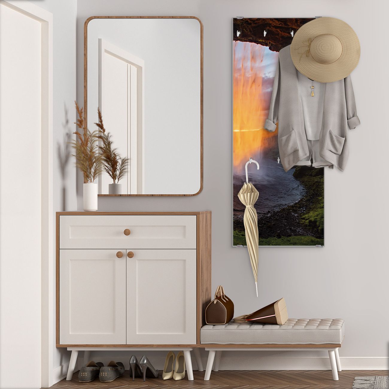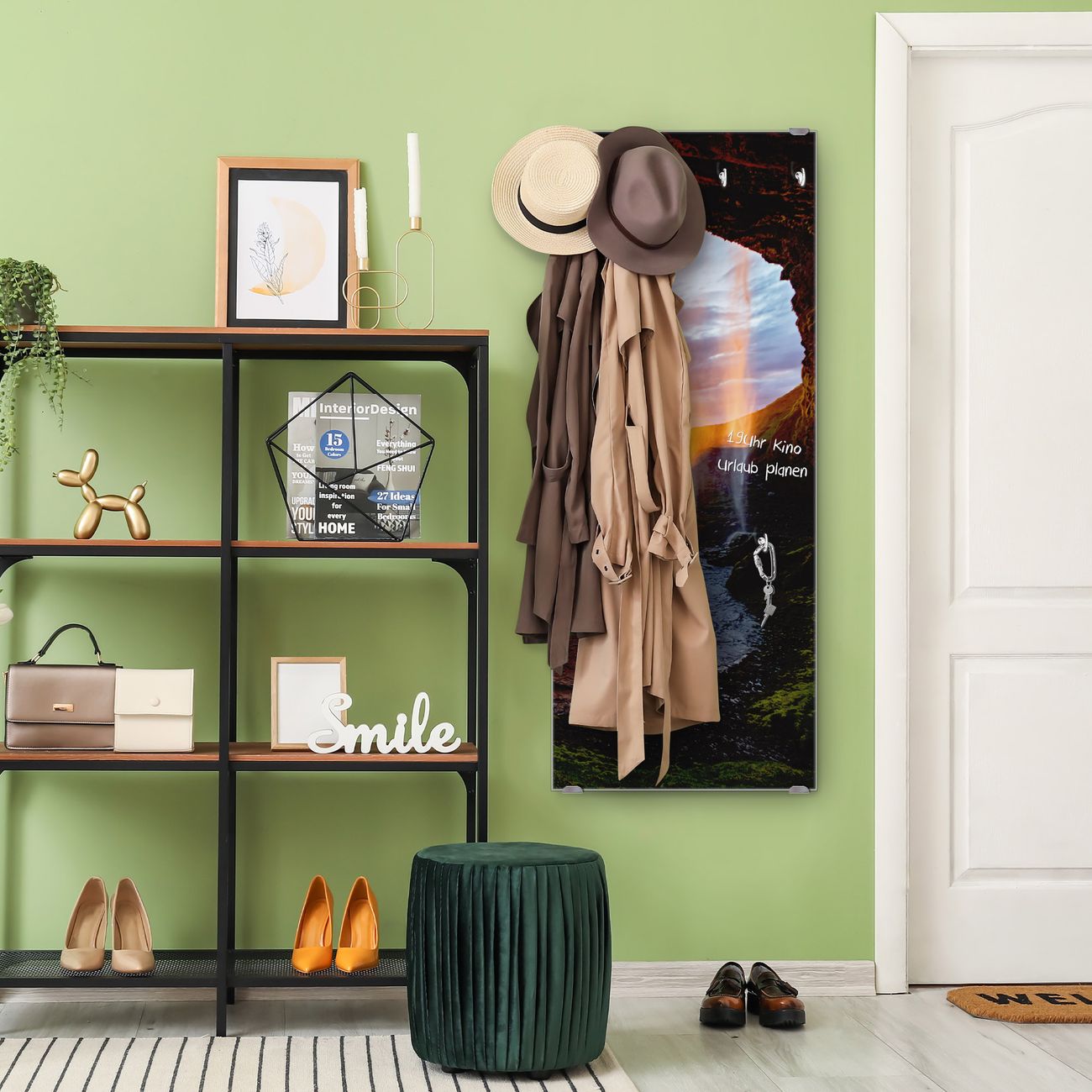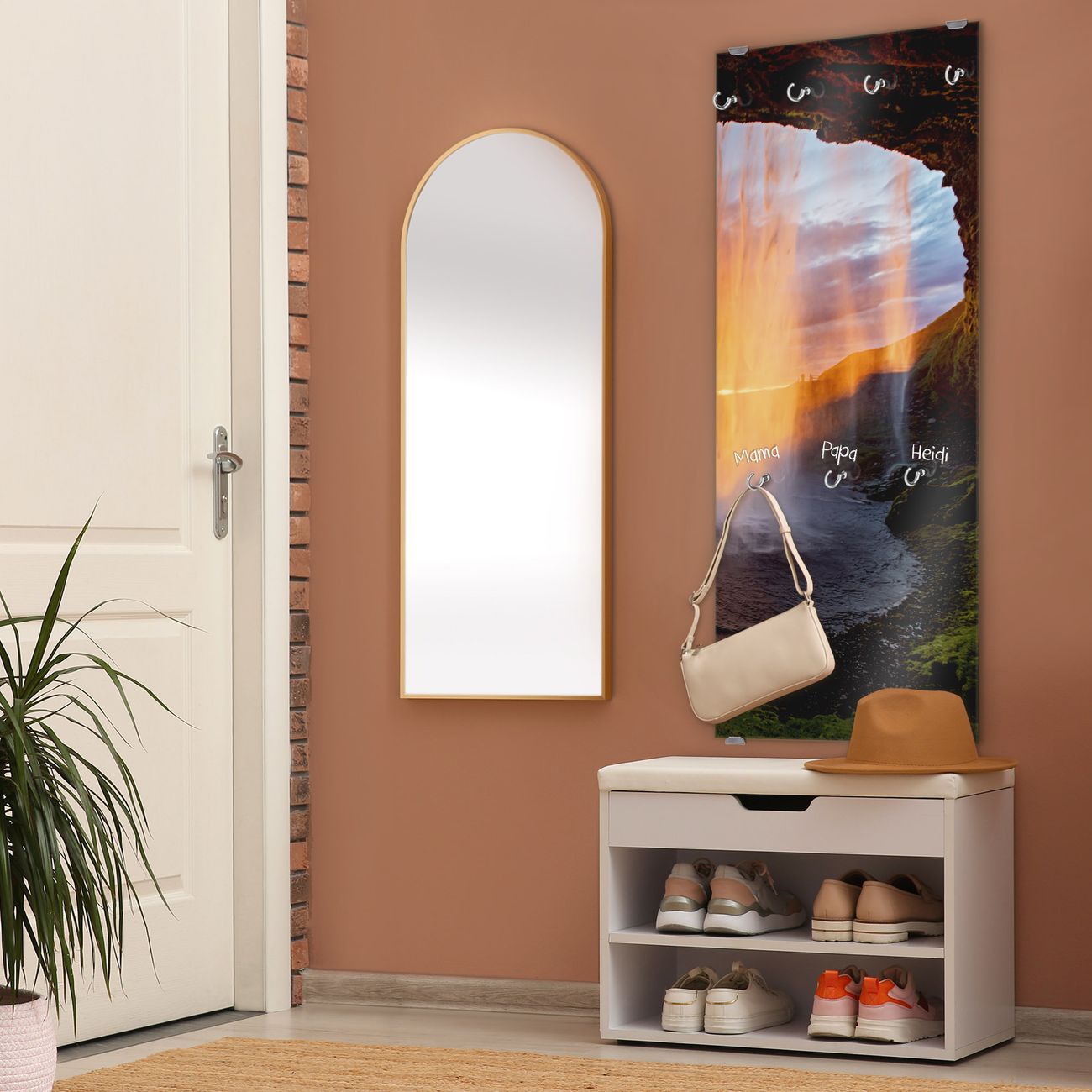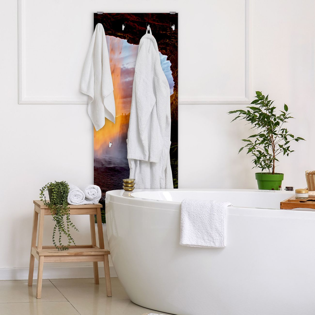FUNKTION: Die banjado Wandgarderobe mit Motiv Wasserfall im Sonnenlicht ist Ihr täglicher Begleiter. Zuverlässig hängen hier Ihre Jacken und Mäntel griffbereit. Das Echtglas ist Ihr Paneel auch beschreibbar und wieder abwischbar. DESIGN: Sie erhalten eine Garderobenleiste aus elegantem Echtglas mit dem Farbbrillanten Motiv Wasserfall im Sonnenlicht hinterklebt. Das Design ist zeitlos klassisch, ohne dabei auf Funktionalität zu verzichten. Suchen Sie aus einer Vielzahl von Motiven das für Ihre Einrichtung Passende aus. DETAILS: Die Flurgarderobe besteht aus 4mm gehärtetem Sicherheitsglas. Sie ist 50cm breit, 125cm hoch und 6cm tief. Die Garderobenhaken zur Selbstmontage präsentieren sich in Edelstahl-Optik, ebenso die Abstandshalter für die Wandmontage. Ihre neue Garderobe ist sofort einsatzbereit. NUTZEN: Ihre neue Garderobe hält nicht nur zuverlässig Ihre Kleidung, sie ist auch optisch ein Blickfang. Durch das Glas können Sie an der Garderobe mit wasserlöslichen Kreidestiften oder Whiteboard-Markern auch Nachrichten hinterlassen. BANJADO: Wir sind ein kleines kreatives Team aus Sachsen und entwickeln Produkte die Design und Funktionalität verbinden sollen. Viel Freude mit Ihrer neuen Garderobe wünscht das banjado-Team!