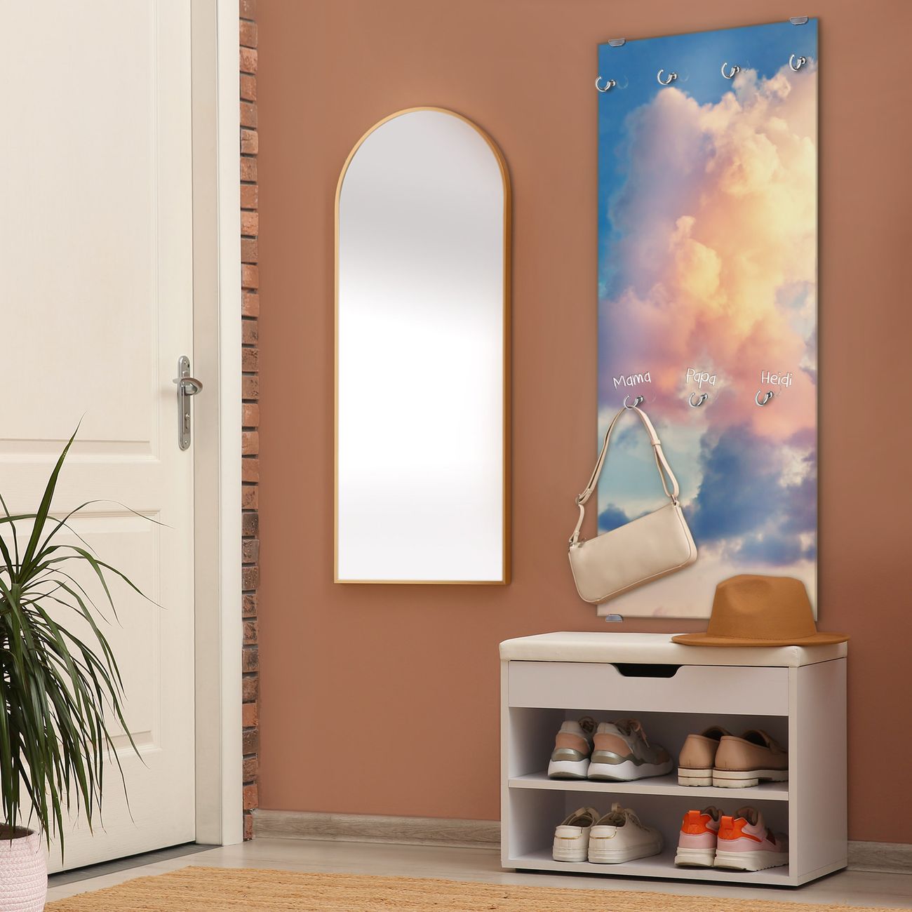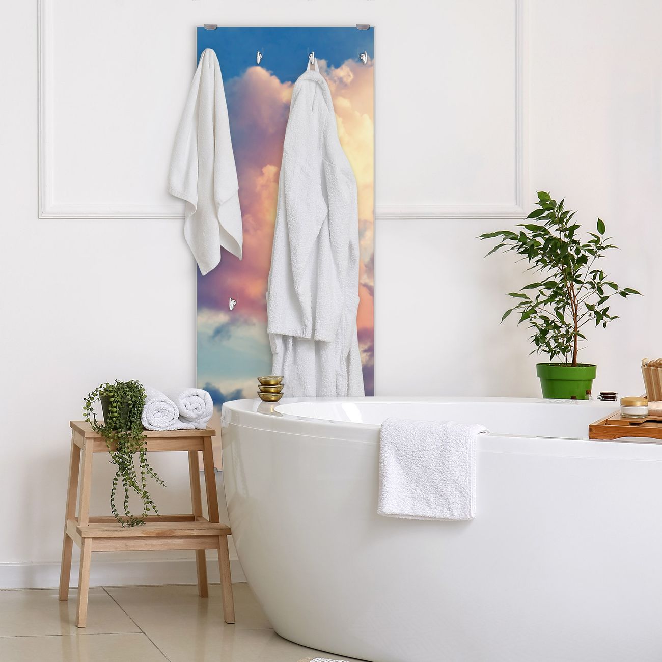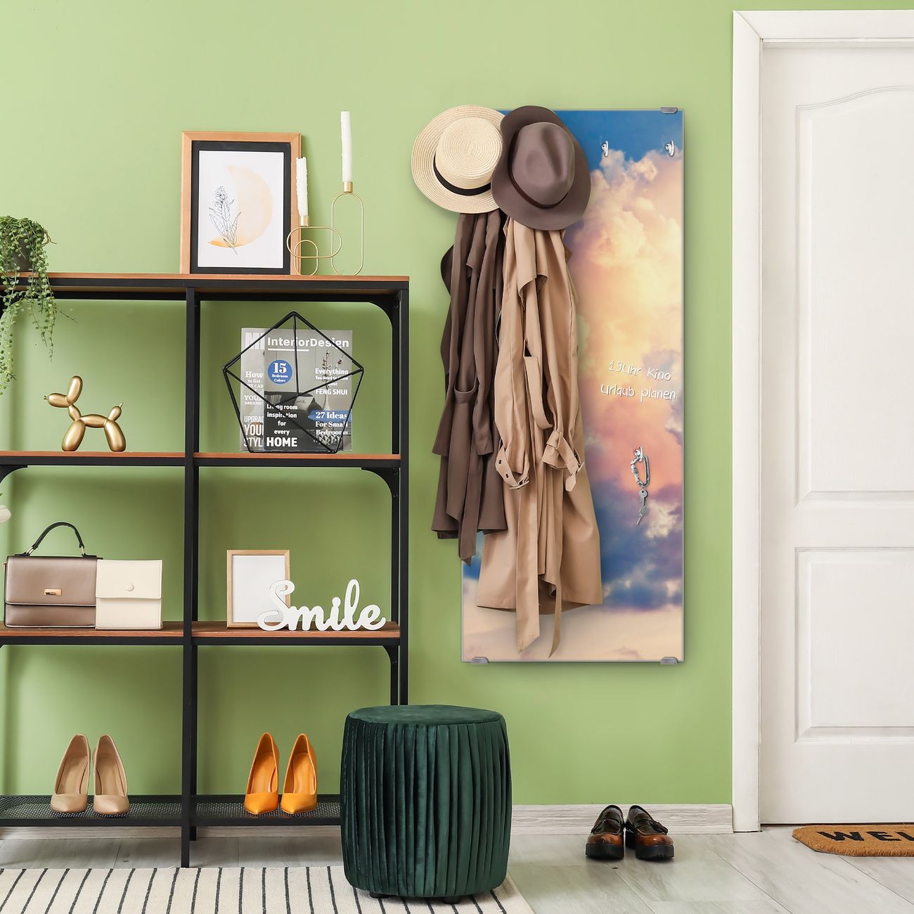 FUNKTION: Die banjado Wandgarderobe mit Motiv Wolken 10 ist Ihr täglicher Begleiter. Zuverlässig hängen hier Ihre Jacken und Mäntel griffbereit. Das Echtglas ist Ihr Paneel auch beschreibbar und wieder abwischbar. DESIGN: Sie erhalten eine Garderobenleiste aus elegantem Echtglas mit dem Farbbrillanten Motiv Wolken 10 hinterklebt. Das Design ist zeitlos klassisch, ohne dabei auf Funktionalität zu verzichten. Suchen Sie aus einer Vielzahl von Motiven das für Ihre Einrichtung Passende aus. DETAILS: Die Flurgarderobe besteht aus 4mm gehärtetem Sicherheitsglas. Sie ist 50cm breit, 125cm hoch und 6cm tief. Die Garderobenhaken zur Selbstmontage präsentieren sich in Edelstahl-Optik, ebenso die Abstandshalter für die Wandmontage. Ihre neue Garderobe ist sofort einsatzbereit. NUTZEN: Ihre neue Garderobe hält nicht nur zuverlässig Ihre Kleidung, sie ist auch optisch ein Blickfang. Durch das Glas können Sie an der Garderobe mit wasserlöslichen Kreidestiften oder Whiteboard-Markern auch Nachrichten hinterlassen. BANJADO: Wir sind ein kleines kreatives Team aus Sachsen und entwickeln Produkte die Design und Funktionalität verbinden sollen. Viel Freude mit Ihrer neuen Garderobe wünscht das banjado-Team!