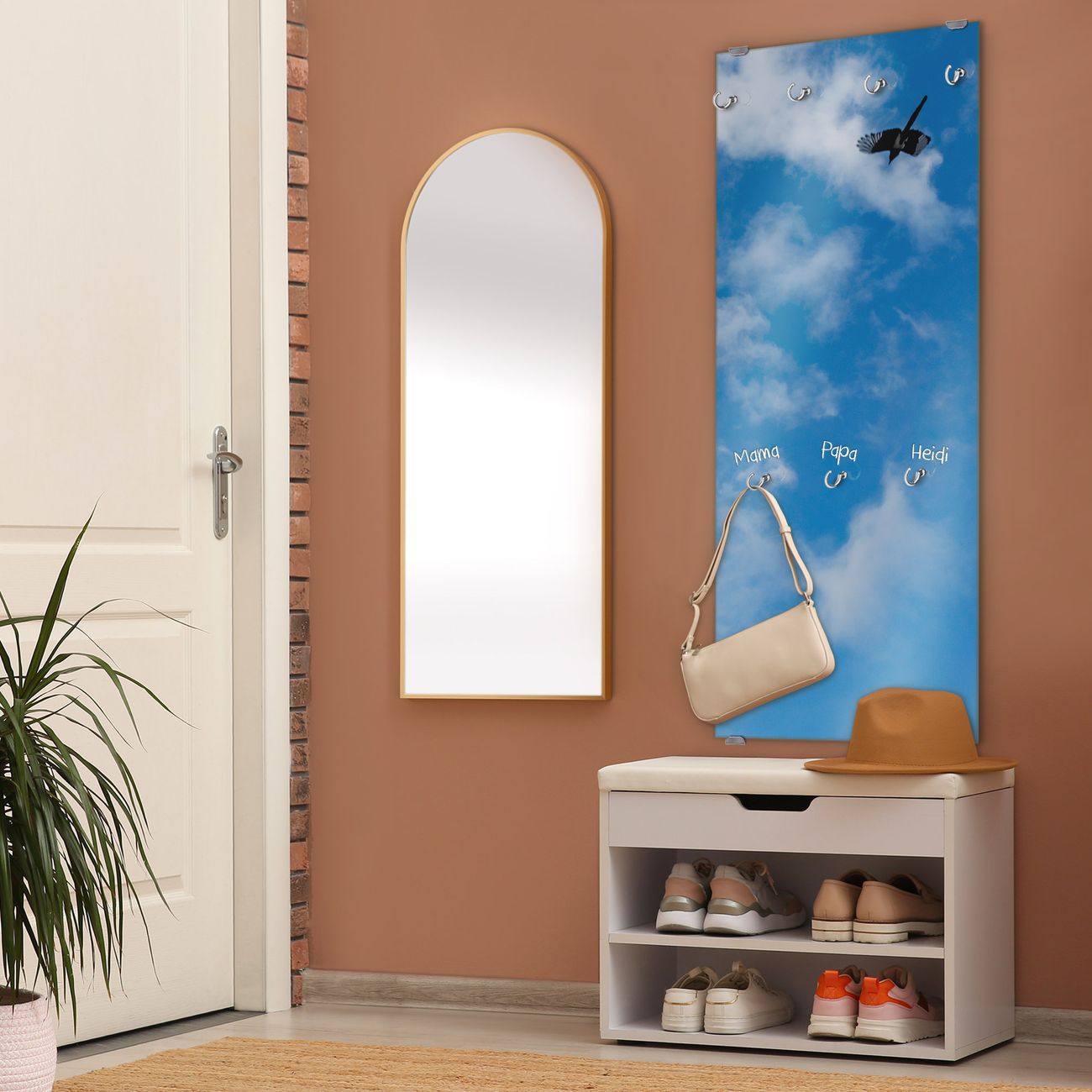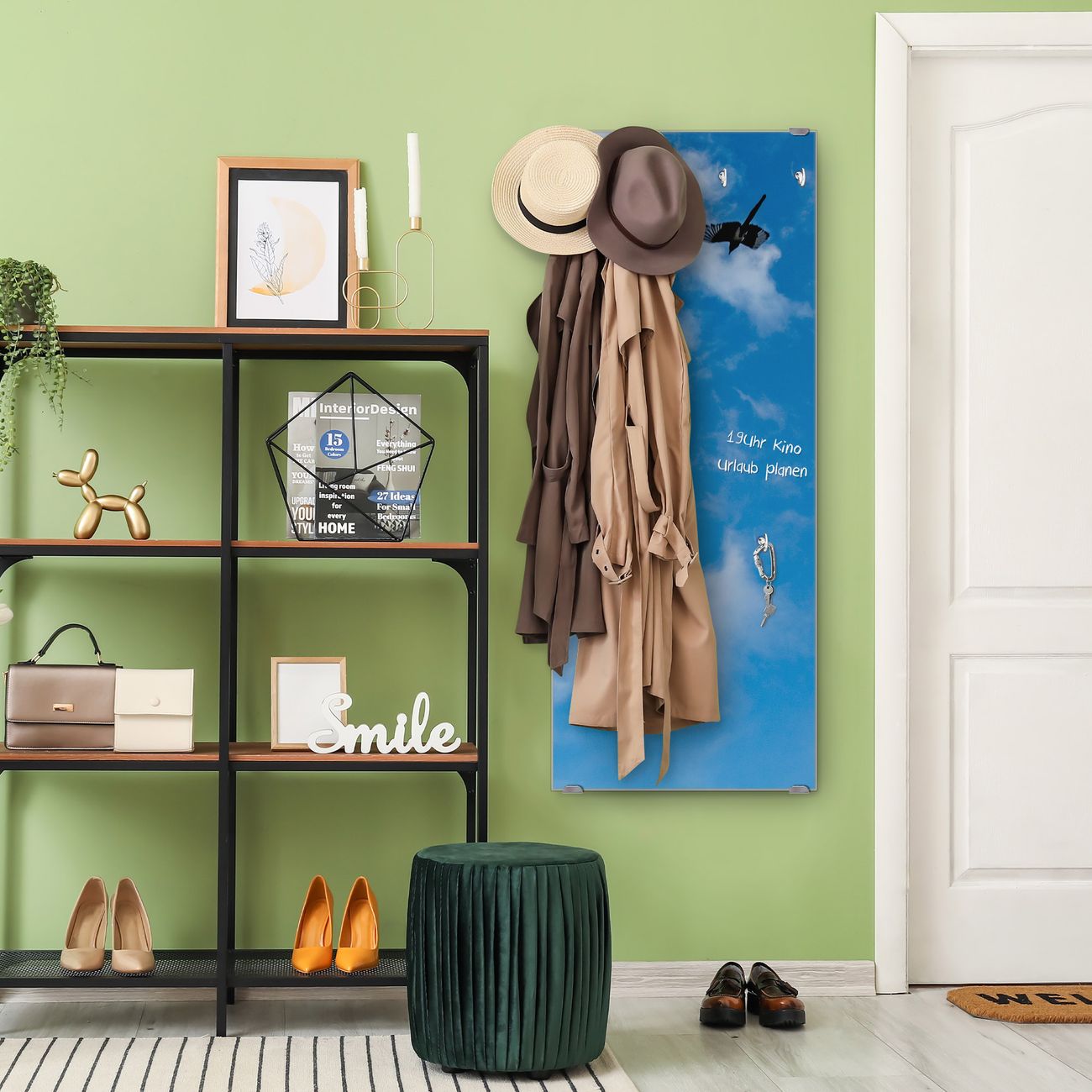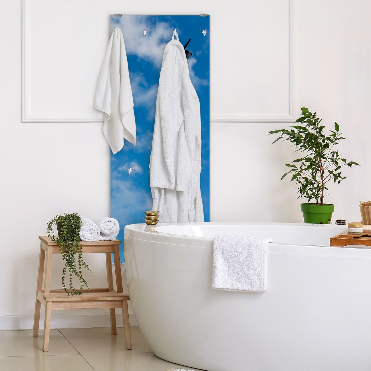 FUNKTION: Die banjado Wandgarderobe mit Motiv Wolken 4 ist Ihr täglicher Begleiter. Zuverlässig hängen hier Ihre Jacken und Mäntel griffbereit. Das Echtglas ist Ihr Paneel auch beschreibbar und wieder abwischbar. DESIGN: Sie erhalten eine Garderobenleiste aus elegantem Echtglas mit dem Farbbrillanten Motiv Wolken 4 hinterklebt. Das Design ist zeitlos klassisch, ohne dabei auf Funktionalität zu verzichten. Suchen Sie aus einer Vielzahl von Motiven das für Ihre Einrichtung Passende aus. DETAILS: Die Flurgarderobe besteht aus 4mm gehärtetem Sicherheitsglas. Sie ist 50cm breit, 125cm hoch und 6cm tief. Die Garderobenhaken zur Selbstmontage präsentieren sich in Edelstahl-Optik, ebenso die Abstandshalter für die Wandmontage. Ihre neue Garderobe ist sofort einsatzbereit. NUTZEN: Ihre neue Garderobe hält nicht nur zuverlässig Ihre Kleidung, sie ist auch optisch ein Blickfang. Durch das Glas können Sie an der Garderobe mit wasserlöslichen Kreidestiften oder Whiteboard-Markern auch Nachrichten hinterlassen. BANJADO: Wir sind ein kleines kreatives Team aus Sachsen und entwickeln Produkte die Design und Funktionalität verbinden sollen. Viel Freude mit Ihrer neuen Garderobe wünscht das banjado-Team!